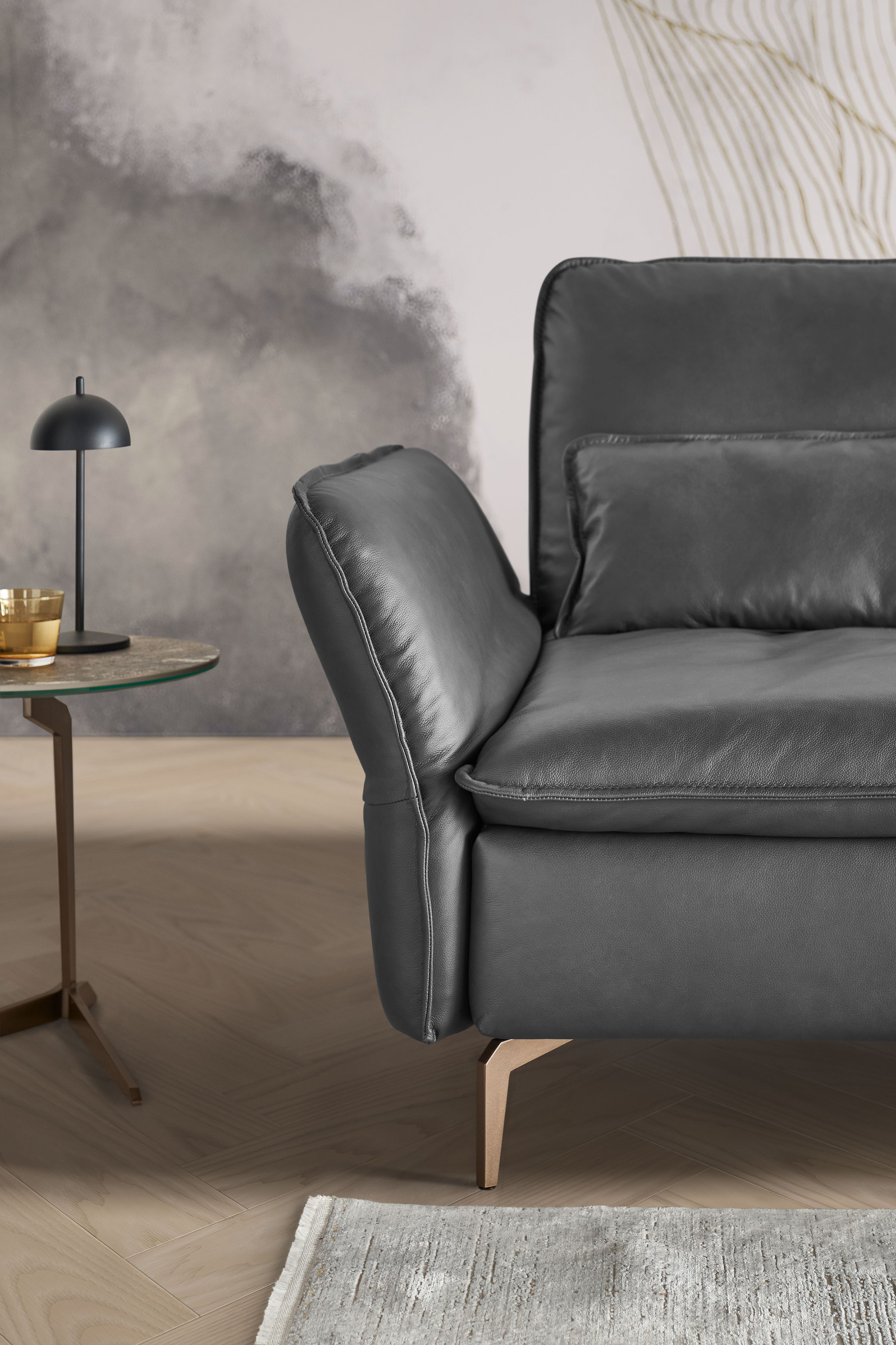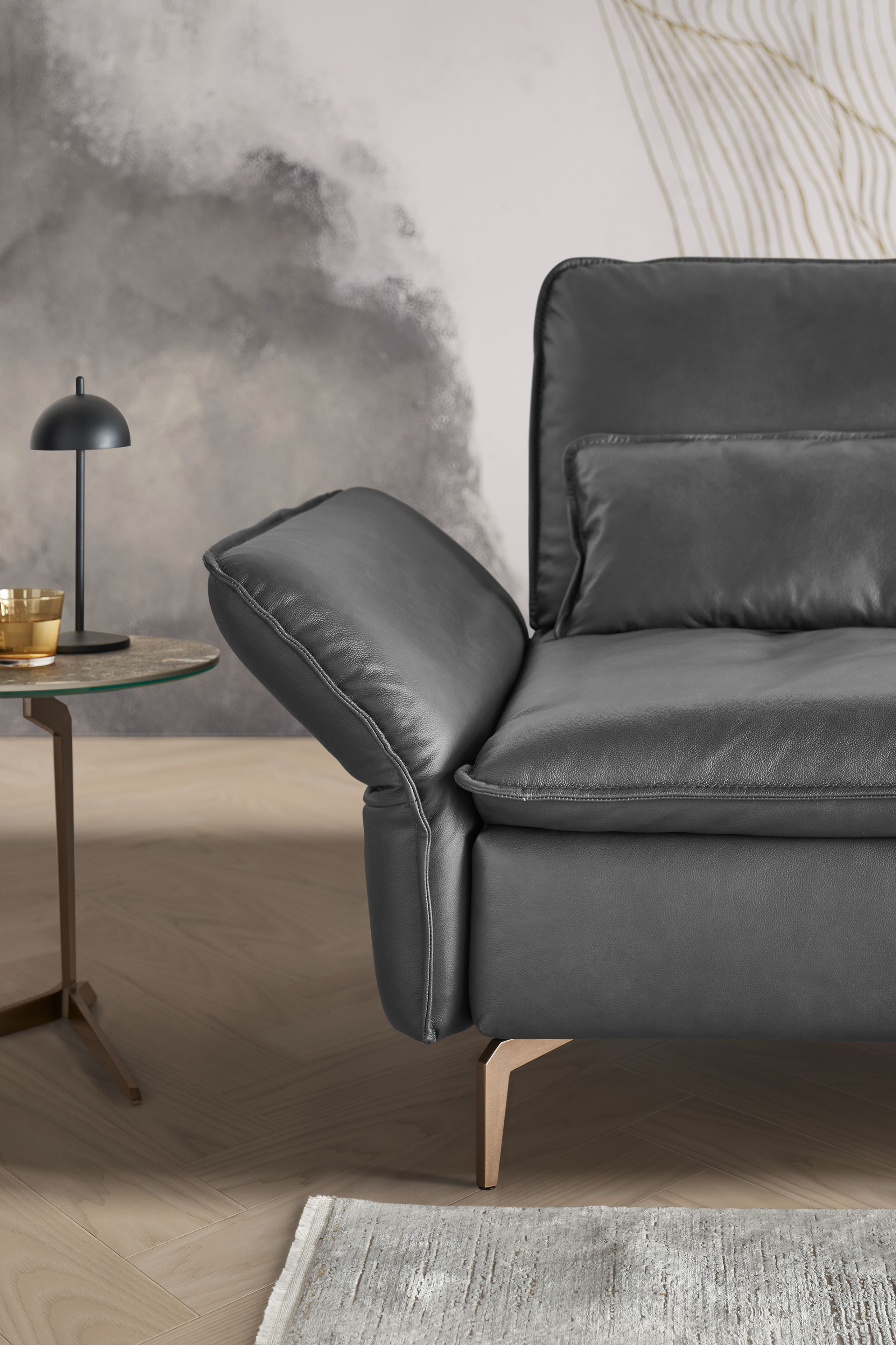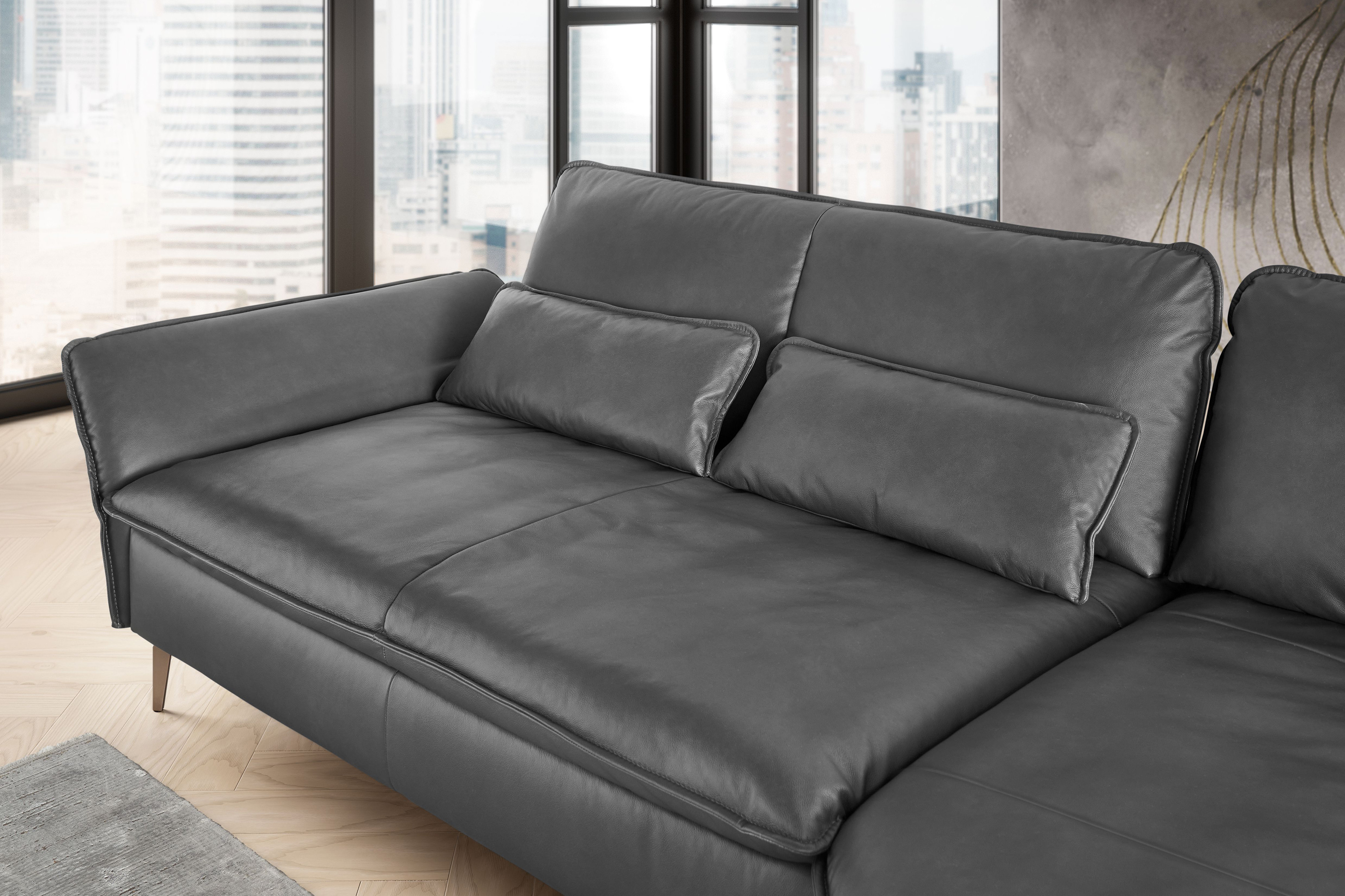Mit der Eckgarnitur MR 2340 von Musterring erhalten Sie ein Möbelstück, welches Ihr Zuhause mit modernem Look, großzügiger Sitzfläche sowie einer hochwertigen Polsterung bereichert. Sie sind geschafft vom Tag und sehnen sich nach einer kleinen Auszeit? Dann nehmen Sie Platz auf der ca. 338 x 160 cm großen Couchgarnitur, welche mit ihrer ergo-PUR-Schaum gepolsterten Sitzfläche, getragen von dauerelastischen Wellenfedern, für ein herrliches Sitzerlebnis sorgt, und genießen Sie gemütliche Stunden mit einem guten Buch oder einer spannenden Serie. In unserem zauberhaften Angebot präsentiert sich das Schmuckstück mit einem dunkelgrauen Ledergewand sowie mit bronzefarbenen Metallfüßen. Diese Farbkombination harmoniert nicht nur perfekt miteinander, sondern wird zu einem stilvollen Highlight und verleiht jedem Wohnraum einen eleganten sowie einzigartigen Charme. Aber auch in puncto Funktion kann das Musterring Sofa überzeugen: Die im 2-Sitzer enthaltene Sitztiefenverstellung, ermöglicht durch das Zurücksetzen der Rückenlehne, die Sitztiefe von etwa 63 cm auf ca. 81 cm zu erweitern. Ideal für ein aufrechtes Sitzen beim Lesen oder ein entspanntes Zurücklehnen. Außerdem lässt sich MR 2340 mit einer Seitenteilverstellung ausstatten, sodass Sie die Armlehnen auf Ihre gewünschte Position stufenweise anpassen können. Über die Zusatzoptionen haben Sie die Möglichkeit, diese sowie auch Kopfstützen hinzuzubuchen oder aus verschiedenen Fußvarianten auszuwählen. Zudem finden Sie darüber hinaus Kissen, welche das Gesamtbild optimal ergänzen und den Wohlfühlfaktor erhöhen. Sie sind begeistert, aber das Äußere passt nicht zu Ihrem bestehenden Wohnkonzept? Kein Problem! Mit einem Klick auf "Farbe ändern" haben Sie die Wahl, zwischen dezenten oder kräftigen Farbnuancen sowie verschiedenen Bezugsmaterialien. Für noch mehr Gestaltungsfreiheit steht Ihnen der Polsterplaner zur Verfügung. So können Sie aus diversen Elementen auswählen und Ihr Traumsofa nach Ihrer Einrichtung sowie Ihrem Platzangebot konfigurieren. Setzen Sie ein Design-Statement und erleben Sie erholsame Momente mit der Polstergarnitur MR 2340 von Musterring.