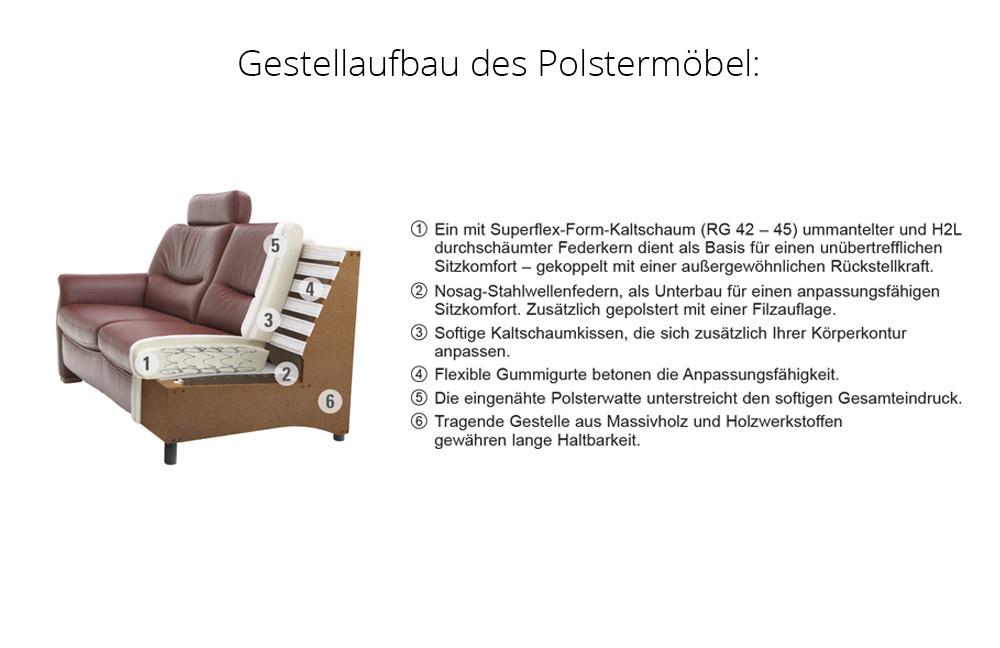 - Sitz: H2L - mit Superflex-Form-Kaltschaum ummantelter und durchgeschäumter Federkern auf Nosag-Stahlwellenfedern