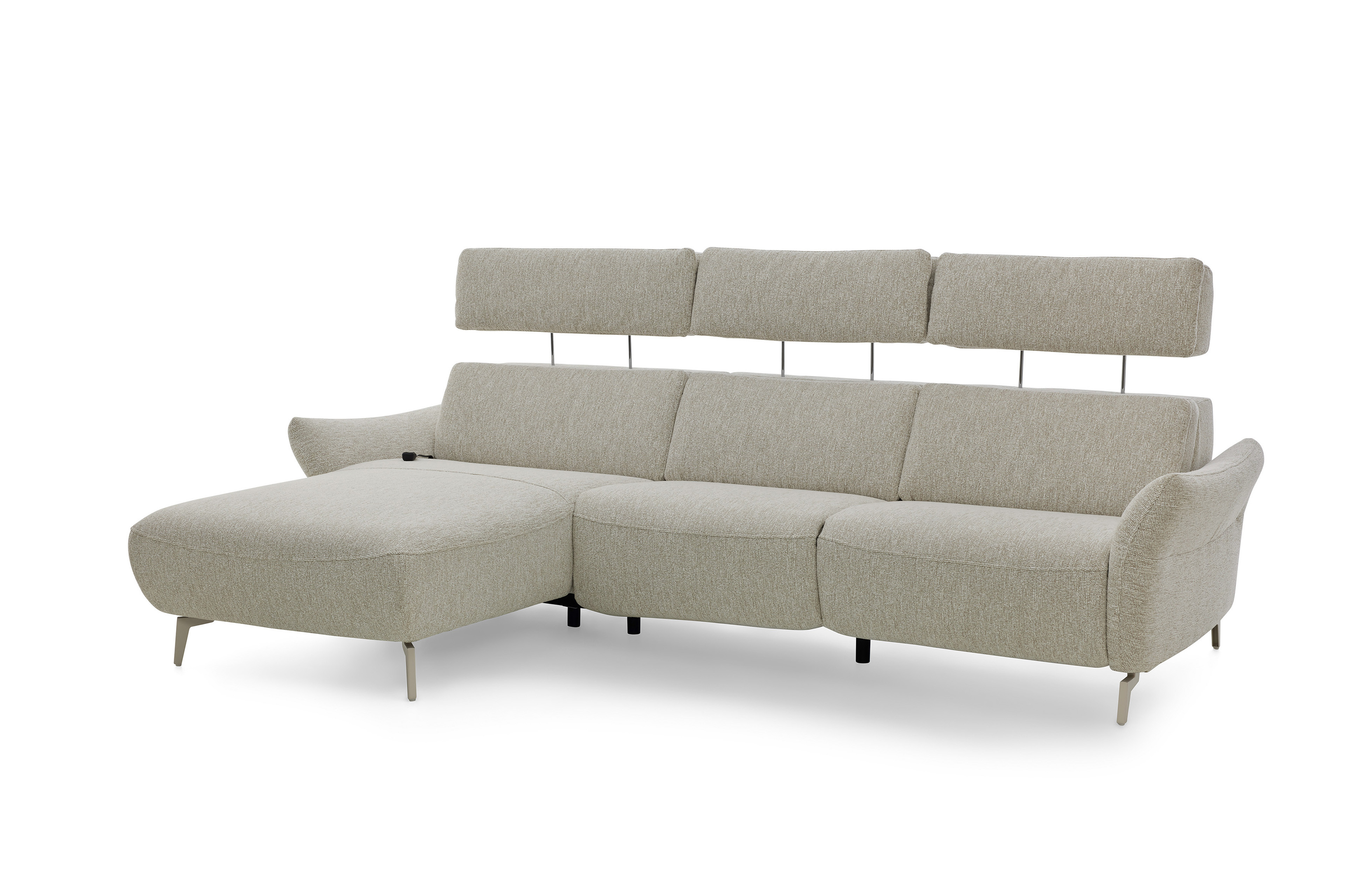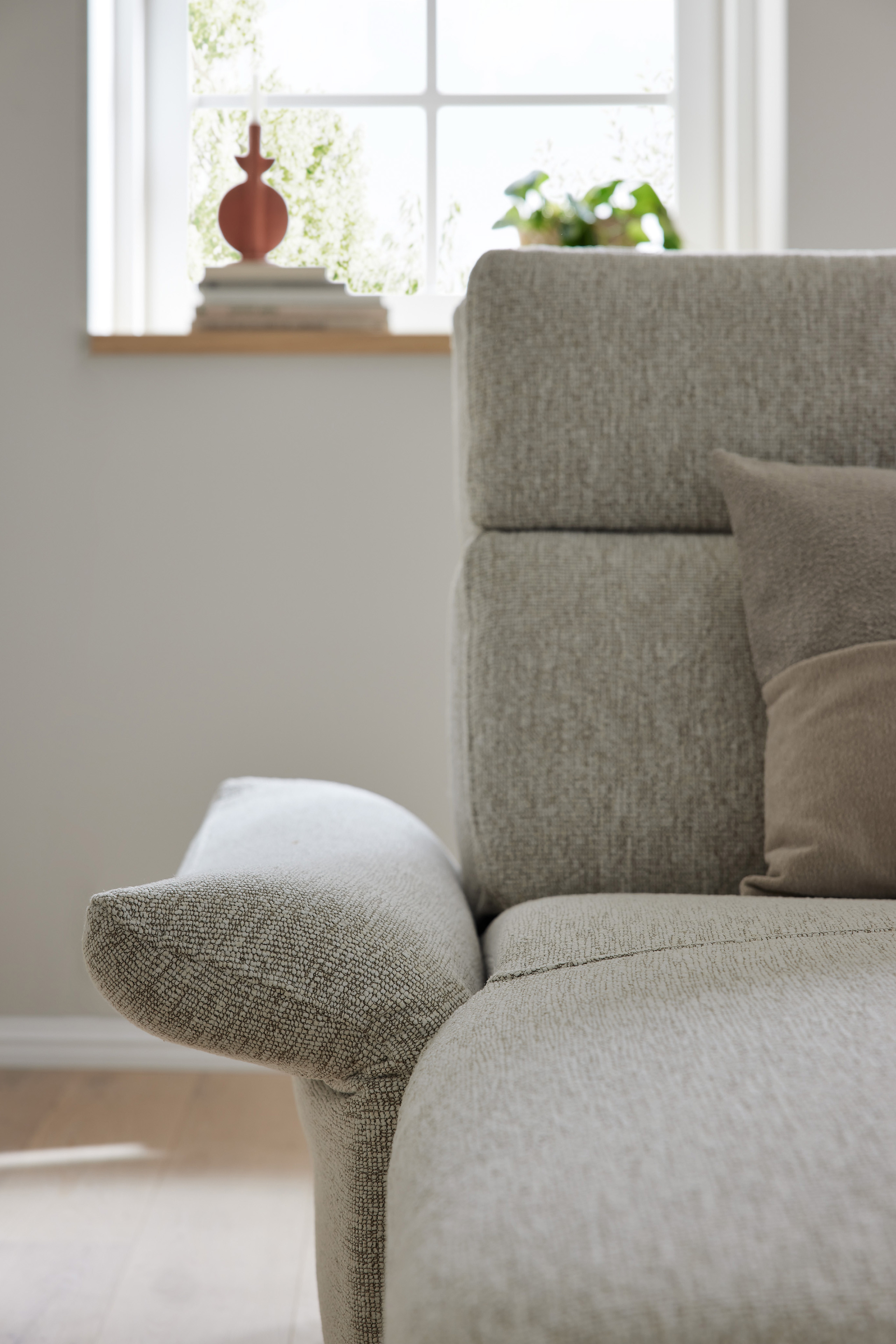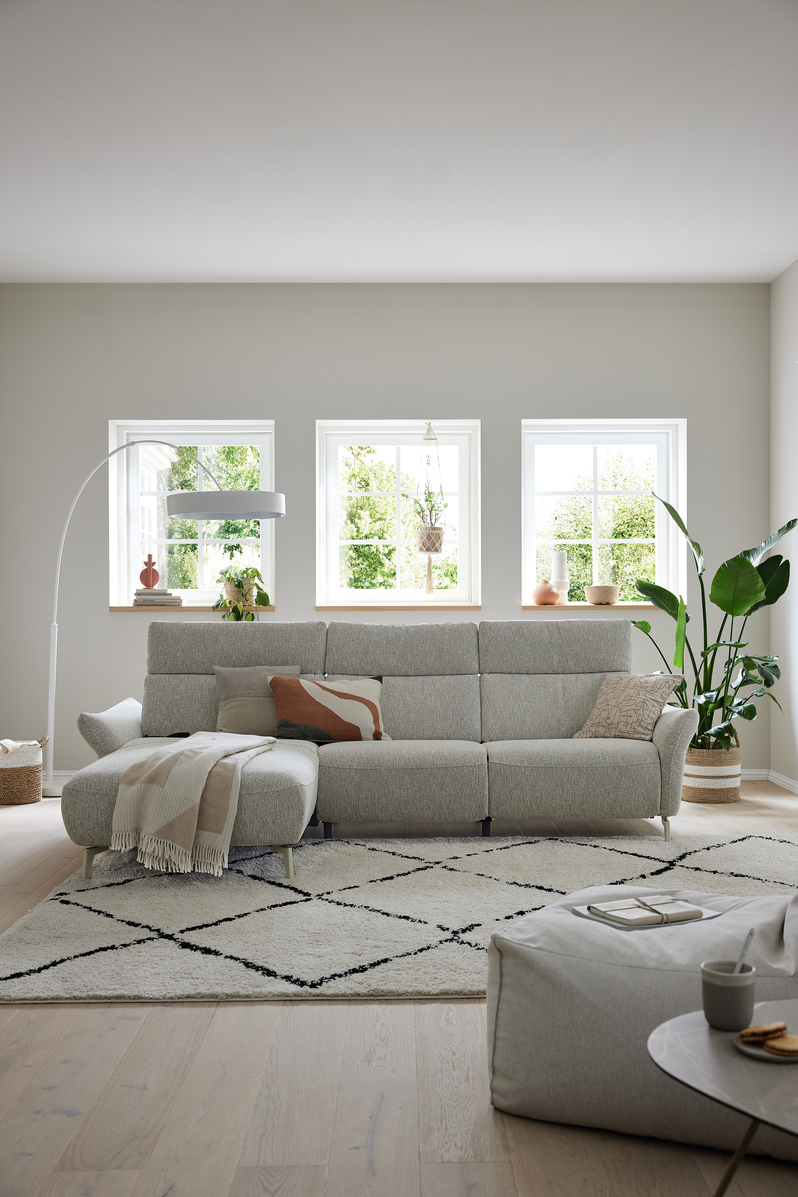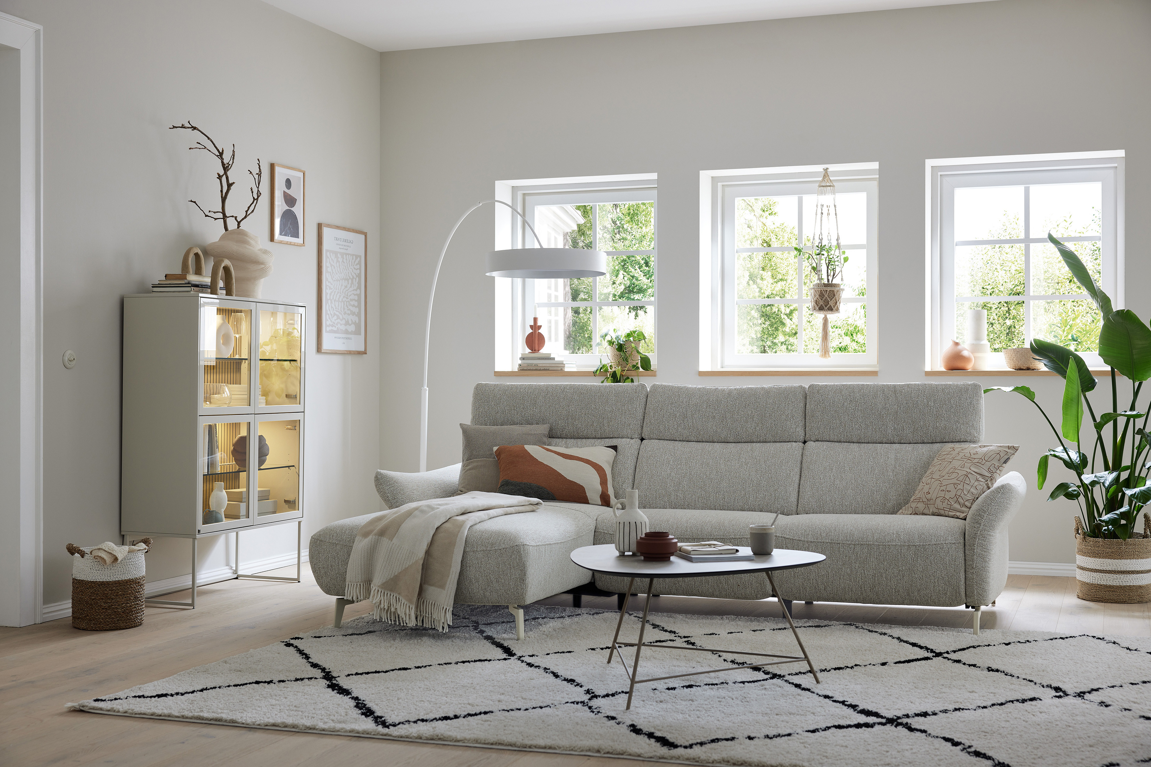 In stilsicherer Optik und mit einem Hauch Arroganz gestaltet die Eckgarnitur MR 280 von Musterring durch ihre reine Präsenz jeden Raum zu einem Ort, an dem Chic, Glamour und Ästhetik die Oberhand gewinnen. Sowohl der cremefarbene Stoffbezug als auch die dazu passende Fußausführung lassen dieses markant designte Ecksofa in absoluter Eleganz erstrahlen. Zusammengesetzt aus einem Canape sowie einem 2,5-Sitzer, bringt das Modell bereits eine manuelle Kopfteilverstellung in seine neue Wirkungsstätte mit. Neben diesen behaglichen Komfort-Extras können Sie über unsere Zusatzoptionen ebenfalls den Härtegrad des Sitzes aus drei verschiedenen Optionen frei wählen, um Ihr neues Sofa ganz und gar auf Ihre Bedürfnisse abzustimmen. Ihnen gefällt die inkludierte Kopfteilverstellung, jedoch steht Ihnen ab und an der Sinn danach, sich entspannt zurückzulehnen? Dann wird Sie die hinzubuchbare WallAway-Funktion sicherlich begeistern. Über die seitlich im Sitz liegenden Touch-Buttons können Sie den Neigungswinkel der Rückenlehne ganz nach Belieben einstellen und sich sowohl in Ihre Wunschposition fallen als auch die Seele baumeln lassen. Ob in Stoff oder Leder, mit dekorativen Zierkissen oder ohne jegliche Ablenkung vom eigentlichen Erscheinungsbild - mit der Polstergarnitur MR 280 von Musterring werden Lifestyle, Moderne und absolute Gemütlichkeit Einzug in Ihre vier Wände halten. Zögern Sie also nicht und bestellen Sie diese hinreißende Schönheit noch heute!