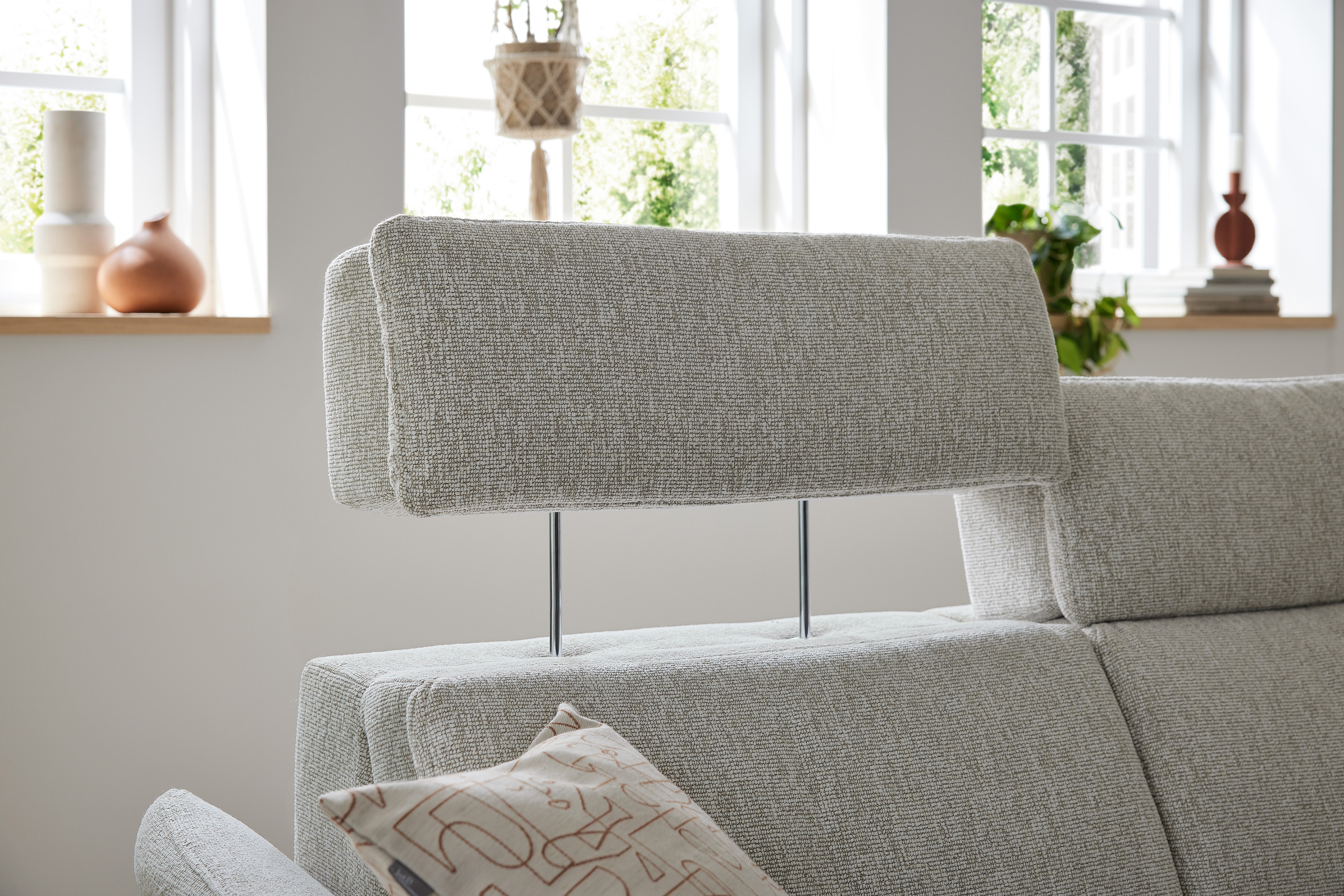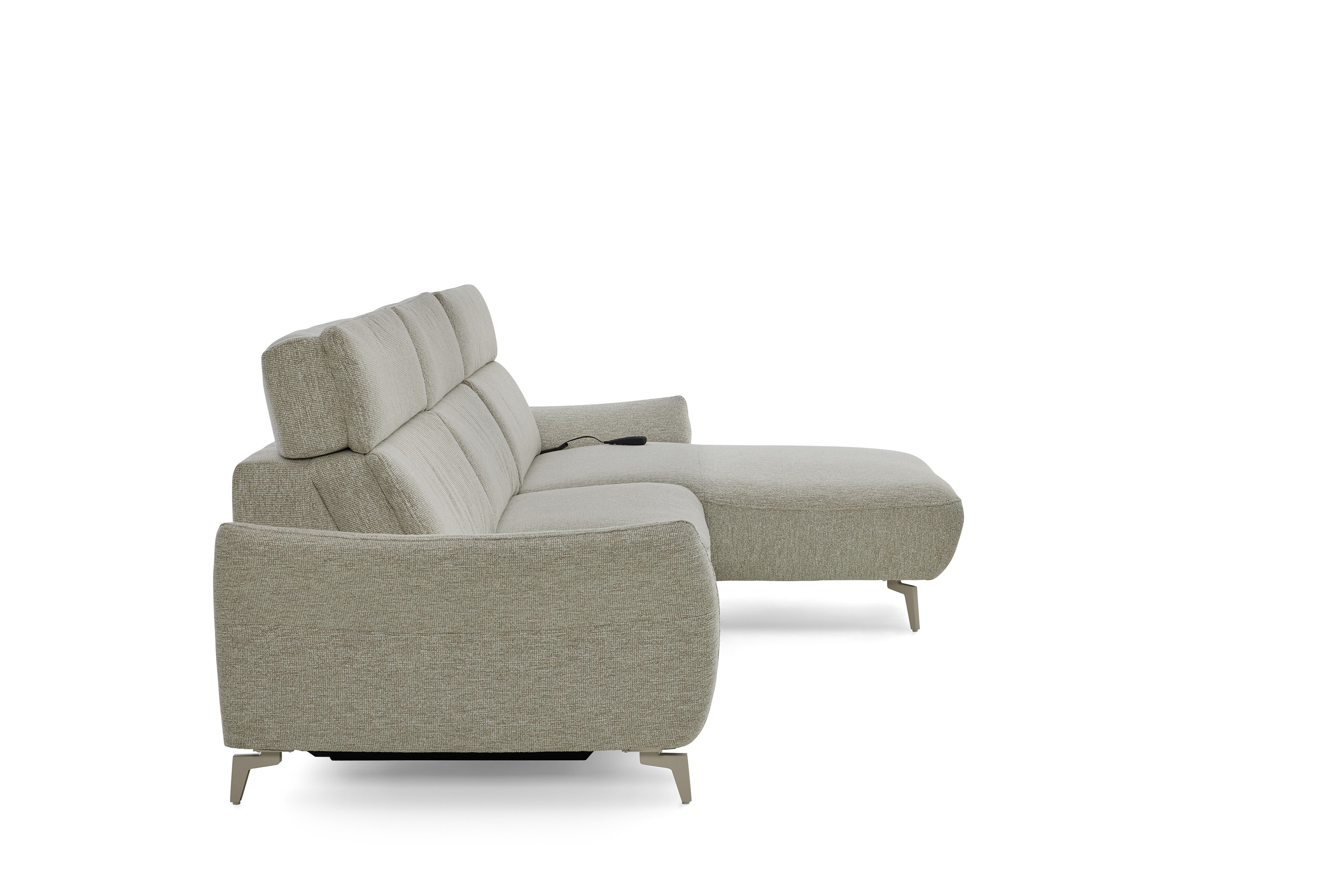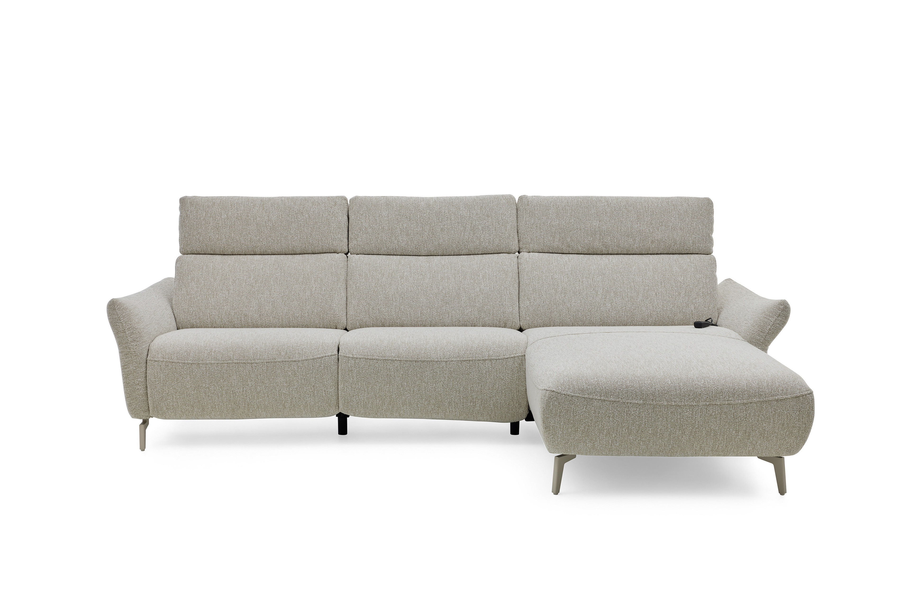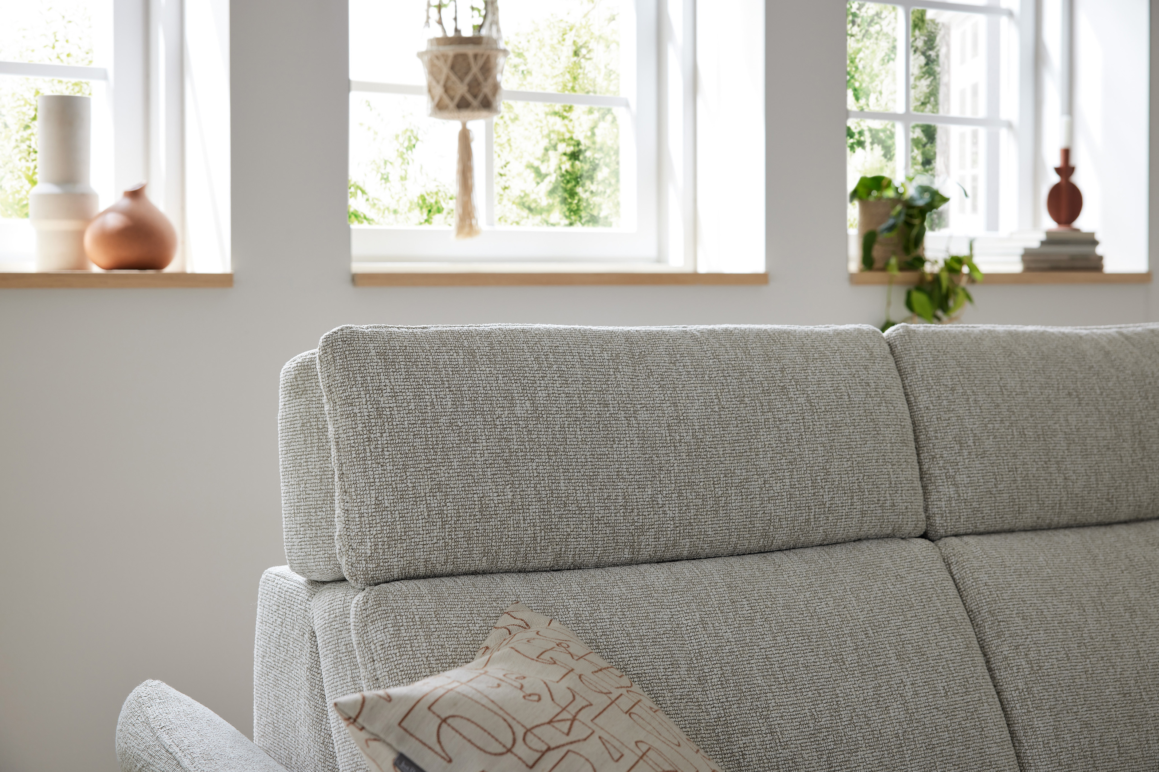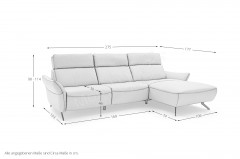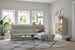 In stilsicherer Optik und mit einem Hauch Arroganz gestaltet die Eckgarnitur MR 280 von Musterring durch ihre reine Präsenz jeden Raum zu einem Ort, an dem Chic, Glamour und Ästhetik die Oberhand gewinnen. Sowohl der cremefarbene Stoffbezug als auch die dazu passende Fußausführung lassen dieses markant designte Ledersofa in absoluter Eleganz erstrahlen. Zusammengesetzt aus einem 2,5-Sitzer sowie einem Canape, bringt das Modell bereits eine manuelle Kopfteilverstellung in seine neue Wirkungsstätte mit. Neben diesen behaglichen Komfort-Extras können Sie über unsere Zusatzoptionen ebenfalls den Härtegrad des Sitzes aus drei verschiedenen Optionen frei wählen, um Ihr neues Sofa ganz und gar auf Ihre Bedürfnisse abzustimmen. Ihnen gefällt die inkludierte Kopfteilverstellung, jedoch steht Ihnen ab und an der Sinn danach, sich entspannt zurückzulehnen? Dann wird Sie die hinzubuchbare WallAway-Funktion sicherlich begeistern. Über die seitlich im Sitz liegenden Touch-Button können Sie den Neigungswinkel der Rückenlehne ganz nach Belieben einstellen und sich sowohl in Ihre Wunschposition fallen als auch die Seele baumeln lassen. Ob in Stoff oder Leder, mit dekorativen Zierkissen oder ohne jegliche Ablenkung vom eigentlichen Erscheinungsbild - mit der Polstergarnitur MR 280 von Musterring werden Livestyle, Moderne und absolute Gemütlichkeit Einzug in Ihre vier Wände erhalten. Zögern Sie also nicht und bestellen Sie diese hinreißende Schönheit noch heute!