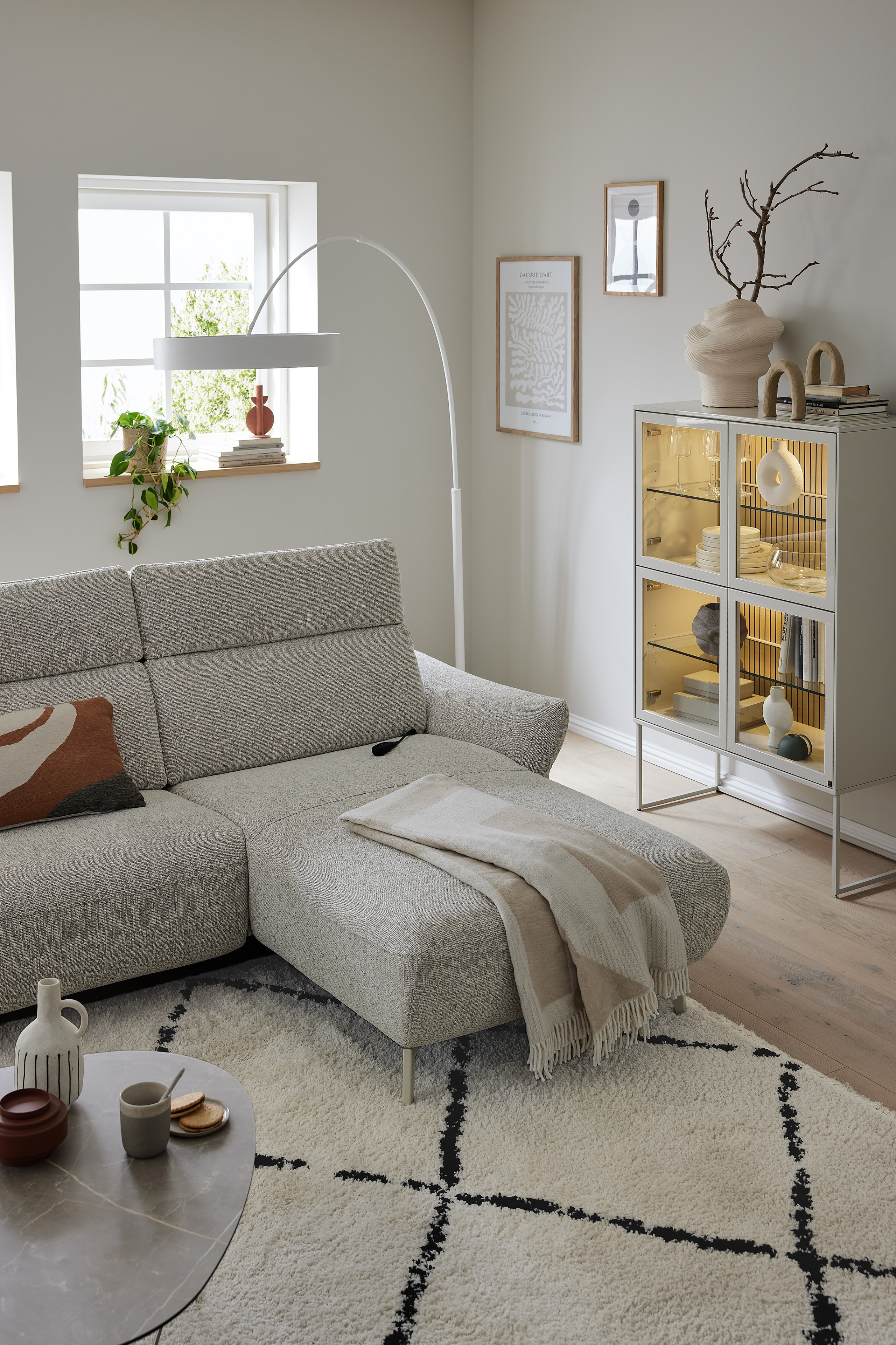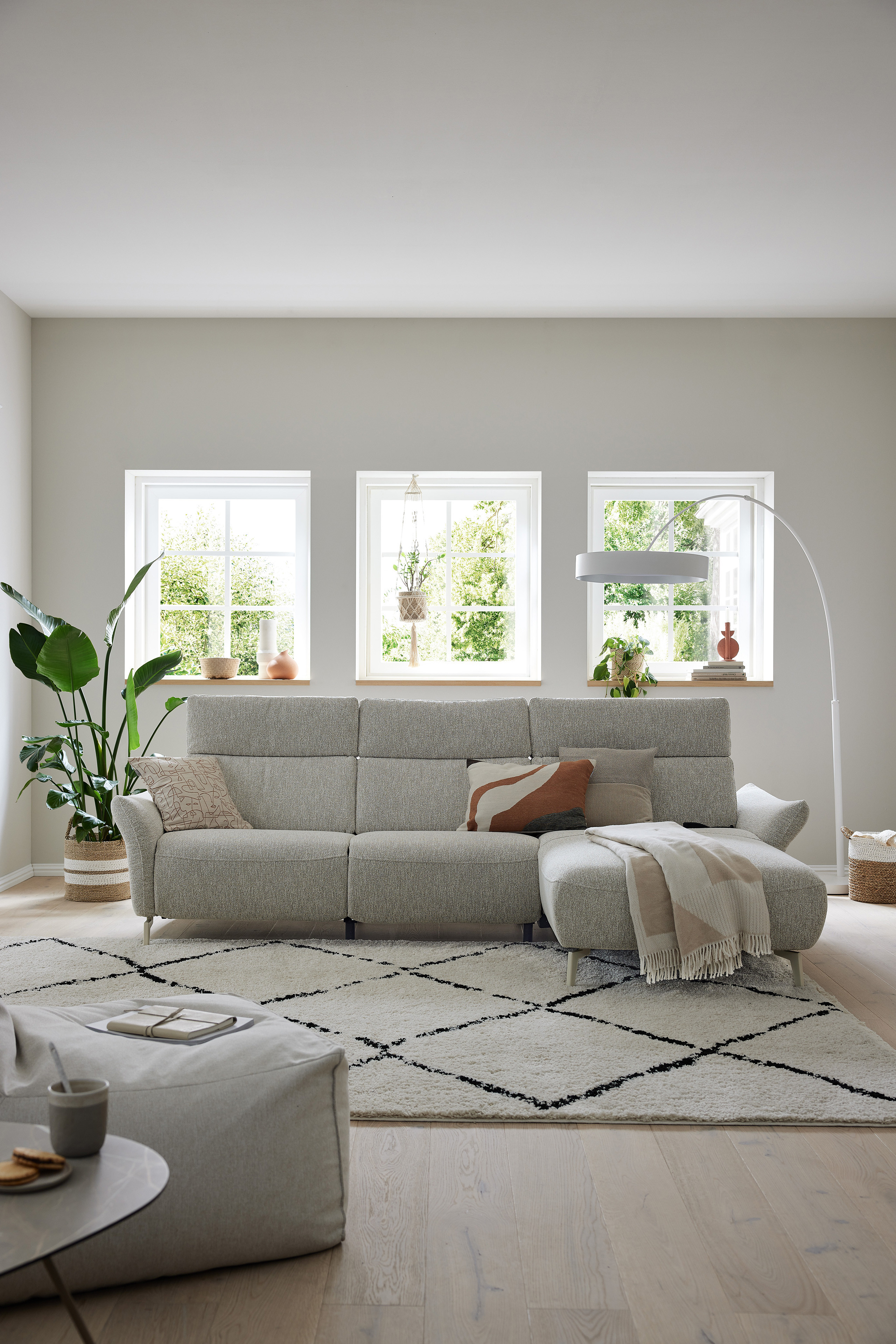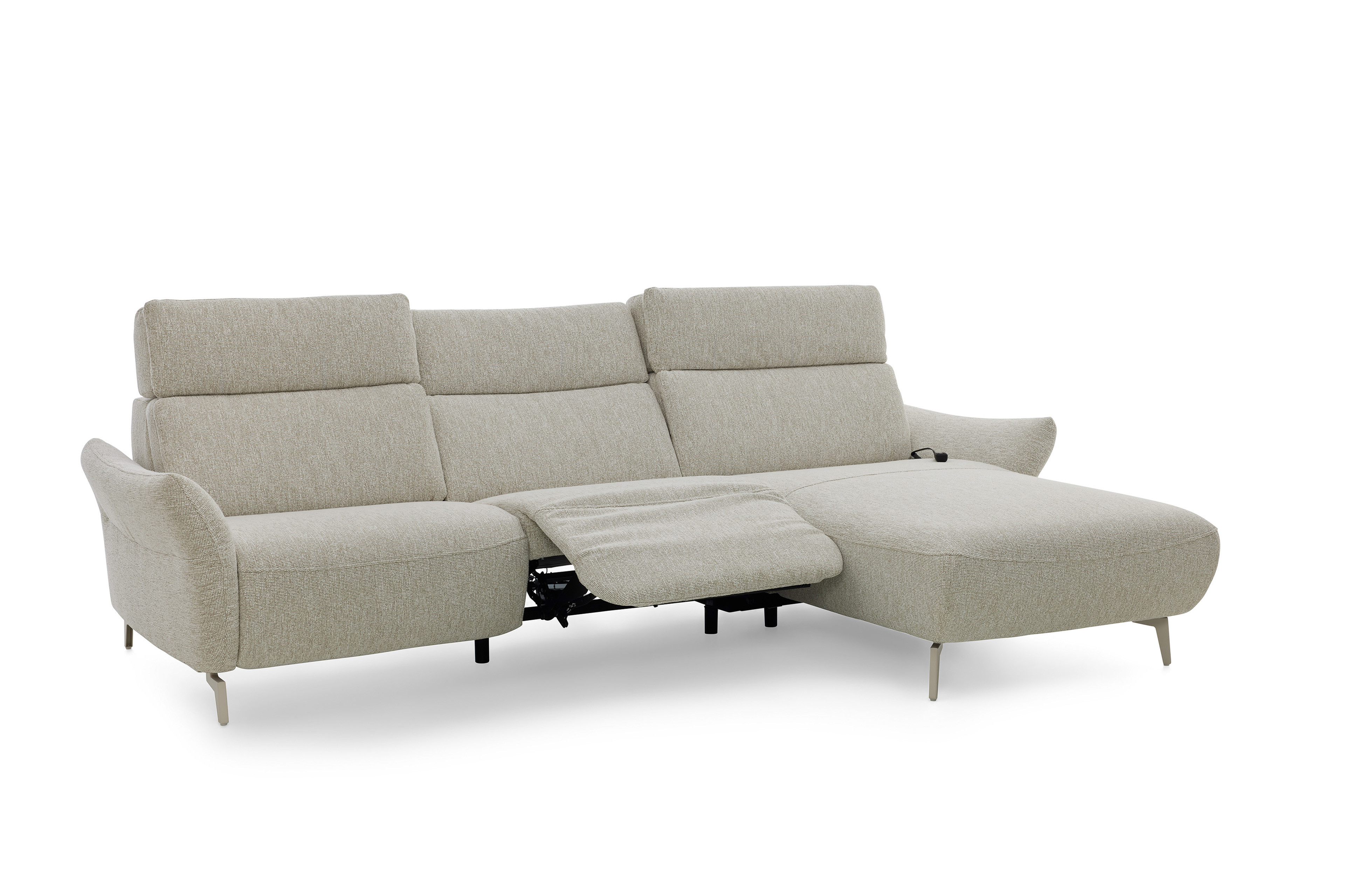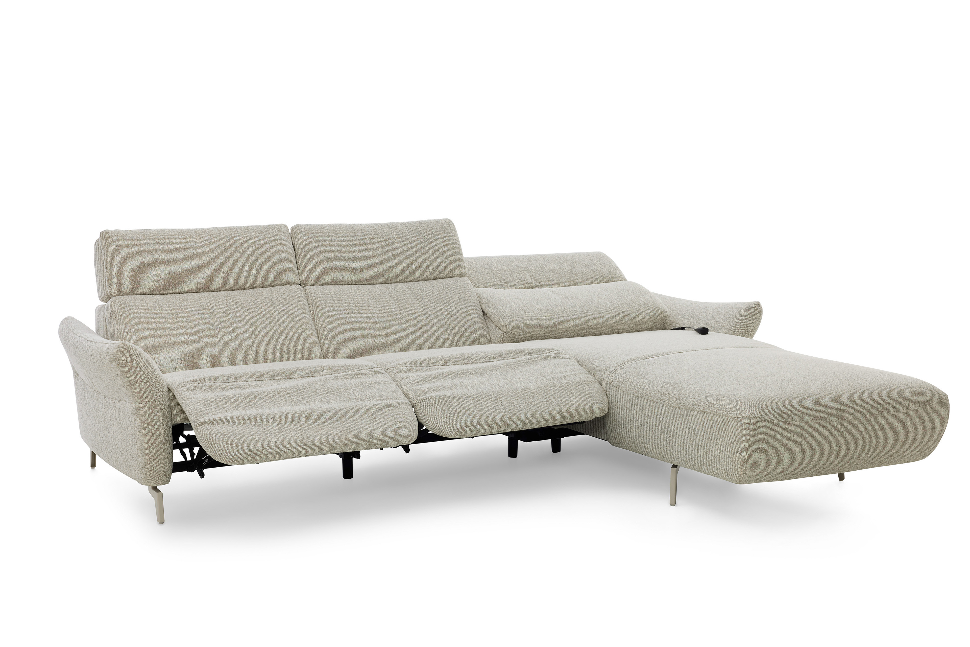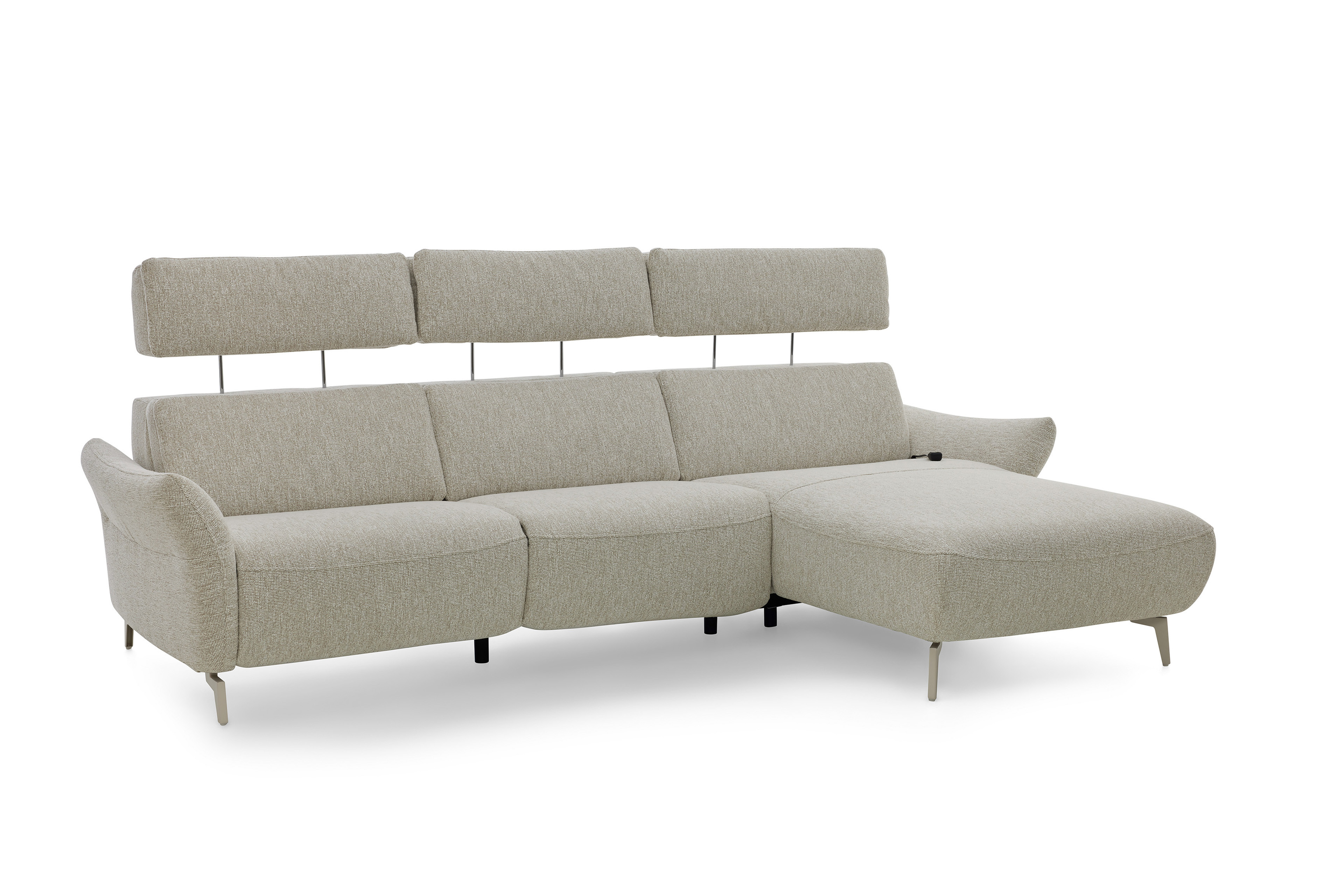 In stilsicherer Optik und mit einem Hauch Arroganz gestaltet die Eckgarnitur MR 280 von Musterring durch ihre reine Präsenz jeden Raum zu einem Ort, an dem Chic, Glamour und Ästhetik die Oberhand gewinnen. Sowohl der cremefarbene Stoffbezug als auch die dazu passende Fußausführung lassen dieses markant designte Ledersofa in absoluter Eleganz erstrahlen. Zusammengesetzt aus einem 2,5-Sitzer sowie einem Canape, bringt das Modell bereits eine manuelle Kopfteilverstellung in seine neue Wirkungsstätte mit. Neben diesen behaglichen Komfort-Extras können Sie über unsere Zusatzoptionen ebenfalls den Härtegrad des Sitzes aus drei verschiedenen Optionen frei wählen, um Ihr neues Sofa ganz und gar auf Ihre Bedürfnisse abzustimmen. Ihnen gefällt die inkludierte Kopfteilverstellung, jedoch steht Ihnen ab und an der Sinn danach, sich entspannt zurückzulehnen? Dann wird Sie die hinzubuchbare WallAway-Funktion sicherlich begeistern. Über die seitlich im Sitz liegenden Touch-Button können Sie den Neigungswinkel der Rückenlehne ganz nach Belieben einstellen und sich sowohl in Ihre Wunschposition fallen als auch die Seele baumeln lassen. Ob in Stoff oder Leder, mit dekorativen Zierkissen oder ohne jegliche Ablenkung vom eigentlichen Erscheinungsbild - mit der Polstergarnitur MR 280 von Musterring werden Livestyle, Moderne und absolute Gemütlichkeit Einzug in Ihre vier Wände erhalten. Zögern Sie also nicht und bestellen Sie diese hinreißende Schönheit noch heute!