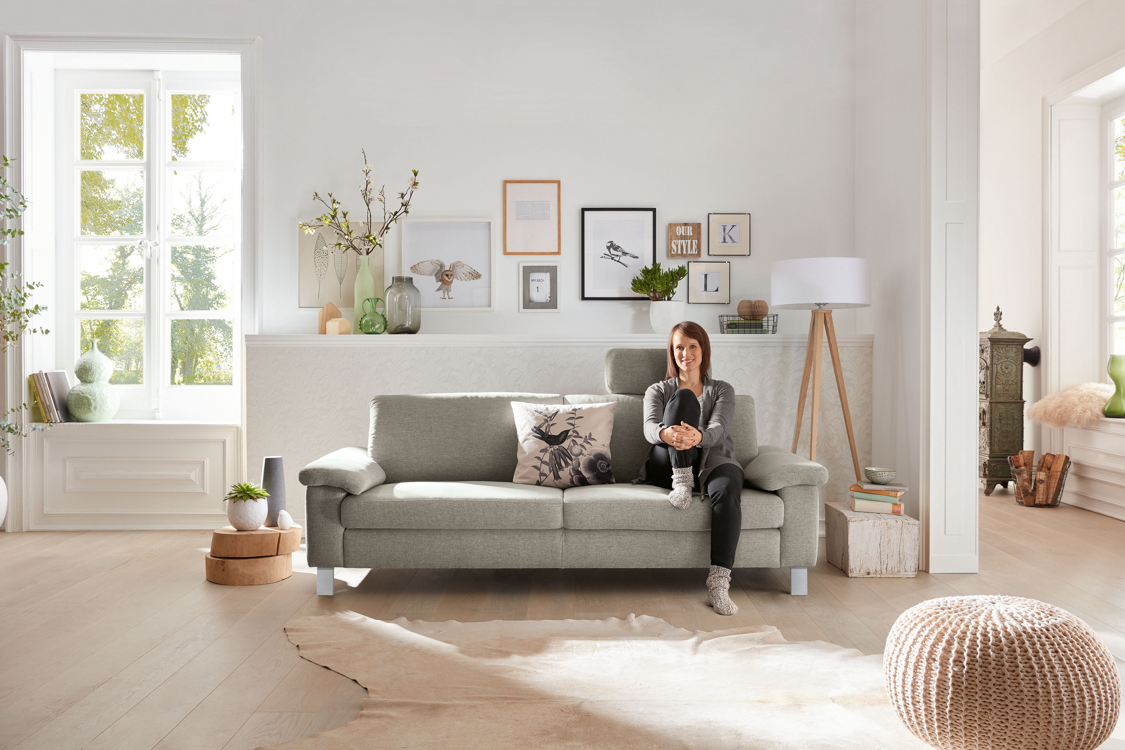 In unserem Angebot erstrahlt das Musterring Sofa MR 2875 in einem eleganten, grauen Stoffbezug und begeistert schon beim ersten Betrachten mit seiner zeitlosen Optik. Die großzügige Sitzfläche lädt dazu ein, den Alltag hinter sich zu lassen, während die hochwertige Polyätherschaum-Polsterung mit eingearbeitetem Federkern, getragen von dauerelastischen Wellenfedern, höchsten Komfort und pures Wohlfühlen verspricht. Nehmen Sie Platz auf dem ca. 220 cm breiten 2-Sitzer, genießen Sie gemütliche Stunden und lassen Sie den Abend mit einem guten Film oder einem spannenden Roman ausklingen. Ein besonderes Highlight ist die Gestaltungsfreiheit, die Ihnen diese Couch bietet: Unter "Farbe ändern" erhalten Sie eine umfangreiche Bezugskollektion mit vielfältigen Farbnuancen, sodass sich das Gewand auf Ihre Bedürfnisse anpassen lässt. Über die Zusatzoptionen können Sie das Design der Füße plus der Seitenteile abändern, aus unterschiedlichen Sitz- sowie Rückenhöhen, Sitztiefen und Polsterungen auswählen. Zudem sind praktische Kopfstützen, welche für optimale Unterstützung in jeder Sitzposition sorgen, sowie ein passender Hocker hinzubuchbar. Diese schaffen eine gemütliche Atmosphäre und eine persönliche Relaxzone. Die Garnitur MR 2875 von Musterring schenkt Ihnen einen Ort, um sich zu erholen und neue Energie für den nächsten Tag zu tanken.