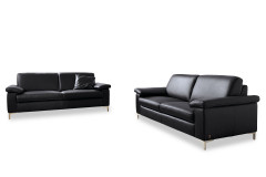 Mit dem Polsterduo zieht bei Ihnen ein Möbelstück ein, welches Ihr Zuhause mit moderner Optik sowie einer angenehmen Polsterung aus Polyätherschaum mit eingearbeitetem Federkern und ruhend auf dauerelastischen Wellenfedern bereichert - MR 2875 von Musterring. Bestehend aus einem 2-Sitzer mit einem Platzangebot von ca. 184 cm und einem 2-Sitzer mit einer Breite von etwa 204 cm wird Ihnen ausreichend Fläche geboten, um ein gemütliches Zusammensitzen mit Ihren Liebsten bei spannenden Gesprächen oder in Ruhe den Morgenkaffee am Sonntag zu genießen. Mit ihrem schwarzen Ledergewand lässt sich die Musterring Garnitur nicht nur optimal in moderne sowie klassische Einrichtungsstile integrieren, sondern es wird auch perfekt der luxuriöse Charakter zur Geltung gebracht und es werden zugleich stilvolle Akzente in Ihrem Wohnraum gesetzt. Über unsere Zusatzoptionen können Sie das Gesamtbild mit einem optionalen Sessel, welcher einen zusätzlichen Wohlfühlplatz bietet, sowie einem passenden Hocker, der ideal als bequeme Beinablage genutzt werden kann, komplettieren. Außerdem finden Sie dort die Möglichkeit, aus verschiedenen Sitz- sowie Rückenhöhen, Polsterungen, Seitenteilen und Fußvarianten auszuwählen. Natürlich ist das Modell in anderen Farben sowie in einer anderen Zusammenstellung erhältlich, sodass es zu Ihren Vorstellungen passt: Eine umfangreiche Bezugskollektion mit diversen Materialien sowie Farbtönen erhalten Sie unter der Rubrik "Wunschbezug - Farbe ändern" und mithilfe unseres Polsterplaners, welcher eine vielfältige Auswahl an unterschiedlichen Elementen bereitstellt, können Sie Ihre Traumoase nach Ihren Wünschen gestalten. Erleben Sie erholsame Stunden allein oder kuschelige Momente mit der Familie mit unserem attraktiven Polstersofa MR 2875 von Musterring.