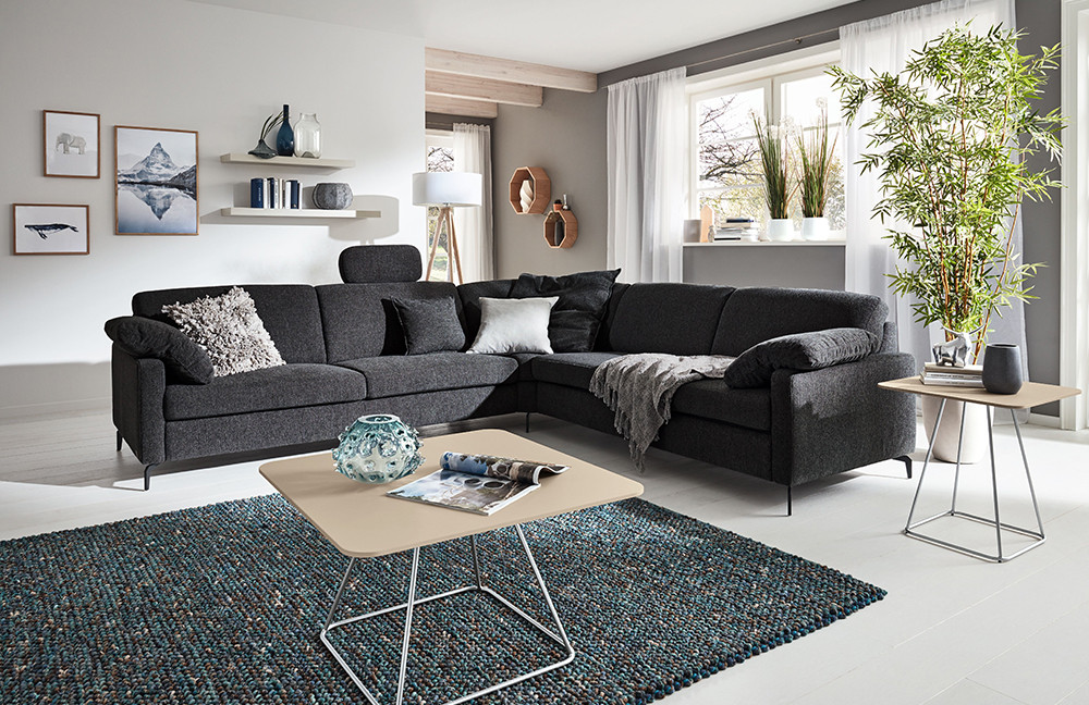 Ein Sofa ist nicht nur ein Möbelstück, es ist das Herz des Zuhauses, ein Ort, an dem man sich nach einem langen Tag fallen lassen sowie abschalten kann, Gedanken und Seele ruhen sowie neue Gespräche mit den Liebsten entstehen. Mit dem Ecksofa MR 2875 von Musterring wird Ihnen genau so ein Platz geschenkt, welcher mit einer Stellfläche von etwa 286 x 266 cm und einer hochwertigen Sitzpolsterung aus Polyätherschaum mit eingearbeitetem Federkern, die auf dauerelastischen Wellenfedern ruht, die perfekte Ruheoase bietet. Mit ihrer großzügigen Fläche sowie dem unvergleichlichen Komfort verwandelt die Garnitur jeden Moment in ein sinnliches Erlebnis und schafft eine zauberhafte, einladende Wohlfühlatmosphäre. Zudem kann MR 2875 auch mit ihrer zeitlosen Optik begeistern: Das Chenille-Flachgewebe in Anthrazit entfaltet dezenten Glanz, verleiht der Polsterecke eine luxuriöse, dennoch zurückhaltende Raffinesse und fügt sich optimal in jedes Interieur ein. Unter dem Menüpunkt "Wunschbezug - Farbe ändern" erhalten Sie eine vielfältige Stoff- sowie Lederübersicht mit vielen kräftigen oder schlichten Farbtönen, sodass Sie das Gewand auch an Ihre Vorstellungen anpassen können. Zudem lässt sich das Ecksofa ideal mit kuscheligen Kissen, praktischen Kopfstützen sowie einem Hocker in verschiedenen Größen komplettieren. Diese sind ganz einfach über der Rubrik "Zusatzoptionen" hinzubuchbar. Darüber hinaus finden Sie dort eine große Auswahl an diversen Seitenteilen, Fußvarianten, zwei wählbaren Sitz- und Rückenhöhen, Sitztiefen sowie drei Polsterungen. Ob eine andere Eckcouch, eine große Wohnlandschaft oder eine 3-2-1 Sofagruppe - mit unserem Polsterplaner haben Sie die Möglichkeit, Ihre Wunschgarnitur zu konfigurieren. Die Musterring Couch MR 2875 ist die ideale Wahl für alle, die stilvolles Design lieben und Bequemlichkeit schätzen.
