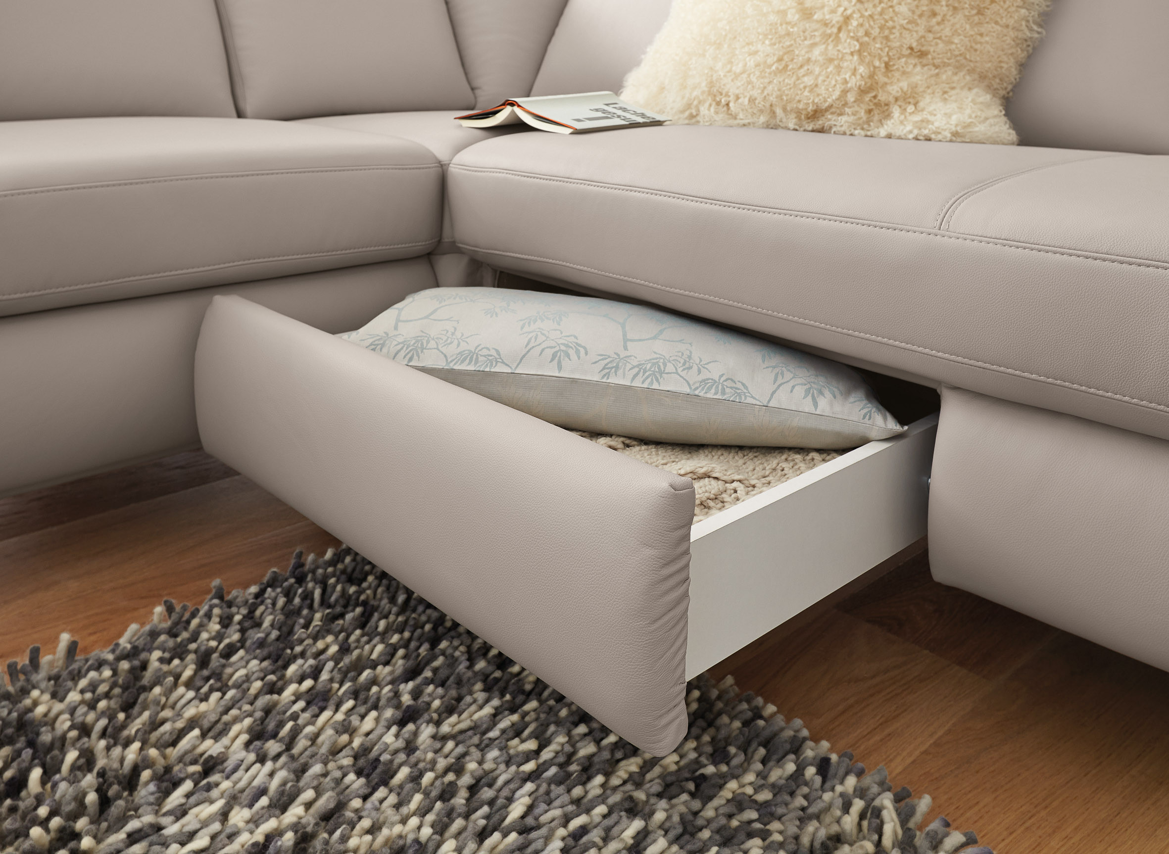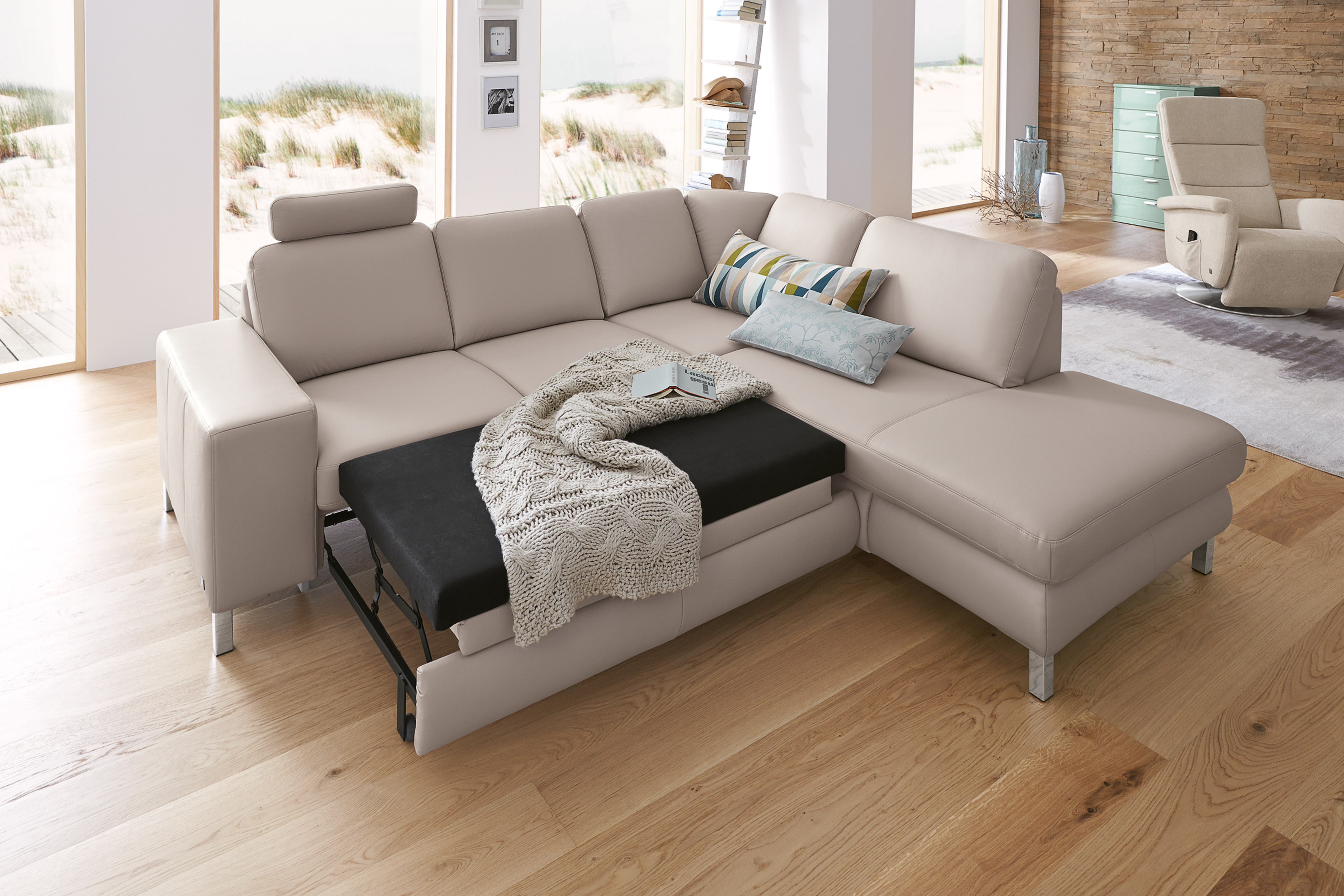 Bequemes Sitzen leicht gemacht – mit der Musterring Eckgarnitur MR 365. Einmal mehr wird hier ein Modell präsentiert, welches dank der wählbaren Sitzpolsterung aus einem PUR-Schaum oder einem Federkern nicht nur den passenden Sitzkomfort mit sich bringt, sondern ebenfalls für die richtige Portion Gemütlichkeit an jedem einzelnen Tag sorgen wird. Genießen Sie neben dem angenehmen Sitzgefühl auch eine ansprechende Optik, hervorgerufen durch den wunderbaren Echtlederbezug sowie die dazu stimmigen glänzenden Metallfüße. Doch das puristisch designte Möbelstück macht nicht nur im Ledergewand eine gute Figur. Nehmen Sie sich einen Moment Zeit und werfen Sie einen Blick in die vielfältige Bezugsübersicht unter dem Menüpunkt “Wunschbezug“. Hier wird selbst der größte Kritiker fündig und erschafft sich die ideale Polstergarnitur, abgestimmt auf seinen Geschmack und so gut wie jeden Einrichtungsstil. Sie erwarten mehr von einer Eckcouch als ein ansprechendes Äußeres und Gemütlichkeit? Kein Problem, den MR 365 kann auf Wunsch mit einer Schlaffunktion sowie einem Schubkasten ausgestattet werden. Somit erhalten Sie mehr Platz zum Relaxen und einen kleinen Stauraum, in welchem Ihre Lieblingsdecke perfekt aufgehoben ist. Weiterhin kann unser Angebot mit einem Hocker oder einer Hockerbank erweitert werden – ebenso besteht die Möglichkeit, variabel einsteckbare Kopfstützen, die Sie in gewünschter Anzahl direkt über unsere Zusatzoptionen zum Angebot hinzubuchen können, zu erwerben. Gestalten Sie Ihr Wohnzimmer mit der Polsterecke MR 365 von Musterring zu einem Ort der Harmonie sowie des Wohlgefühls, an dem gern verweilt und Entspannung großgeschrieben wird.