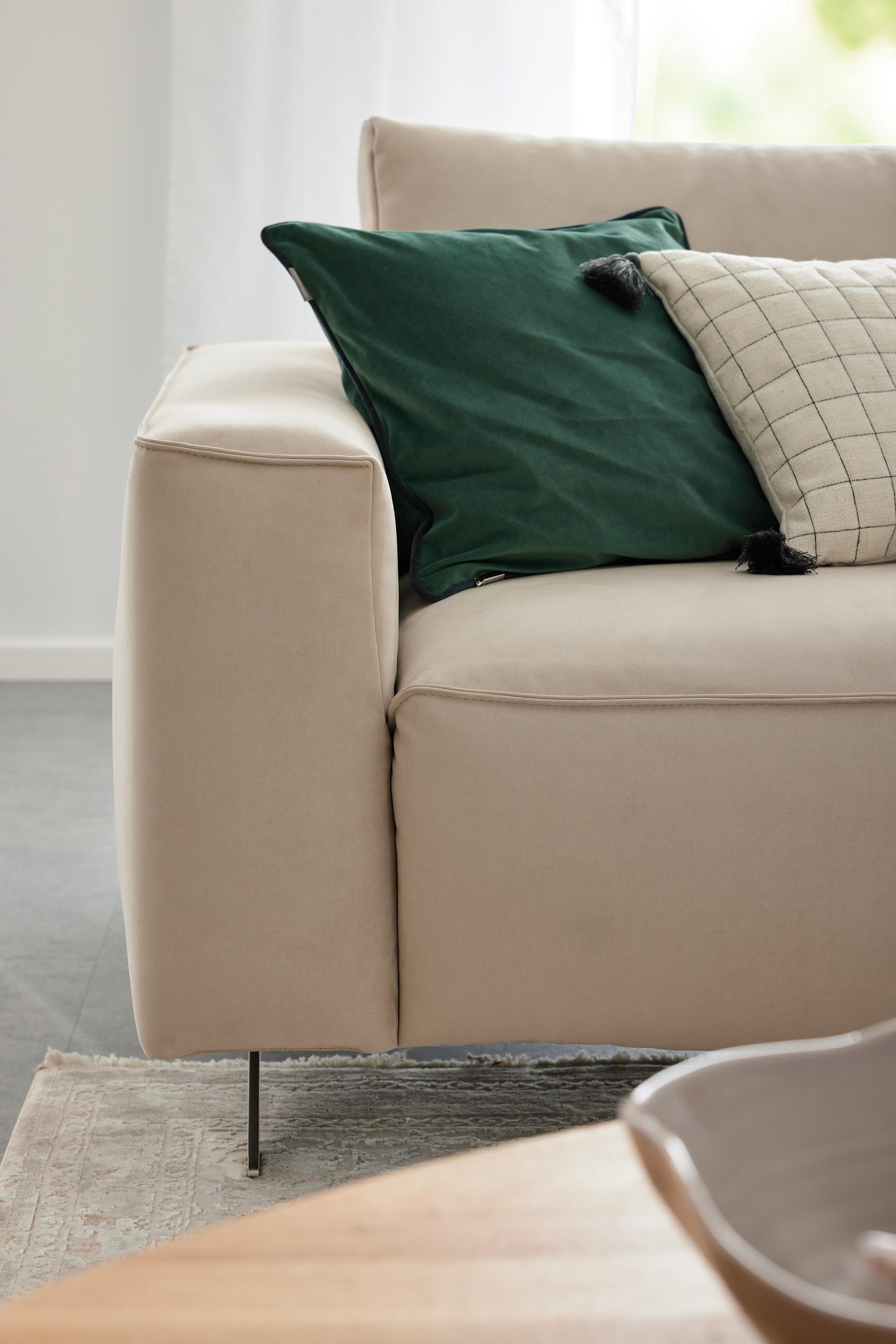 Bereichern Sie Ihr Zuhause mit einem modernen Möbelstück, welches sich mit seinem beigefarbenen Microfaser-Gewand problemlos in jedes Wohnkonzept integriert und dabei einen Hauch von zeitloser Eleganz versprüht - Modell MR 9450 von Musterring. Mit einem Stellmaß von etwa 270 x 300 cm schenkt Ihnen die Polstergarnitur ausreichend Sitzfläche für Sie sowie Ihre Liebsten und lädt dazu ein, einen schönen Familienabend mit lustigen Gemeinschaftsspielen oder spannenden Filmen zu erleben. Die Eckgarnitur ist im Inneren mit einem hochwertigen HR-Kaltschaum, welcher auf Nosagwellenfedern ruht, ausgestattet und ermöglicht Ihnen so ein zauberhaftes Sitzgefühl, sodass Sie hier entspannte Stunden in absoluter Ruhe sowie Geborgenheit genießen können. Optional können Sie das Sofa auch mit einem Taschenfederkern ausrüsten. Diese sowie verschiedene Fußvarianten, Armlehnenbreiten, Sitzhöhen und weitere funktionale Extras finden Sie über unsere Zusatzoptionen. Zudem haben Sie ebenfalls die Möglichkeit, den Bezug anzupassen: Eine großzügige Übersicht mit diversen Stoff- sowie Ledervarianten und tollen Farbnuancen erhalten Sie mit einem Klick auf den Button "Farbe ändern". Gestalten Sie Ihre Traumgarnitur noch heute und lassen Sie sich zukünftig verwöhnen von einem erstklassigen Sitzkomfort sowie praktischen Funktionen. Das Polstersofa MR 9450 von Musterring verspricht pures Wohlfühlen.