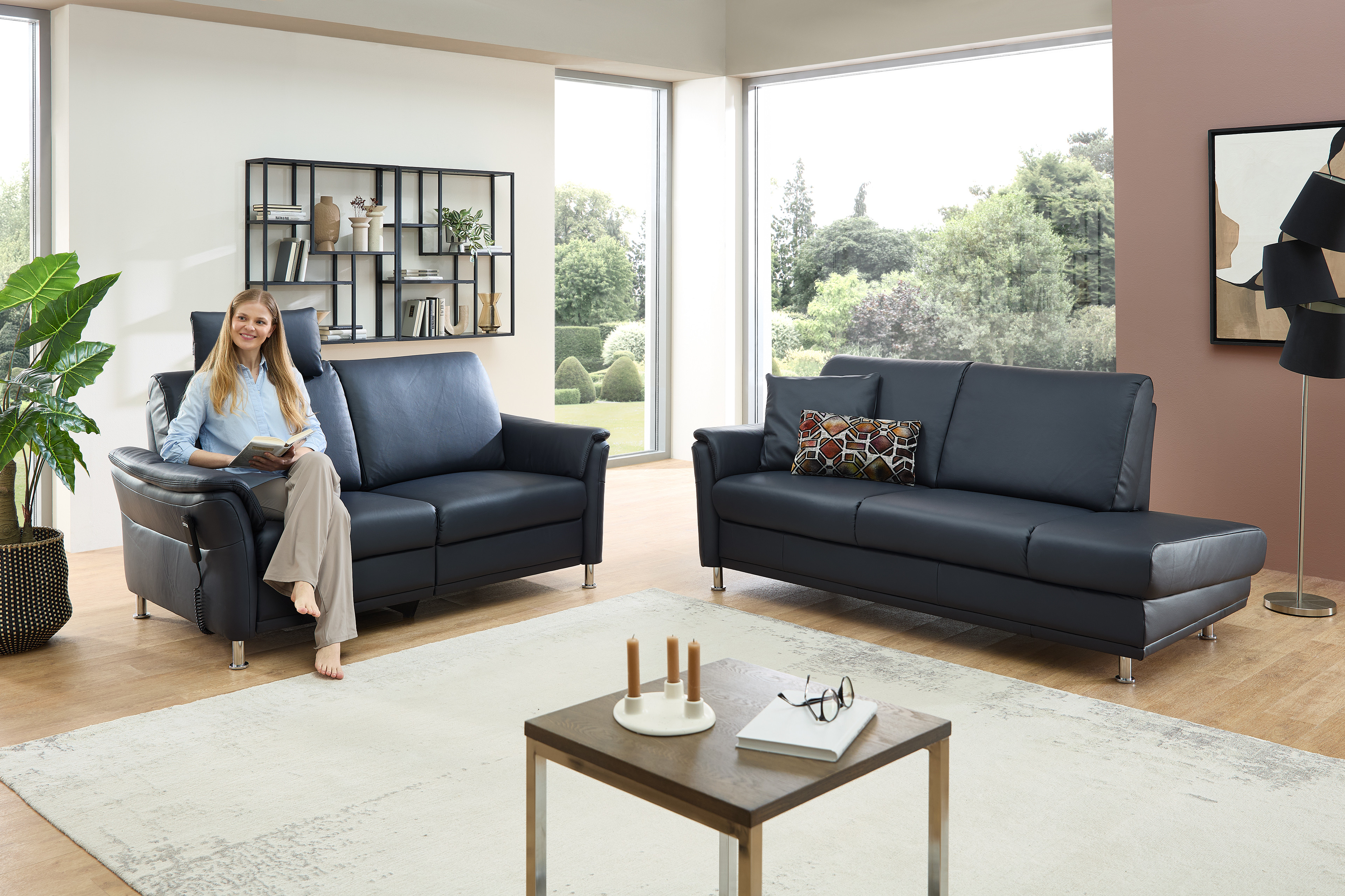 Mit dem Modell Emilia präsentiert PM Oelsa ein Echtleder-Duo, das Komfort sowie Funktionalität auf stilvolle Weise miteinander vereint. Die Sofa-Gruppe setzt sich aus einem 2-Sitzer mit einer Breite von ca. 170 cm sowie einer Einzelottomane mit einer Breite von ca. 191 cm zusammen, wobei Ersteres aus zwei separaten Einsitzer-Elementen besteht. Der Bezug aus feinstem Leder in der Farbe Dunkelblau verleiht der Modell-Reihe eine moderne, erfrischende Note und sorgt dank seiner weichen Struktur für ein angenehmes Hautgefühl. Ein echter Hingucker, der Ihr Wohnzimmer nicht nur optisch aufwertet, sondern auch für eine behagliche Atmosphäre sorgt. Für Ihren persönlichen Komfort können Sie die Polsterung frei wählen und bei den Sitzelementen des Zweisitzers sogar eine Aufstehhilfe hinzufügen, die den Alltag besonders komfortabel macht. Abgerundet wird das Programm beispielsweise durch Kissen in verschiedenen Größen, einen passenden Relaxsessel, den Sie über unseren Polsterplaner hinzubuchen können, oder einen praktischen Hocker für die müden Beine. So haben Sie die Möglichkeit, Ihr persönliches Ensemble nach Ihren Bedürfnissen zu erweitern. Auch bei der Gestaltung der Garnituren sind keine Grenzen gesetzt: Wählen Sie aus der facettenreichen Bezugspalette von PM Oelsa Ihren Favoriten und kreieren Sie Ihre individuelle Traumgarnitur. Falls Sie Unterstützung bei der Planung wünschen, stehen Ihnen unsere freundlichen Einrichtungsexperten gern beratend zur Seite und helfen Ihnen, die passende Zusammenstellung für Ihr Wohnambiente zu finden.