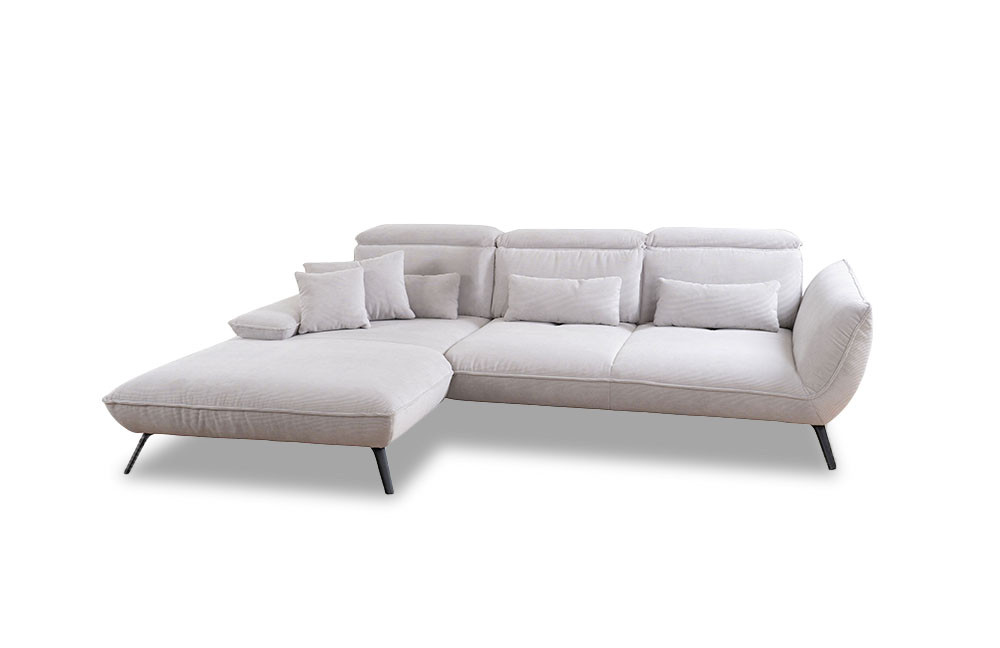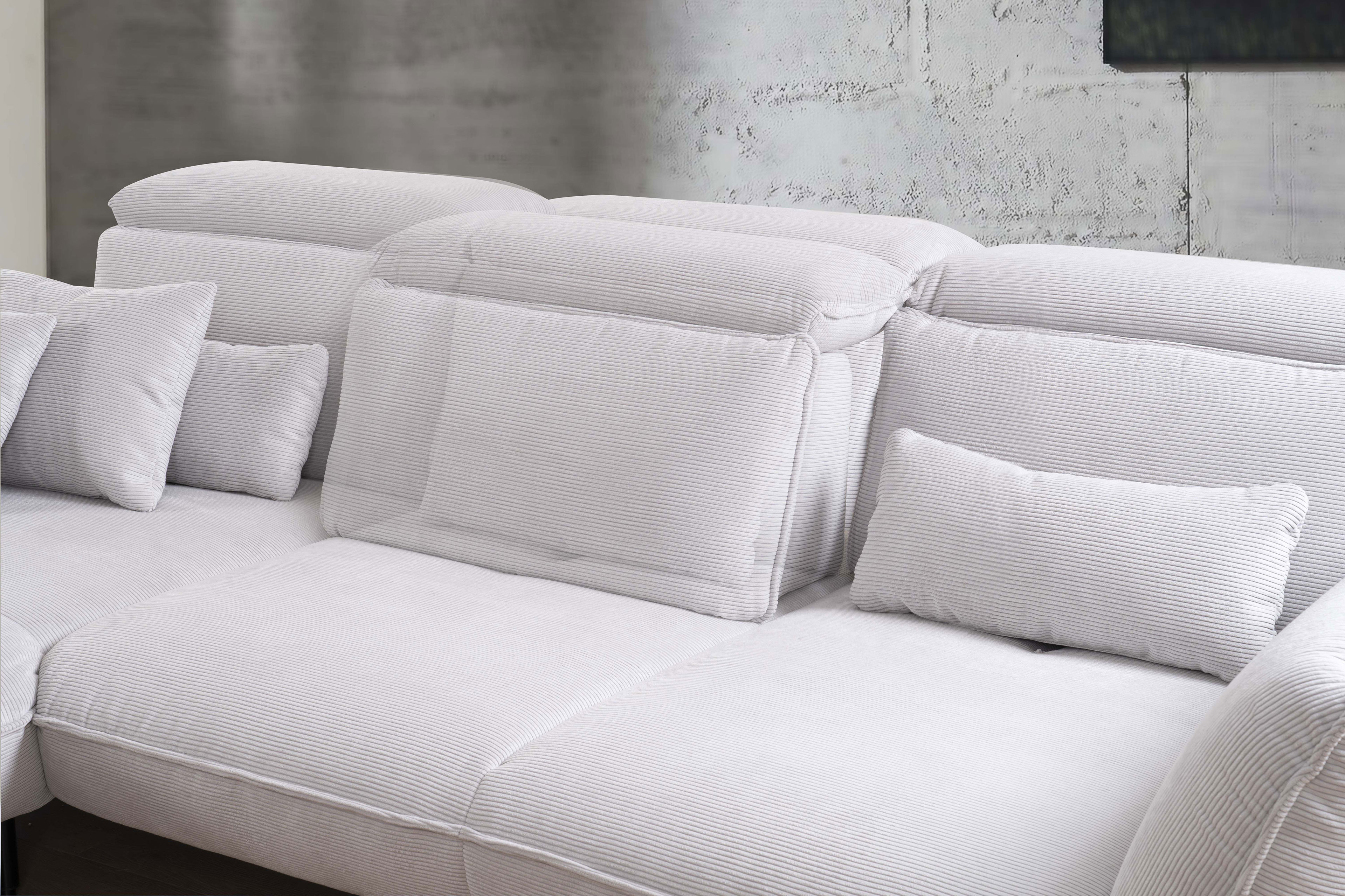 Der Hersteller Poco Polstermöbel stellt mit seinem Modell Brix eine moderne Eckgarnitur vor, welche sich aus einem Longchair sowie einem 3-Sitzer zusammensetzt und eine Wohlfühlfläche von ca. 202 x 301 cm für gemütliche Stunden im Kreise der Liebsten bietet. Gekleidet in einen stilvollen, silbernen Feincord, steht das Sofa auf eleganten schwarzen Metallfüßen und ist im Inneren mit einer angenehm weichen PUR-Schaum-Polsterung gefertigt, welche ein komfortables Liegen sowie Sitzen ermöglicht. Standardmäßig ist die Sitzgelegenheit mit einer Schwenkrückenfunktion ausgestattet, mit welcher sich die Sitztiefe von ca. 86 cm auf etwa 61 cm verkürzen lässt - nehmen Sie sich doch mal wieder ein Buch zur Hand und entspannen Sie nach Lust sowie Laune auf Ihrer neuen Errungenschaft. Gern können Sie sich unter unseren Zusatzoptionen für eine Kopfteil- und Armteilverstellung, eine komfortable Sitzhöhe von ca. 46 cm, eine Kaltschaum-Polsterung, einen Hocker oder ein zweifarbiges Bezugskleid entscheiden, damit die Couch auch ganz genau Ihren Wünschen sowie Vorstellungen entspricht und Ihr Zuhause wunderbar komplettiert. En vogue, geschmackvoll sowie bequem - Brix von Poco.
