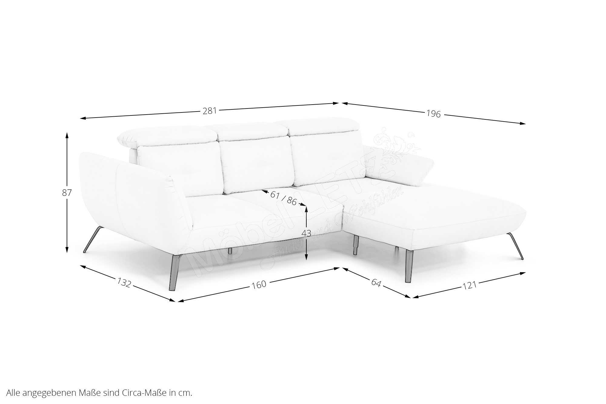 Sie sind auf der Suche nach einem gemütlichen Sofa, welches mit einem modernen Design Ihr Wohnzimmer bereichert und zudem einen angenehmen Sitzkomfort sowie ausreichend Platz bietet? Dann ist das Polstersofa Seattle aus dem Hause Poco Polstermöbel genau das Richtige. Mit einem Stellmaß von etwa 281 x 196 cm, welches sich aus einem 2-Sitzer sowie einem seitlich anschließenden Longchair zusammensetzt, schenkt die Eckgarnitur genügend Fläche für Sie und Ihre Liebsten. Beim Platznehmen überzeugt das Möbelstück mit einer erstklassigen Polsterung aus einem weichen PUR-Schaum, ruhend auf Wellenfedern, und sorgt für ein bequemes Sitzen beim Romanlesen oder Lieblingsserien schauen. Ein besonderes Highlight ist die manuell verstellbare Rückenlehne, mit welcher sich die Sitztiefe von etwa 86 cm auf ca. 61 cm verkürzen lässt und Sie so jeden Tag neu entscheiden können zwischen einer aufrechten Sitzhaltung oder entspanntem Zurücklehnen. Während die cremefarbene Microfaser sanft die Garnitur umhüllt und Ruhe sowie Geborgenheit in Ihren Räumlichkeiten bringt, setzen die schwarzen Metallfüße stilvolle Akzente. Dank der dezenten Ausstrahlung lässt sich das Sitzmöbel optimal in jeden Einrichtungsstil integrieren. Sollten Sie sich einen kräftigen Farbton wünschen oder ein anderes Material, hält unsere großzügige Bezugsübersicht verschiedene Stoff- sowie Ledervarianten mit vielfältigen Farbnuancen für Sie bereit. Mit seinem besonderen Charme wird die Poco Couch zu einer perfekten Wohlfühloase, an der Sie nach einem langen Alltag wunderbar abschalten und relaxen können - Modell Seattle.