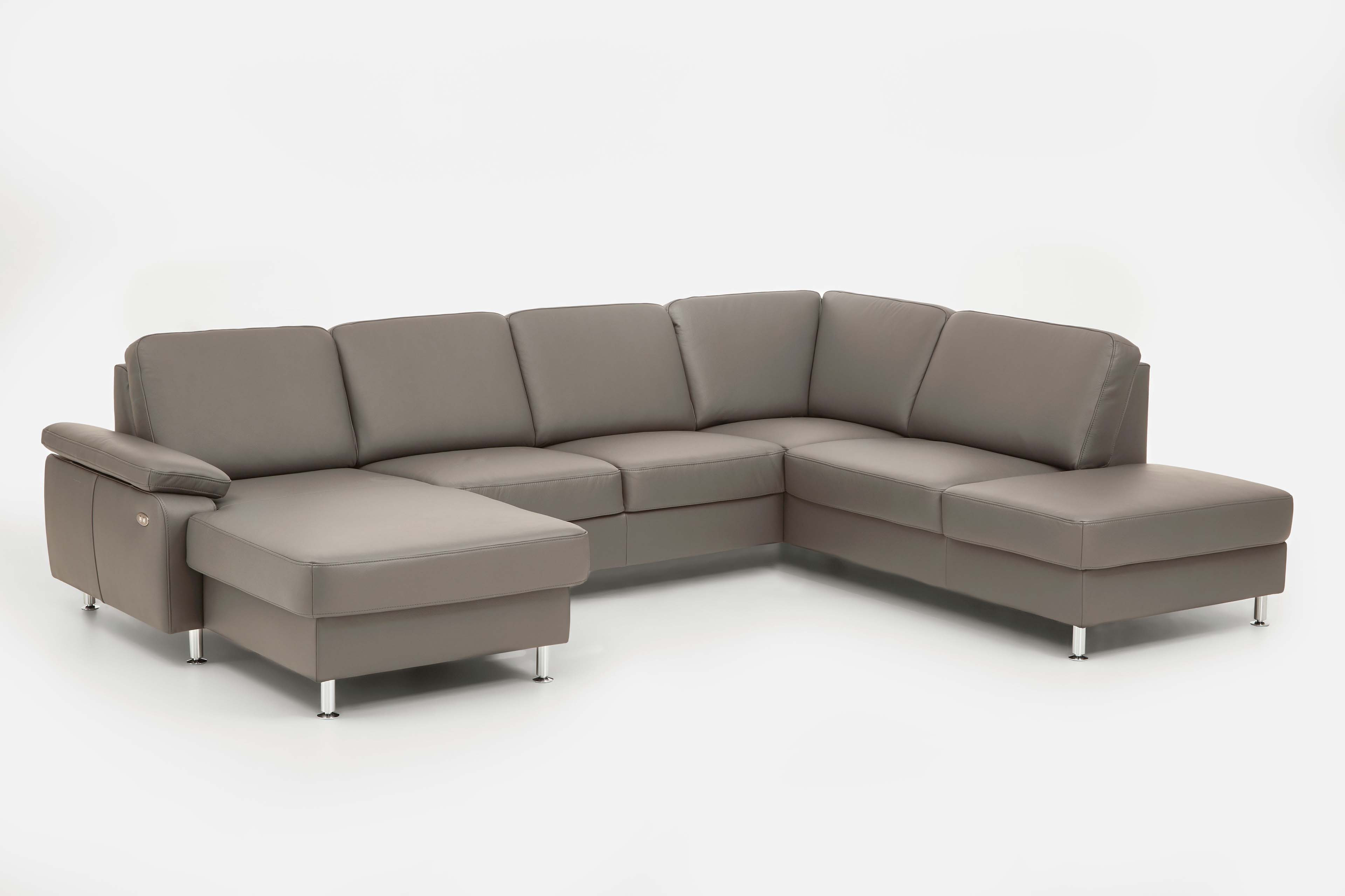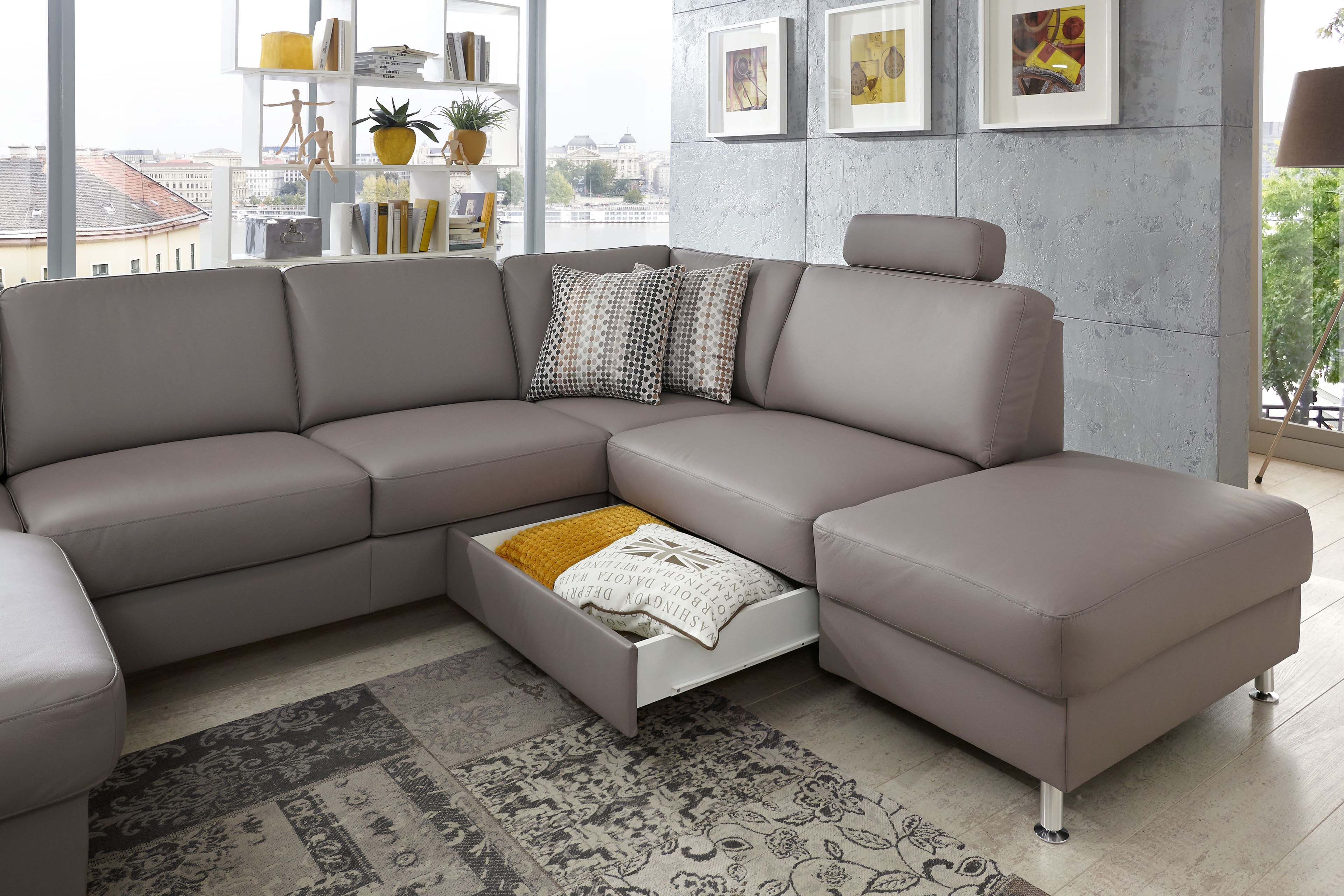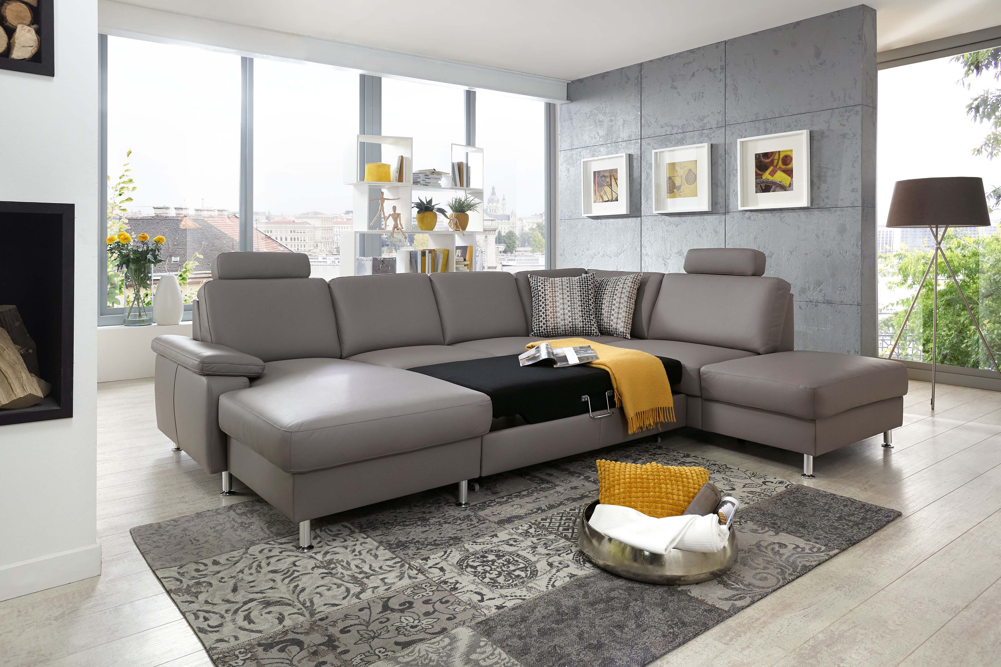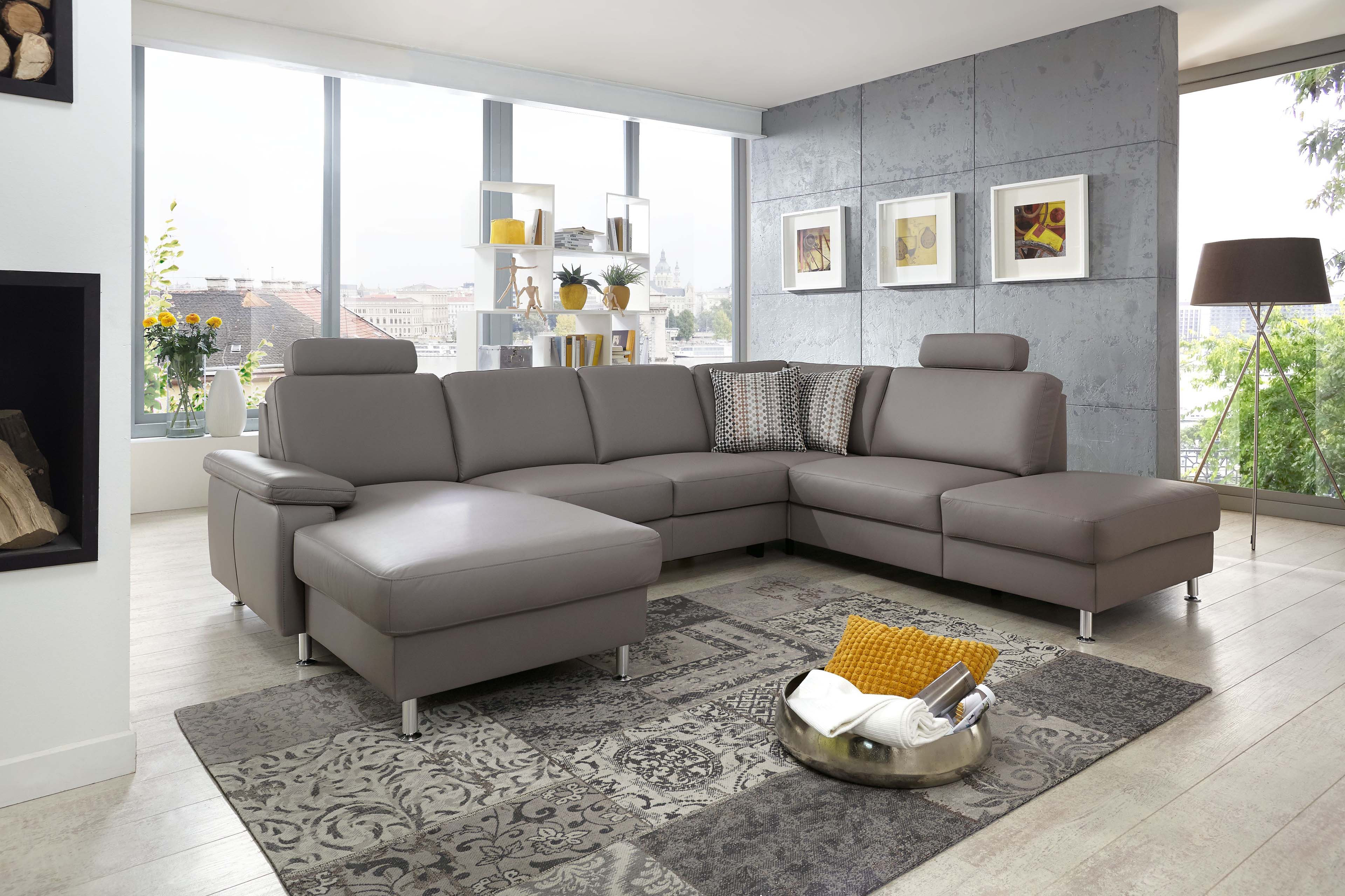 Formschönes Design, vielseitige Funktionen und ausreichend Platz für die ganze Familie - das alles bietet die traumhaft schöne Wohnlandschaft PN-EM15047 von Polinova Polstermöbel. Die u-förmige Polsterecke besteht aus einem Canape, einem 2,5-Sitzer Zwischen-Element sowie einem 1,5-Sitzer Kombi-Element mit Anstellhocker und präsentiert sich in einem hochwertigen Lederbezug im Farbton "granit" mit runden, alu gebürsteten Metallfüßen. Auf einer großzügigen Stellfläche von ca. 168 x 309 x 235 cm können Sie es sich so richtig gut gehen lassen und mit Ihren Liebsten, zum Beispiel den neuesten Hollywood Blockbuster schauen, tolle Gespräche führen, einfach eine wundervolle Zeit miteinander verbringen. Eine hochwertige Polsterung aus einem Kaltschaum auf dauerelastischen Wellenfedern garantiert Ihnen dabei besten Sitzkomfort. Die optionale Schlaffunktion, welche das Sofa mit einigen wenigen Handgriffen in eine ca. 243 x 125 cm große, gemütliche Liegewiese verwandelt, ermöglicht Ihnen die Füße in entspannter Wohlfühlatmosphäre hochzulegen oder schafft für Ihre Übernachtungsgäste zudem ein bequemes Plätzchen für die Nacht. Passend zu dieser Funktion bietet das Canape und das Kombi-Element eine Stauraum-Möglichkeit, um Decken sowie Kissen gut verstaut und stets griffbereit vor Ort zu haben. Unverzichtbar sind auch, an den Lieblingsplätzen angebrachte, in der Höhe und Neigung verstellbare Kopfstützen, diese schenken einen herrlichen Anlehnkomfort und können ebenfalls über die Zusatzoptionen zum Angebot hinzugebucht werden. Kreieren Sie Ihr neues Traumsofa für ein unverwechselbares Sitzerlebnis - PN-EM15047 von Polinova.