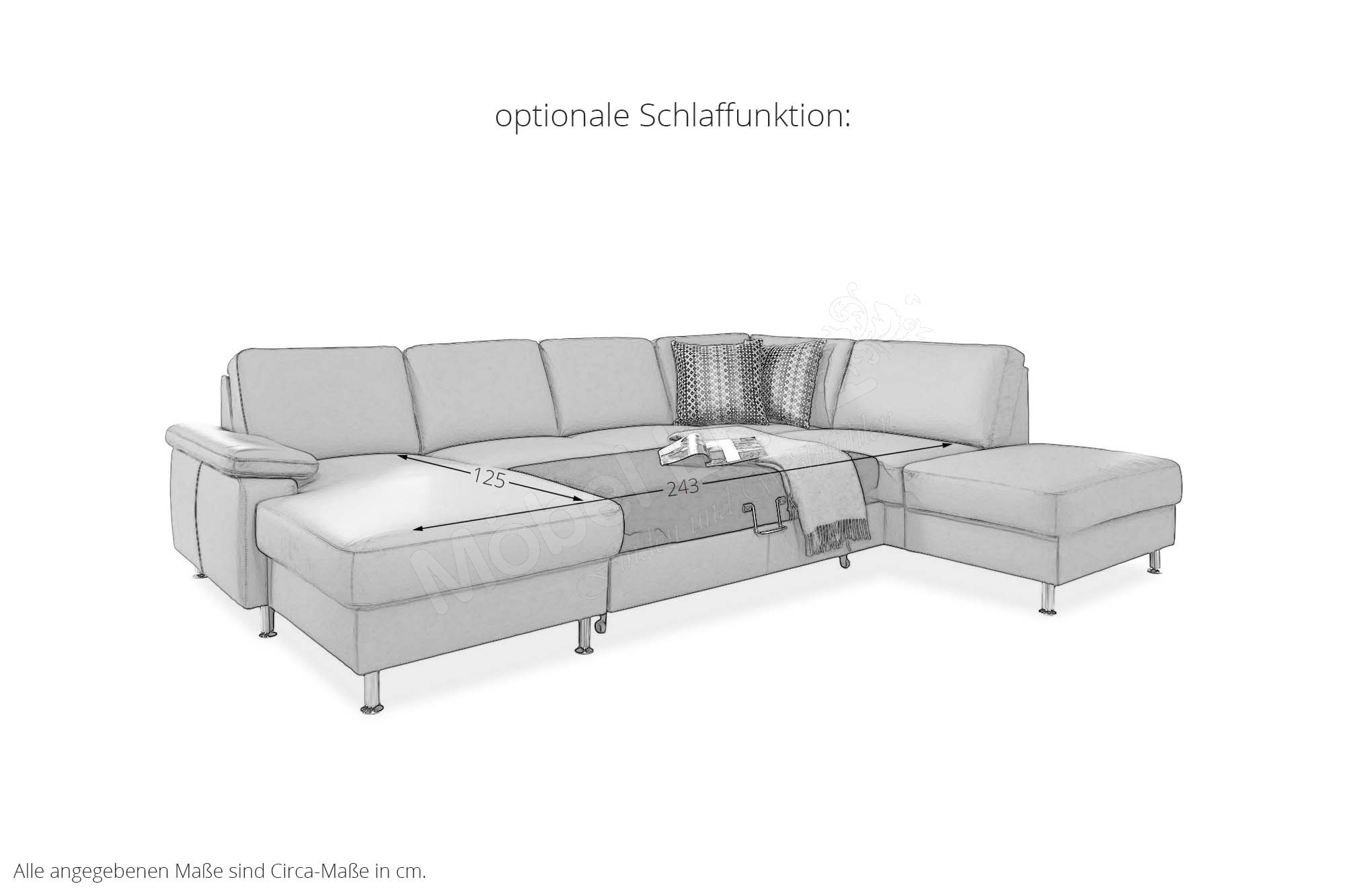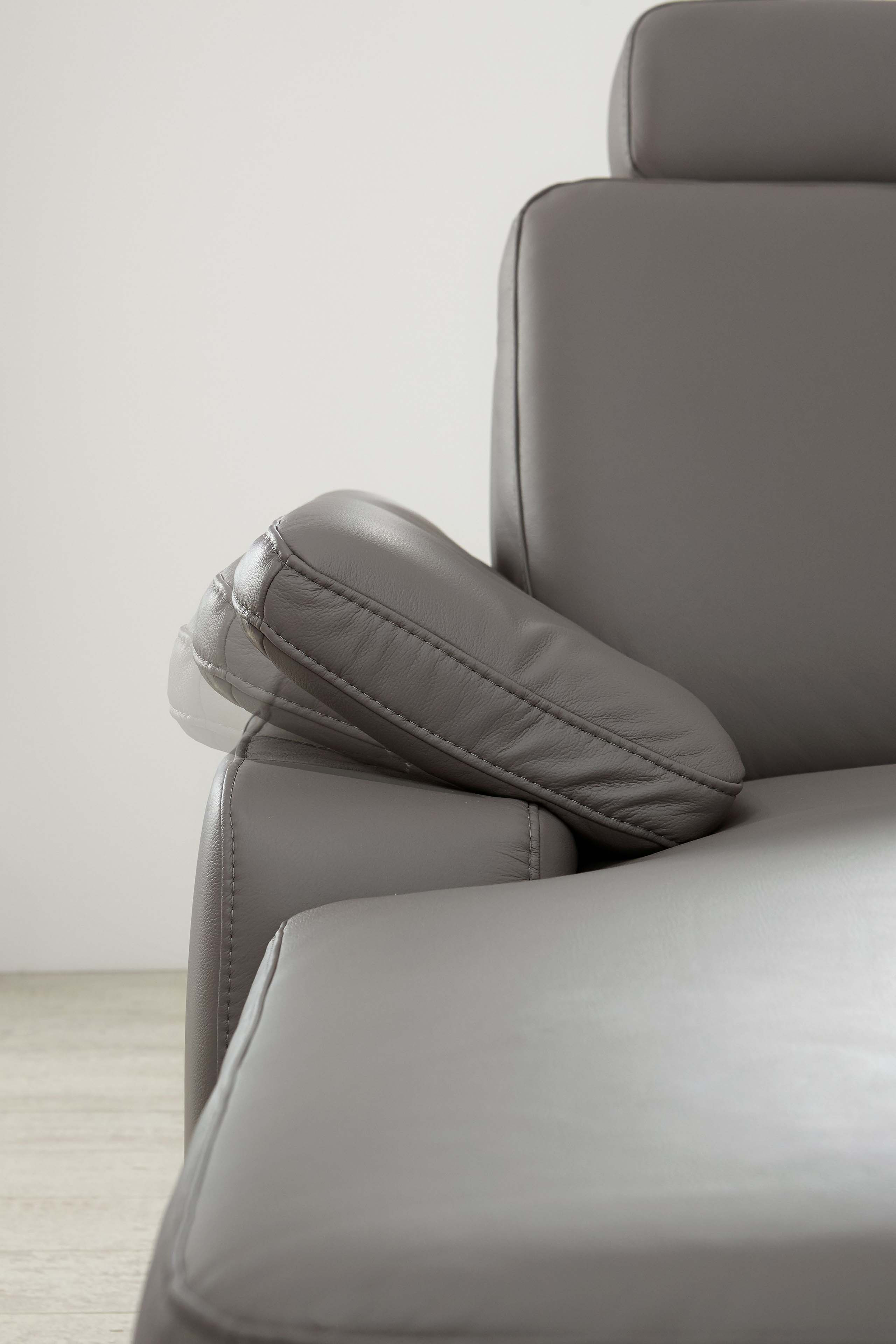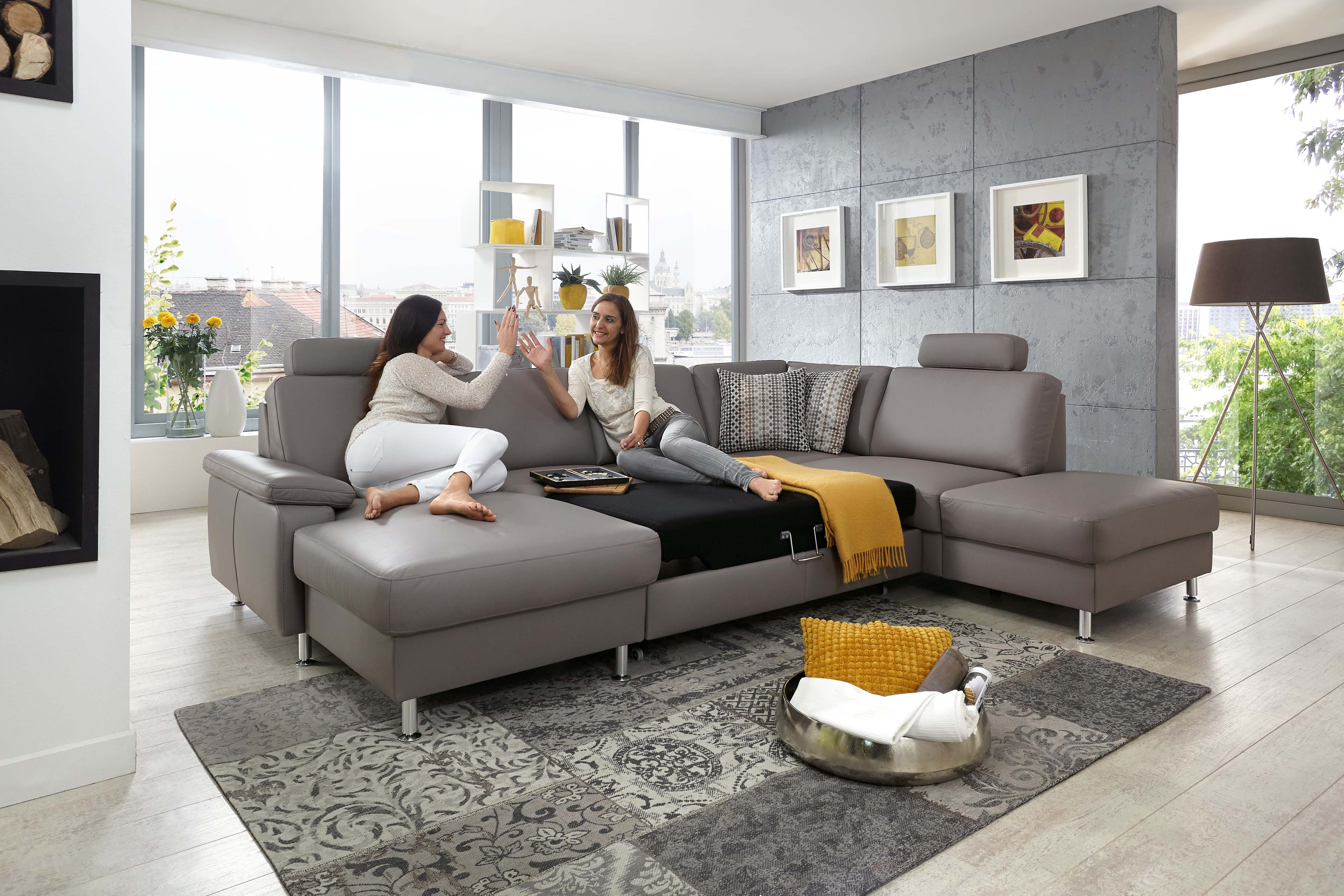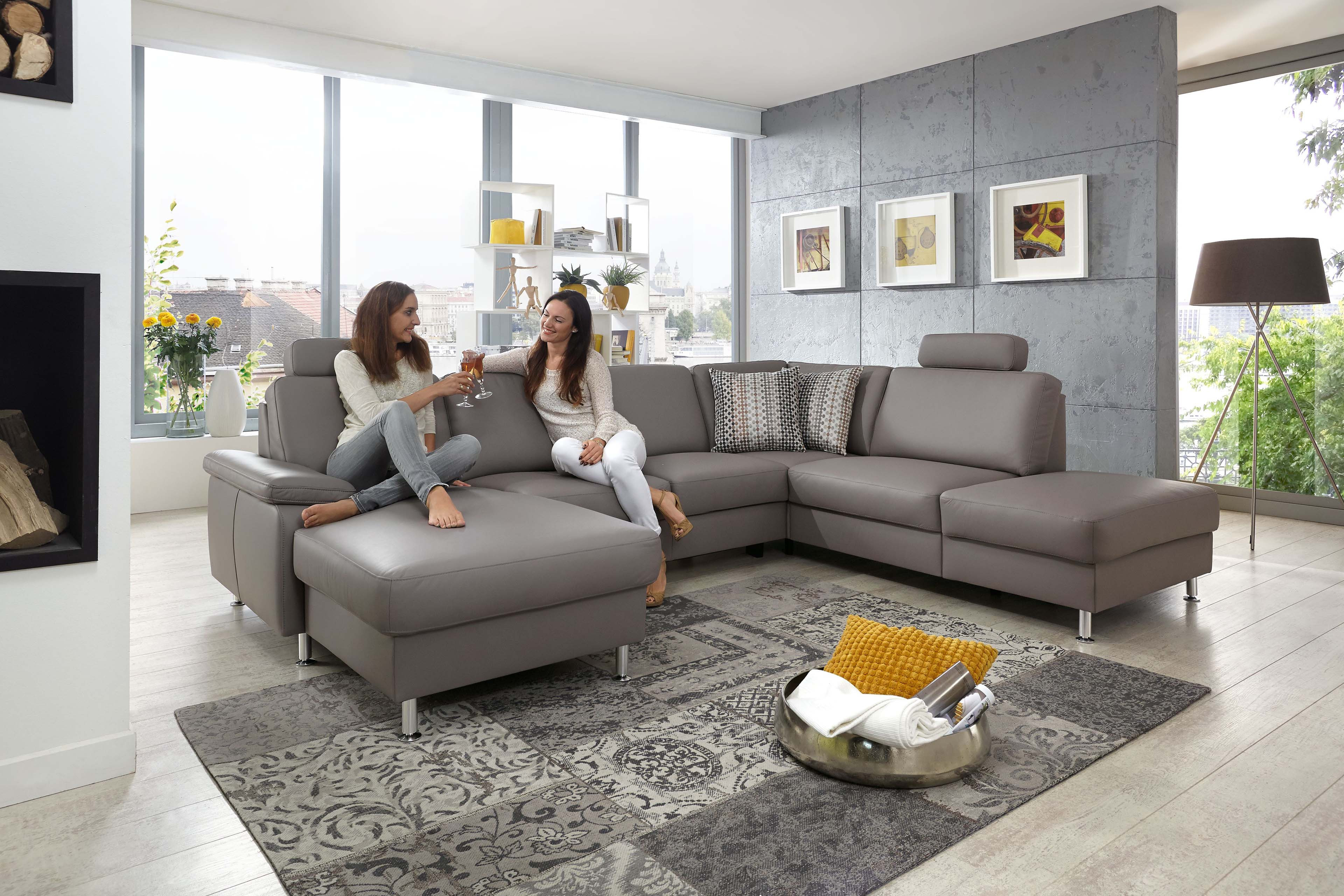 Formschönes Design, vielseitige Funktionen und ausreichend Platz für die ganze Familie - das alles bietet die traumhaft schöne Wohnlandschaft PN-EM15047 von Polinova Polstermöbel. Die u-förmige Polsterecke besteht aus einem Canape, einem 2,5-Sitzer Zwischen-Element sowie einem 1,5-Sitzer Kombi-Element mit Anstellhocker und präsentiert sich in einem hochwertigen Lederbezug im Farbton "granit" mit runden, alu gebürsteten Metallfüßen. Auf einer großzügigen Stellfläche von ca. 168 x 309 x 235 cm können Sie es sich so richtig gut gehen lassen und mit Ihren Liebsten, zum Beispiel den neuesten Hollywood Blockbuster schauen, tolle Gespräche führen, einfach eine wundervolle Zeit miteinander verbringen. Eine hochwertige Polsterung aus einem Kaltschaum auf dauerelastischen Wellenfedern garantiert Ihnen dabei besten Sitzkomfort. Die optionale Schlaffunktion, welche das Sofa mit einigen wenigen Handgriffen in eine ca. 243 x 125 cm große, gemütliche Liegewiese verwandelt, ermöglicht Ihnen die Füße in entspannter Wohlfühlatmosphäre hochzulegen oder schafft für Ihre Übernachtungsgäste zudem ein bequemes Plätzchen für die Nacht. Passend zu dieser Funktion bietet das Canape und das Kombi-Element eine Stauraum-Möglichkeit, um Decken sowie Kissen gut verstaut und stets griffbereit vor Ort zu haben. Unverzichtbar sind auch, an den Lieblingsplätzen angebrachte, in der Höhe und Neigung verstellbare Kopfstützen, diese schenken einen herrlichen Anlehnkomfort und können ebenfalls über die Zusatzoptionen zum Angebot hinzugebucht werden. Kreieren Sie Ihr neues Traumsofa für ein unverwechselbares Sitzerlebnis - PN-EM15047 von Polinova.