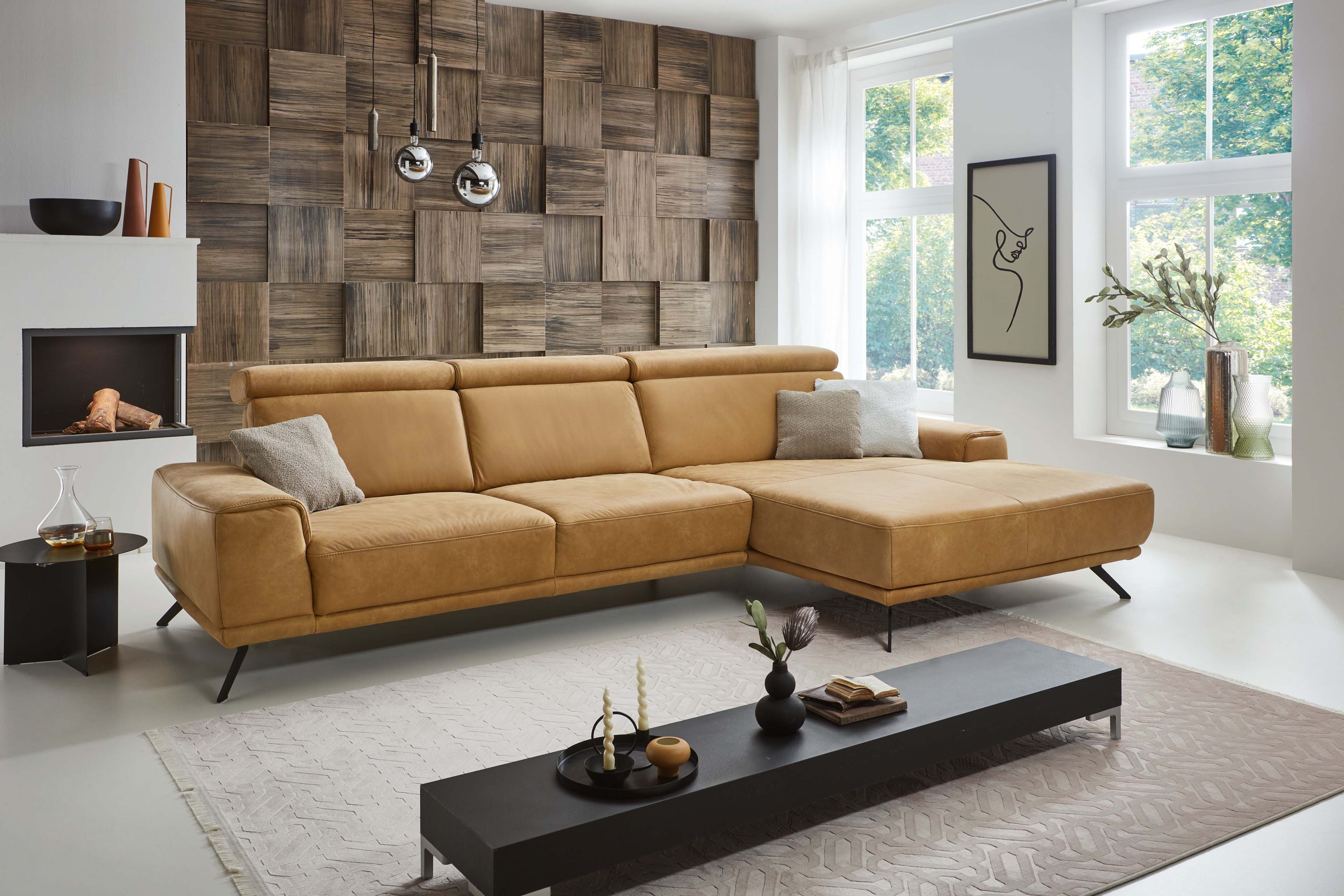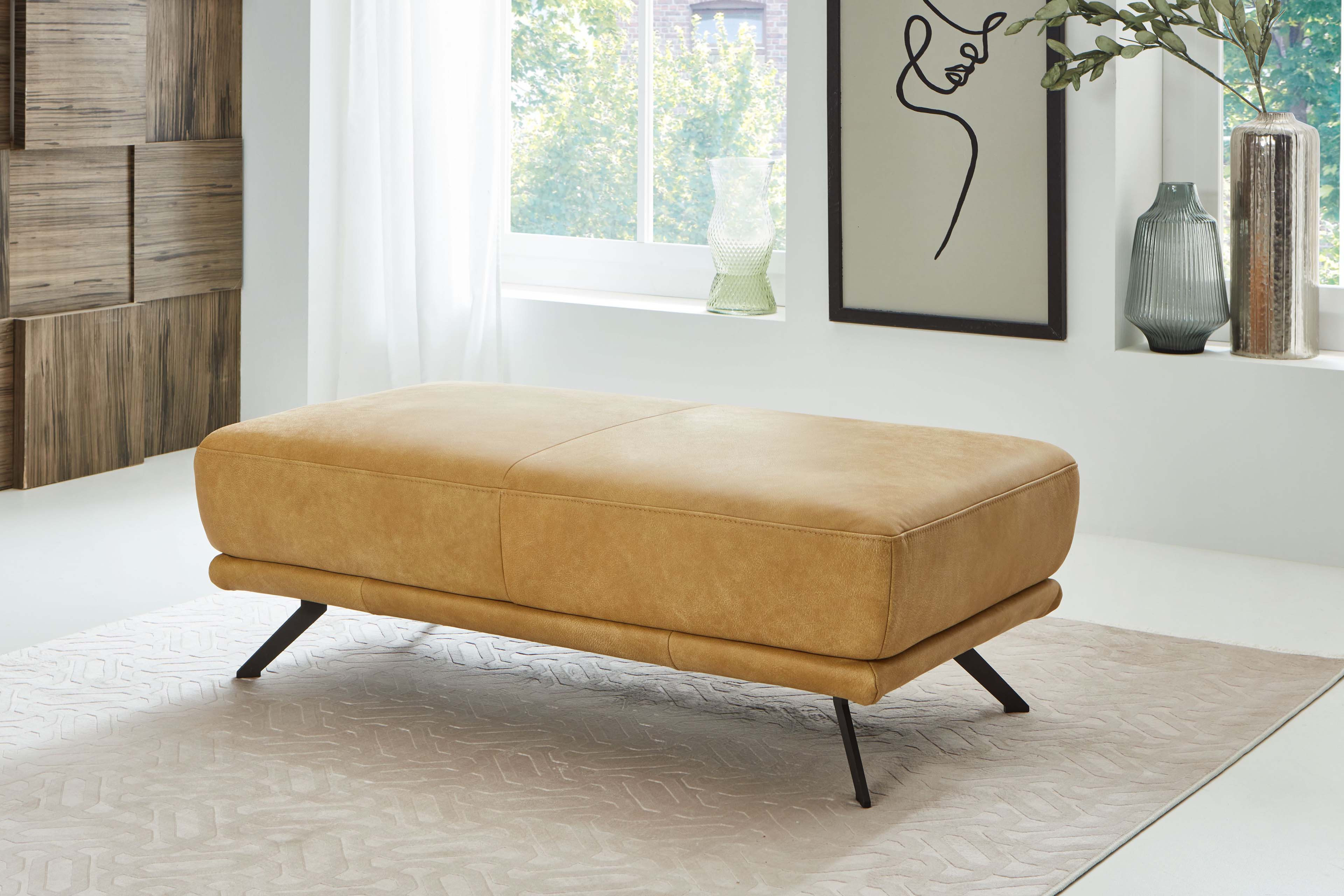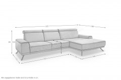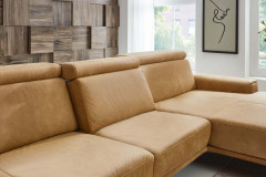 Ein elegantes und zugleich modernes Ecksofa präsentiert der namhafte sowie ausschließlich in Leder produzierende Polstermöbelhersteller Polinova mit dem Modell PN-EM22041. Die Eckgarnitur, welche sich in diesem Angebot in der Zusammenstellung aus einem 3-Sitzer sowie einem Canape präsentiert, überzeugt mit einem hochwertigen kurkumafarbenen Lederbezug, welcher mit seiner natürlichen Ästhetik für eine entspannte Atmosphäre sorgt und zum Abschalten sowie Auftanken einlädt, wird von schwarzen Metallfüßen getragen und sorgt mit einem Stellmaß von ca. 335 x 188 cm für ausreichend Platz. Neben der äußerst ansprechenden Optik erhalten Sie mit dieser Polstergarnitur besten Komfort und ein Sitzmöbel, welches sich perfekt auf Ihre Ansprüche abstimmen lässt. Angefangen bei einer hochwertigen Kaltschaumpolsterung auf dauerelastischen Wellenfedern im Sitz plus hochelastischen Polstergurten, ebenfalls mit einem Kaltschaum, im Rücken, über eine bereits inklusive Kopfteilverstellung mit Rasterfunktion für die optimale Entspannung des Kopf- und Nackenbereiches nach einem anstrengenden Tag bis hin zu einem optionalen, bis zur abgeschrägten Liegeposition motorisch verstellbaren Canape sowie einer Sitztiefenverstellung ist alles dabei - so wird das Polinova Sofa garantiert zum idealen Begleiter, aber auch zu einem Ort, an dem man sich geborgen fühlt und gern seine freie Zeit verbringt. Über die Zusatzoptionen haben Sie weiterhin die Möglichkeit, den Rücken in Leder echt zu beziehen, aus zwei Sitzhöhen und zwei Fußausführungen zu wählen oder einen passenden Hocker sowie Kissen in unterschiedlichen Ausführungen direkt mitzubestellen. Nehmen Sie sich Zeit und stellen Sie sich Ihre neue Polstergarnitur ganz nach Ihren Wünschen sowie auf Ihre Bedürfnisse zugeschnitten direkt über den Artikel oder mit Hilfe unseres Polsterplaners zusammen. Vielseitig und individuell - PN-EM22041 von Polinova.