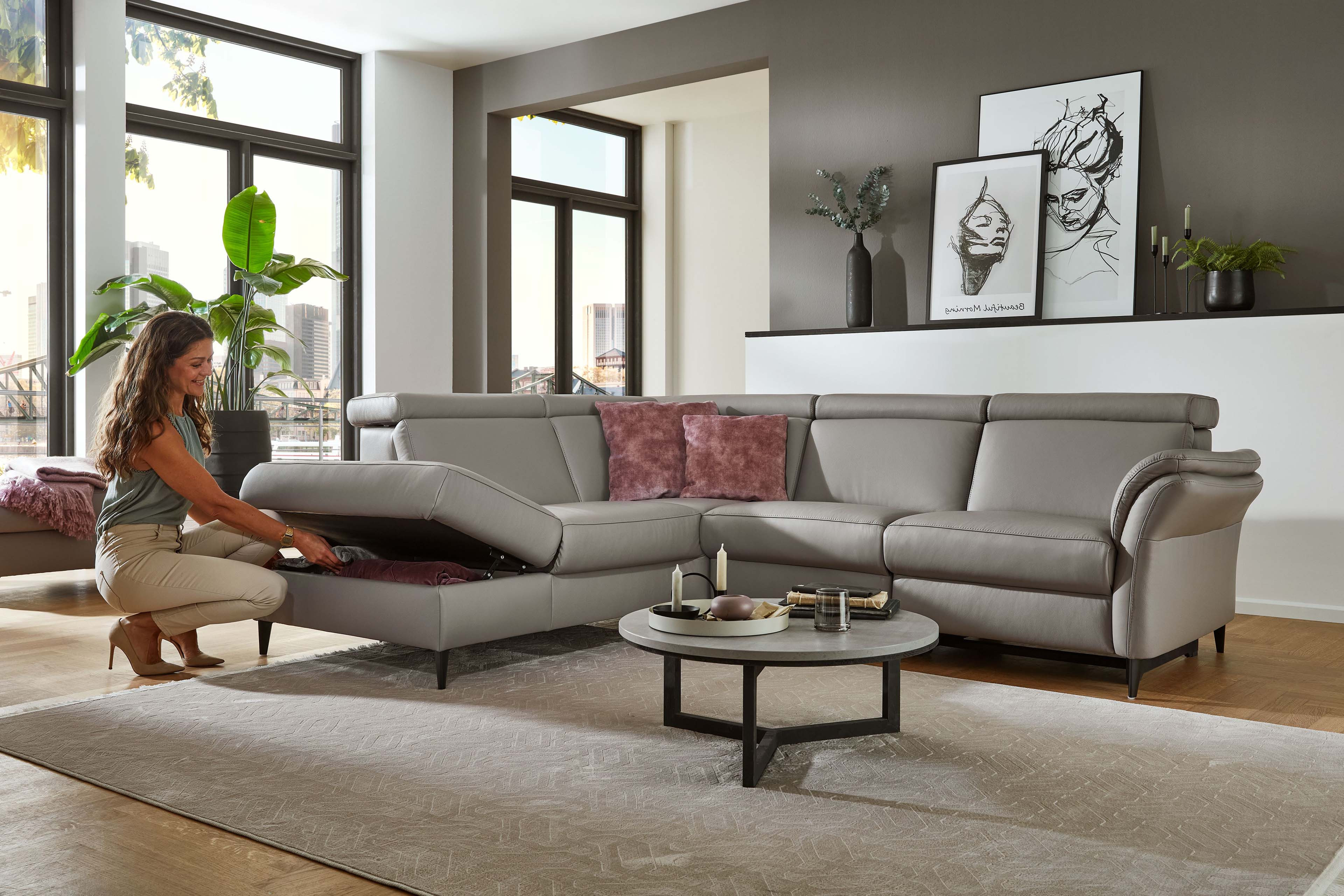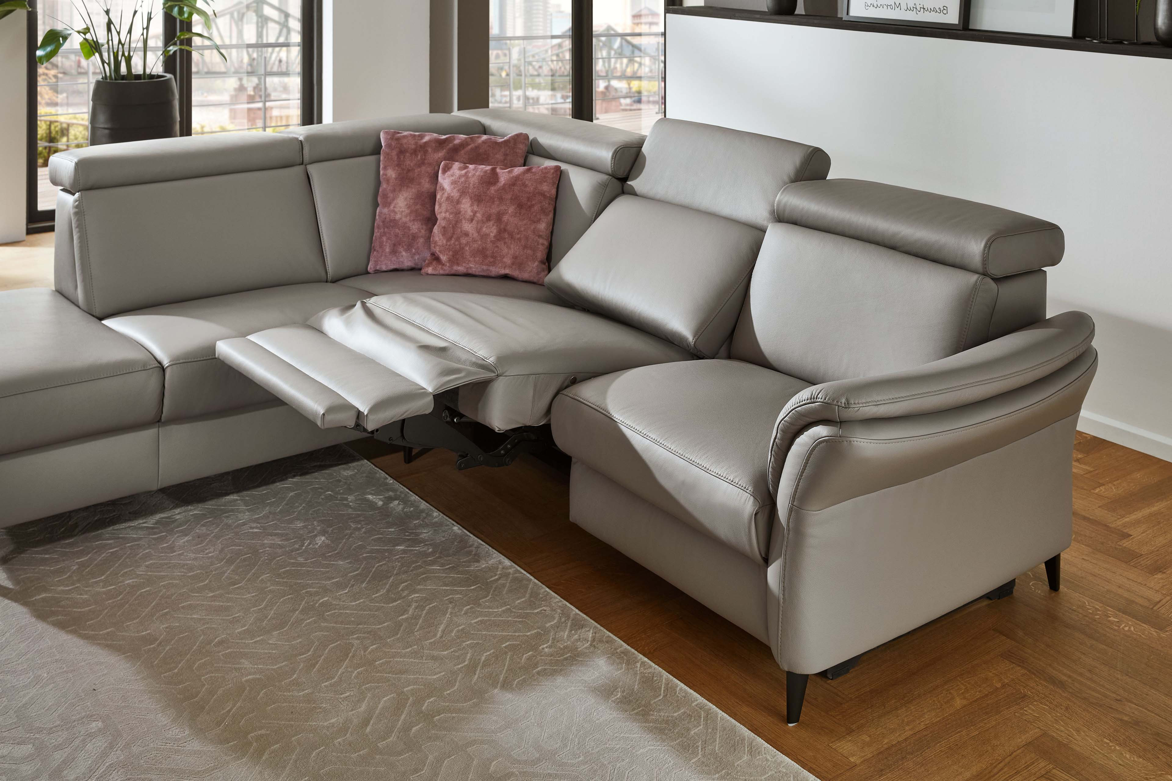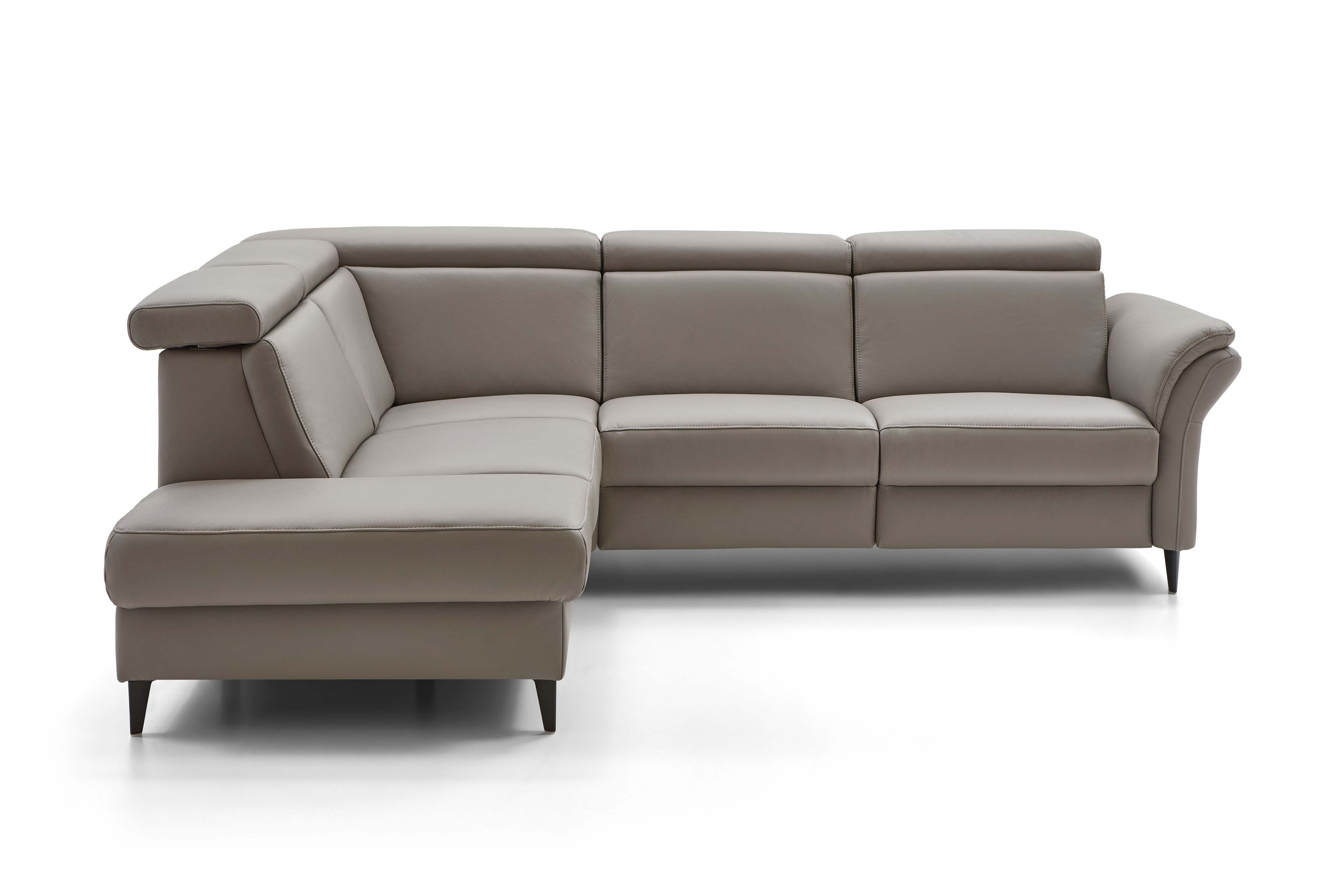Mit der eleganten Ledergarnitur PN-EM24034, welche sich in diesem Angebot in einem grauen Leder mit schwarzen Metallfüßen zeigt, präsentiert der namhafte Polstermöbelhersteller Polinova ein äußerst vielseitiges, komfortables sowie qualitativ hochwertiges Polstermöbel zum Sitzen, Ausruhen, Relaxen, aber auch um auf diesem mit Ihren Liebsten wundervolle Momente zu verbringen. Harmonisch und einladend begeistert die Garnitur hier in der ca. 209 x 257 cm großen Eckzusammenstellung, bestehend aus einem 1-Sitzer Kombi-Element mit Anstellhocker sowie einem 2,5-Sitzer mit Armlehne, und überzeugt nicht nur mit ihren Äußerlichkeiten, denn die charmante Polsterecke punktet weiterhin mit einem Polsteraufbau aus einem hochwertigen Polyätherschaum auf dauerelastischen Wellenfedern sowie einer angenehmen Sitzhöhe von ca. 45 cm und schenkt Ihnen, Ihrer Familie, Freunden oder Bekannten zu jeder Zeit einen exzellenten Sitzkomfort. Auch mit optionalen Funktionen sowie passendem Zubehör und einer riesigen Typenvielfalt weiß die Polinova Polstergarnitur zu begeistern. So können Sie zum Beispiel eine 1-motorige oder 2-motorige WallAway-Funktion, eine Stauraumfunktion, eine Kopfteil- und Armteilverstellung, einen passenden Hocker sowie Zierkissen unter den Zusatzoptionen wählen und die Polsterecke so zu Ihrer neuen Wohlfühlinsel gestalten. Auch das zukünftige Outfit lässt sich ganz einfach mit dem Punkt "Wunschbezug - Farbe ändern" festlegen oder Sie nutzen ganz einfach unseren Polsterplaner und planen sich PN-EM24034 aus dem Hause Polinova ganz einfach sowie unkompliziert nach Ihren Wünschen und Vorstellungen.
