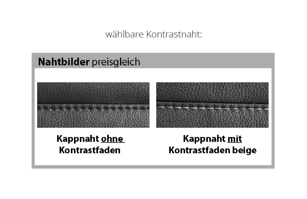 Bei der Auswahl eines Stoffbezuges ändert sich das Nahtbild in Doppelsteppnaht mit Kontrastfaden beige.