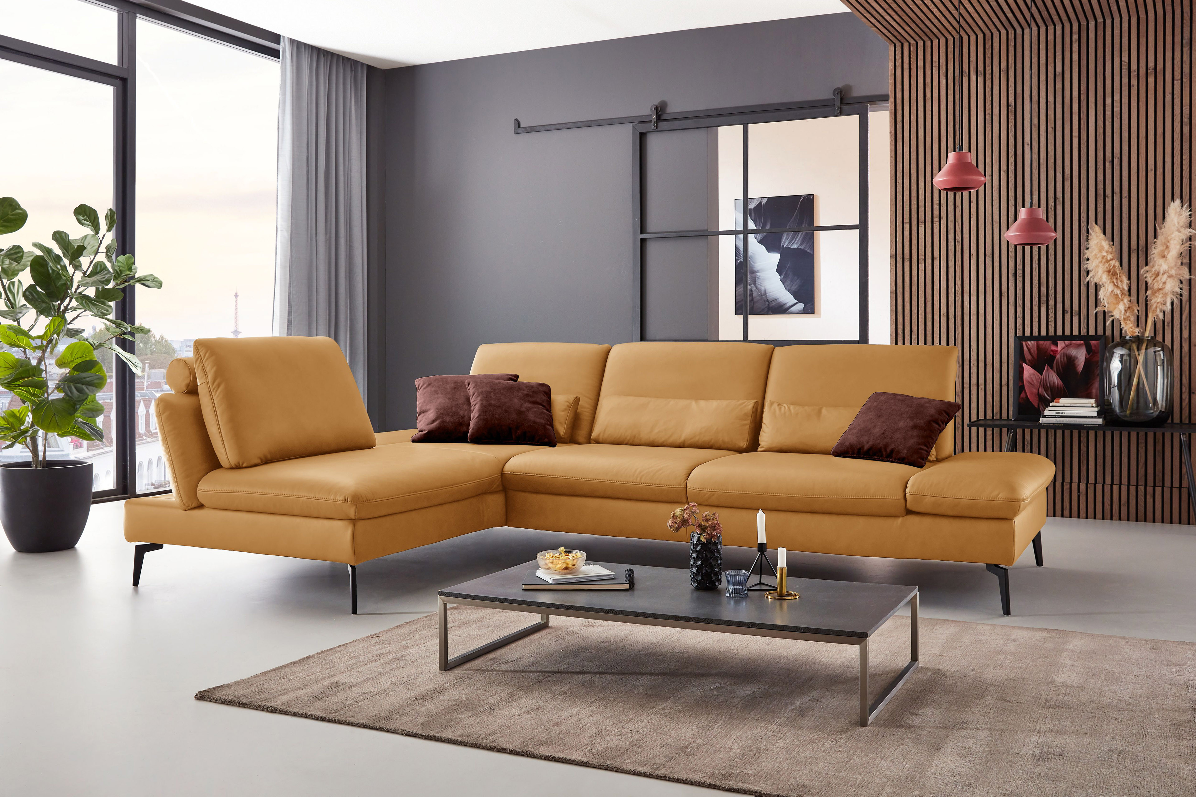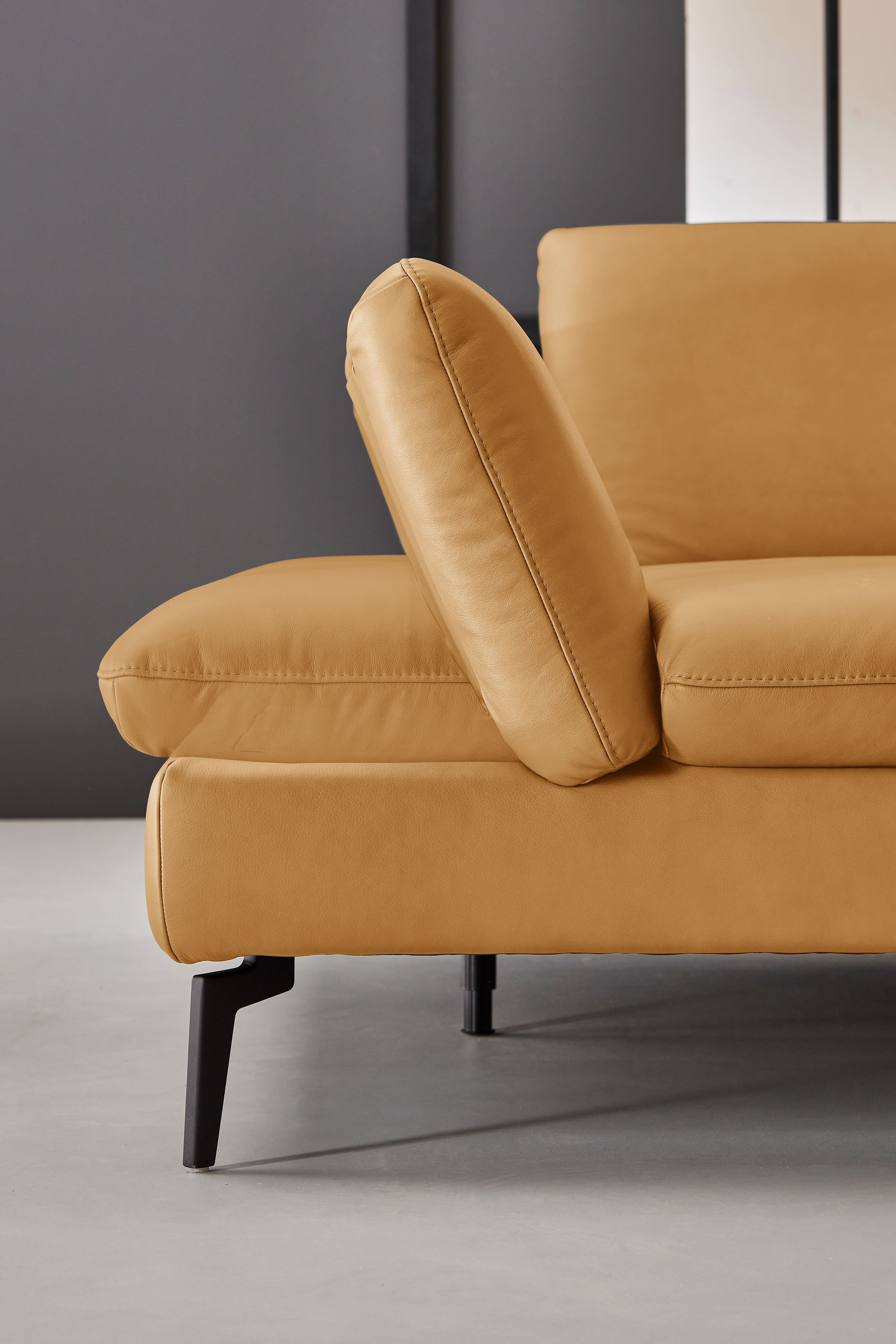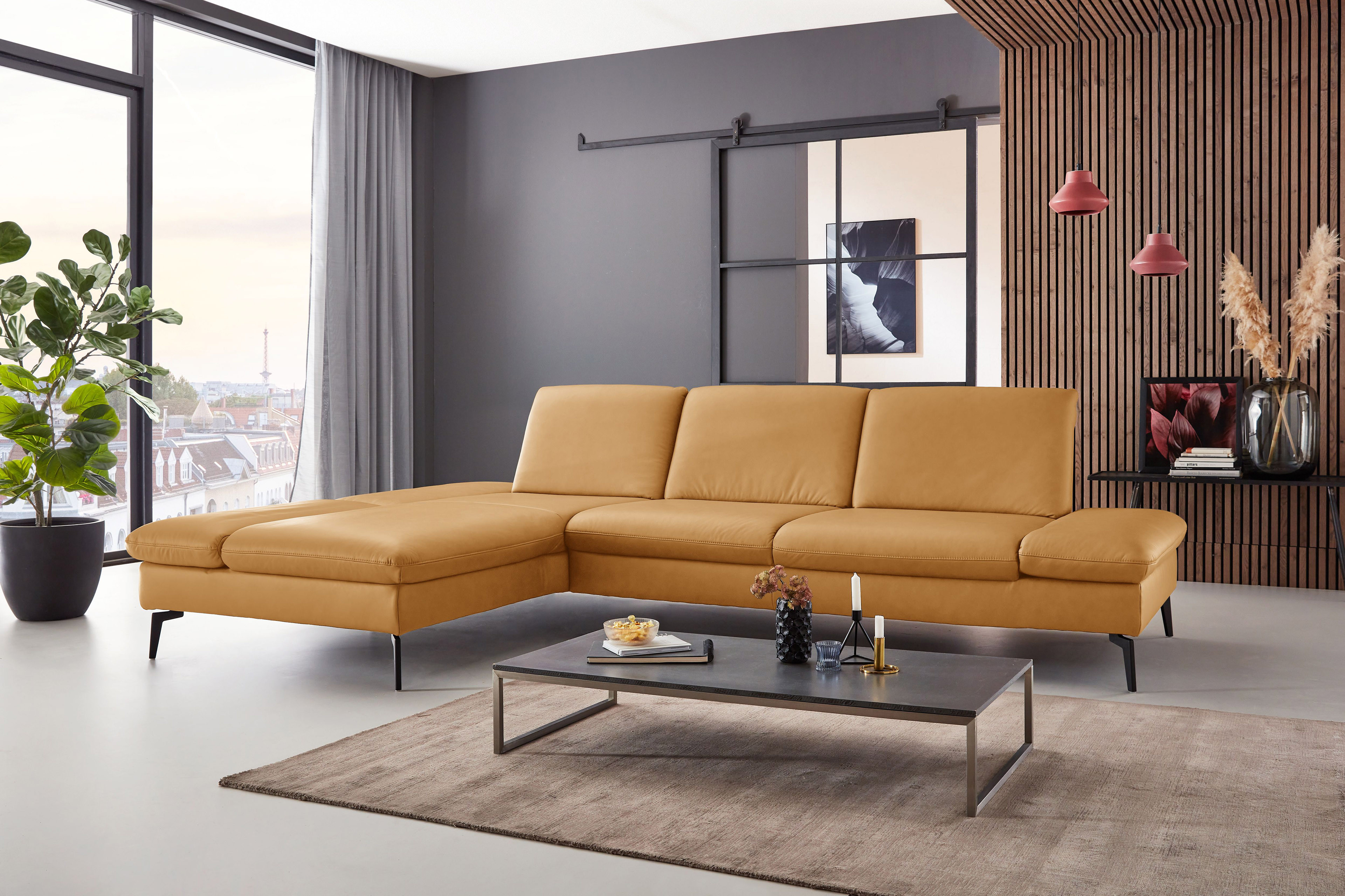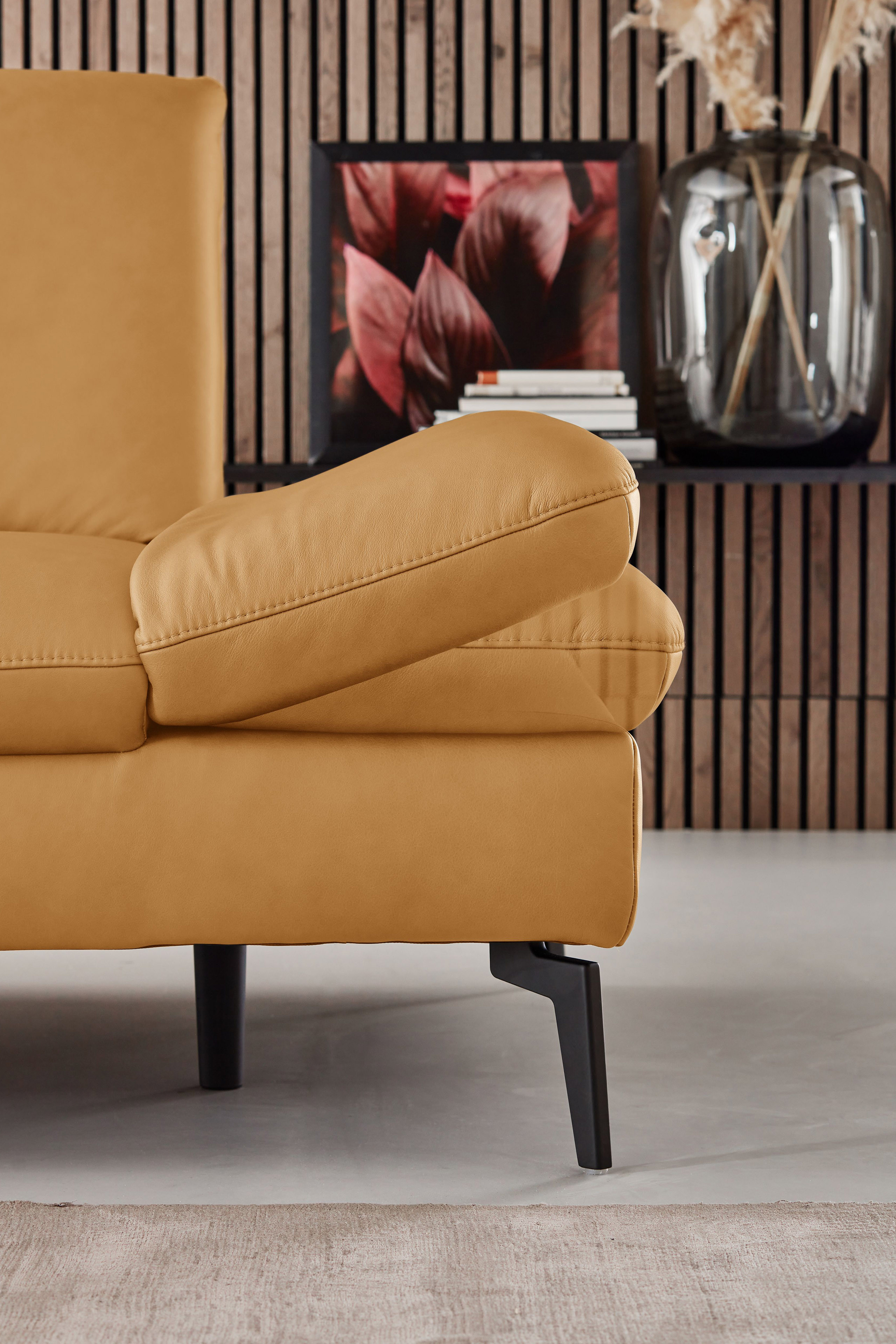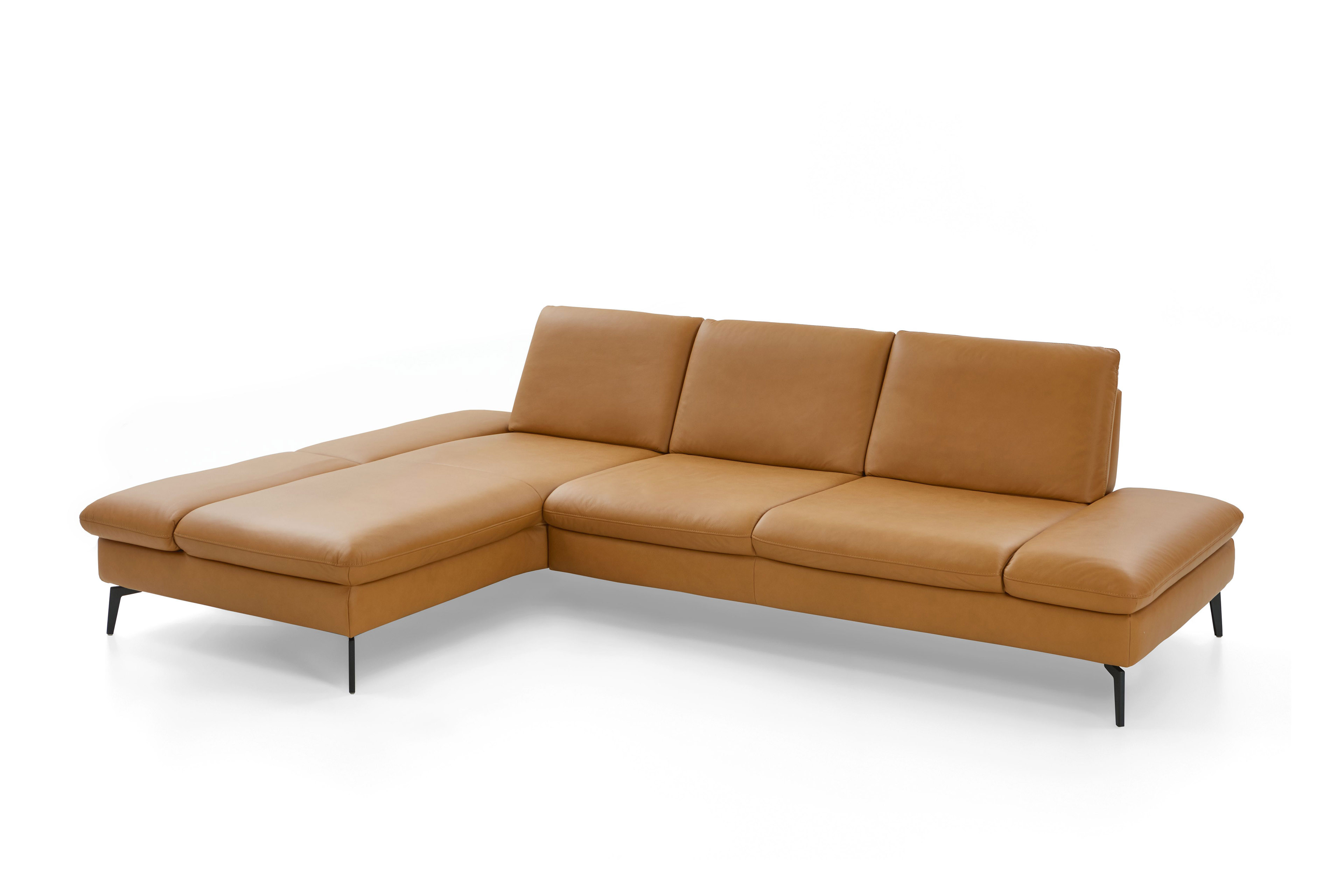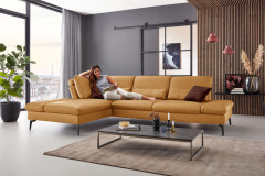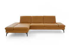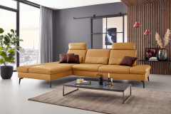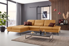 PN-IN23099 von Polinova - ein modernes, aber auch sehr elegantes Ecksofa, bestehend aus einem Longchair mit doppelter Armlehne und einem 3-Sitzer. Im hochwertigen Semianilinleder in der Farbe "kurkuma", welches sich nicht nur allein durch seine angenehm weiche Haptik und sein edles Erscheinungsbild auszeichnet, sondern bei dem auch natürliche Merkmale sowie Strukturen größtenteils erhalten bleiben, präsentiert sich die Eckgarnitur harmonisch und einladend im wunderschönen Design mit schlanken, schwarzen Metallfüßen. Diese geben der ca. 199 x 317 cm großen Polstergarnitur so viel Bodenfreiheit, dass sogar der Saugroboter problemlos unter dem Sofa seine Arbeit verrichten kann, lassen das Polstermöbel aber auch luftig-leicht und nicht zu schwer wirken. Doch nicht nur äußerlich stimmt einfach alles, auch was den Komfort angeht, kann sich das Modell absolut sehen lassen. Die beiden Seitenteile des Longchairs können modelltypisch mittels einer Rasterverstellung in verschiedene Positionen eingestellt werden, wobei das hintere Armteil komplett nach oben gestellt und zusammen mit dem optional erhältlichen Kissen mit Rolle eine gemütliche sowie kuschelige Ecke und das vordere Armteil, mit oder ohne Kissen mit Rolle, einen weiteren bequemen Sitzplatz schafft. Zudem besteht die Möglichkeit, die Garnitur mit einer Sitztiefenverstellung für eine weitere, verkürzte Sitztiefe und mit einer Armteilverstellung für den 3-Sitzer auszustatten, einen passenden Hocker, Kopfstützen, Nieren- sowie Zierkissen in gewünschter Anzahl hinzuzubuchen und aus zwei Sitzhöhen sowie zwei Polsterungen die für Sie passende zu wählen. Dieses Polstermöbel-Programm bietet in Sachen Flexibilität, Kombinations- sowie Bezugsvielfalt viel Gestaltungsfreiraum und ist in weiteren Zusammenstellungen sowie Farben mithilfe unseres Polsterplaners oder unserer Einrichtungs-Experten lieferbar - PN-IN23099 aus dem Hause Polinova.