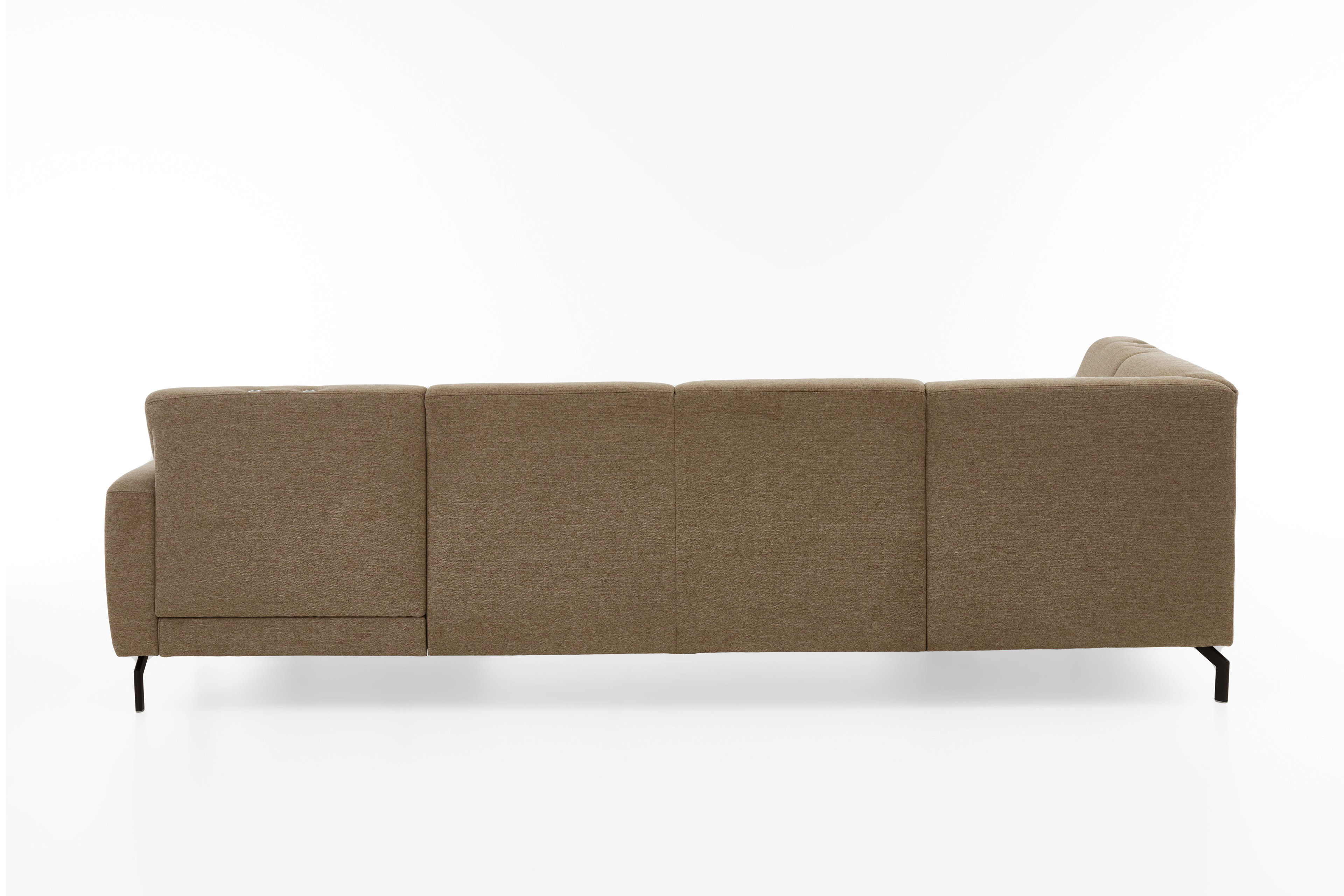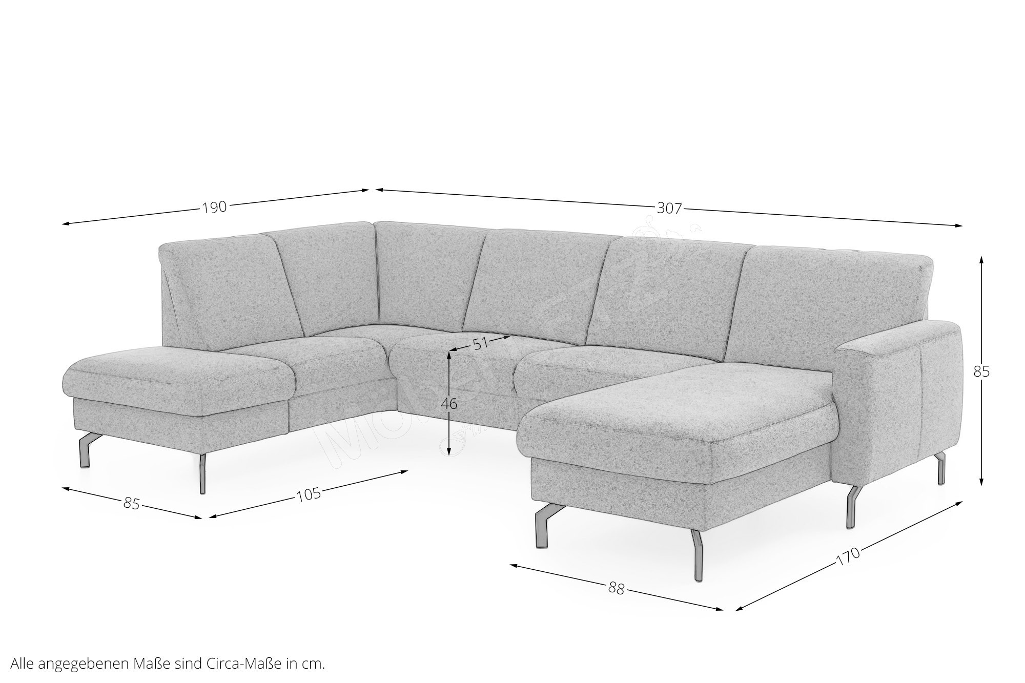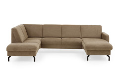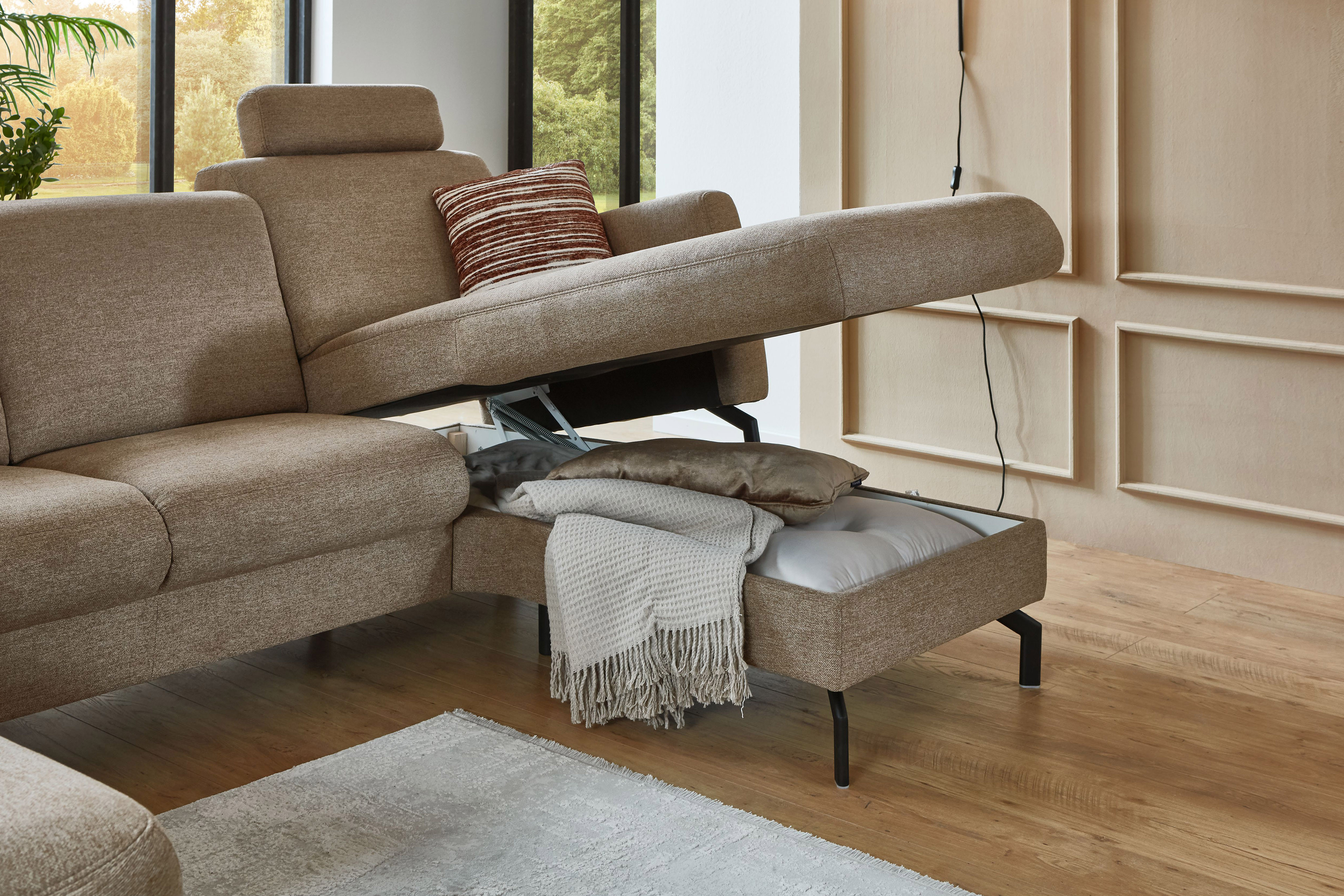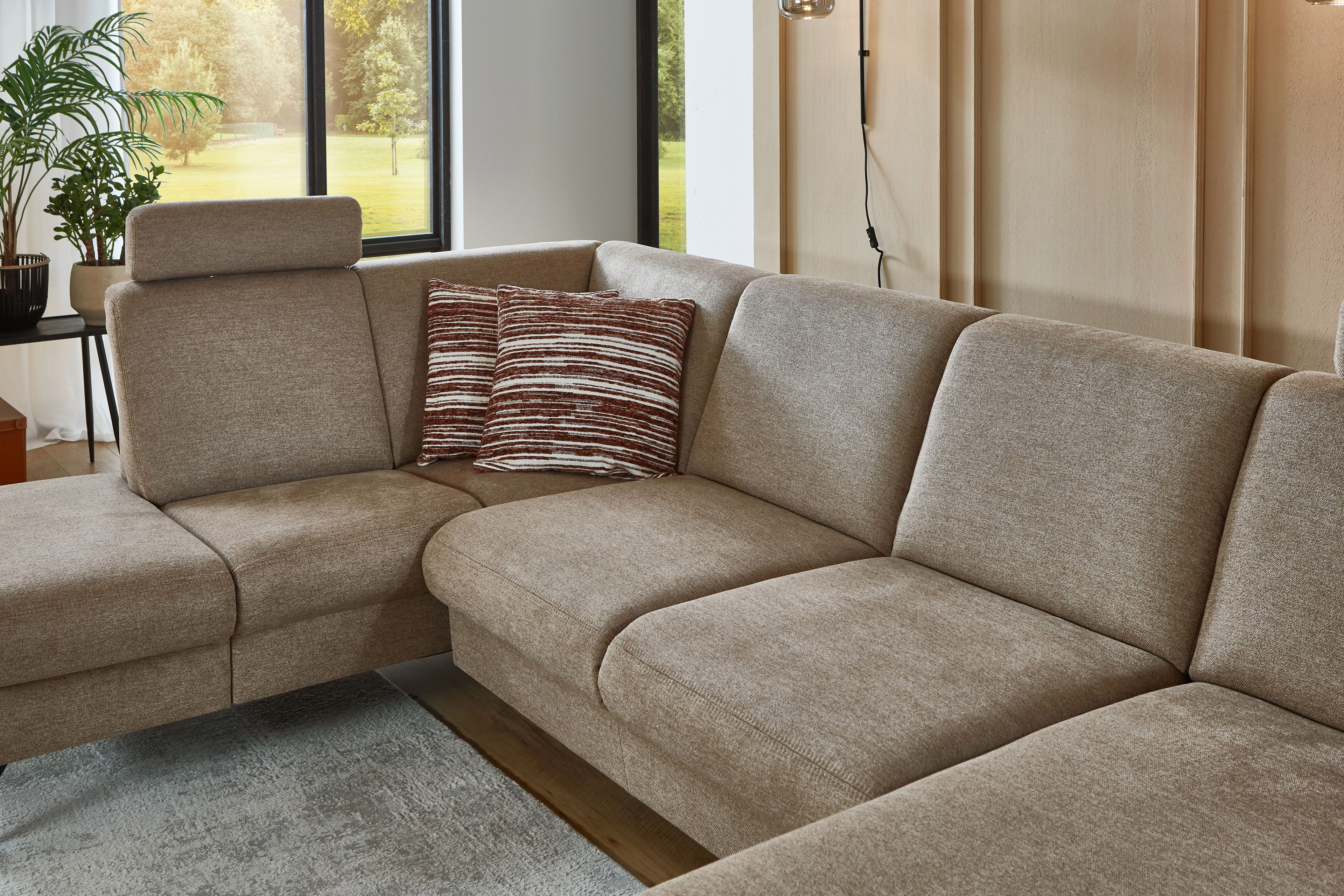 Eine komfortable Polstergarnitur, die Ihnen geruhsame Entspannungsmomente und ein herrliches Sitzerlebnis beschert, erhalten Sie mit dem zeitlosen Modell PP-PF25099 von Polipol Polstermöbel. Klar reduziertes Design, ohne viel Schnörkel und Tamtam, sowie perfekt proportionierte Formen und viel Bodenfreiheit charakterisieren die aus einem 1-Sitzer Kombi-Element mit Anstellhocker, einem 2,5-Sitzer Zwischen-Element sowie einem Canape mit Armlehne bestehende Wohnlandschaft, welche mit einem großzügigen Stellmaß von ca. 190 x 307 x 170 cm ausreichend Sitz- und Entspannungsfläche bietet. Bezogen in einem angenehm weichen Flachgewebe in der Farbe "mandel" sowie stehend auf schwarzen Metallfüßen bereichert das u-förmige Sofa Ihr heimisches Wohnambiente mit natürlichem, aber auch modernem Charme und harmoniert perfekt mit fast jedem Einrichtungsstil. Aber nicht nur in puncto Optik kann das Modell überzeugen, auch funktionale Annehmlichkeiten, die über die Zusatzoptionen buchbar sind, sowie eine auf dauerelastischen Wellenfedern ruhende, hochwertige Kaltschaumpolsterung gestalten die Garnitur zu einer wahren Wohlfühloase, wo Sie sich nicht nur in aller Ruhe bei einem gemütlichen Sitzkomfort die Tageszeitung zu Gemüte führen können, auch unterhaltsame Gespräche mit Freunden oder die gemeinsame Zeit mit der Familie am Abend werden hier garantiert zur Lieblingsbeschäftigung. Optional lässt sich das Zwischen-Element mit einer manuellen oder motorischen Vorziehbank, die eine erweiterte Sitzfläche um ca. 13 cm oder ca. 16 cm ermöglicht, das Canape und das Kombi-Element mit einer praktischen Stauraumfunktion ausstatten sowie die komplette Polstergarnitur mit in der Höhe und Neigung verstellbaren Kopfstützen sowie dekorativen, kuscheligen Zierkissen ergänzen. Wählen Sie weiterhin aus zwei verschiedenen Sitzhöhen und Sitzqualitäten, unterschiedlichen Fußausführungen sowie in der Bezugsübersicht unter dem Punkt "Farbe ändern" Ihren Favoriten aus und gestalten Sie sich Ihr Wunschmöbel ganz nach Ihren Vorstellungen. PP-PF25099 aus dem Hause Polipol - eine Bereicherung für jeden Wohnraum.