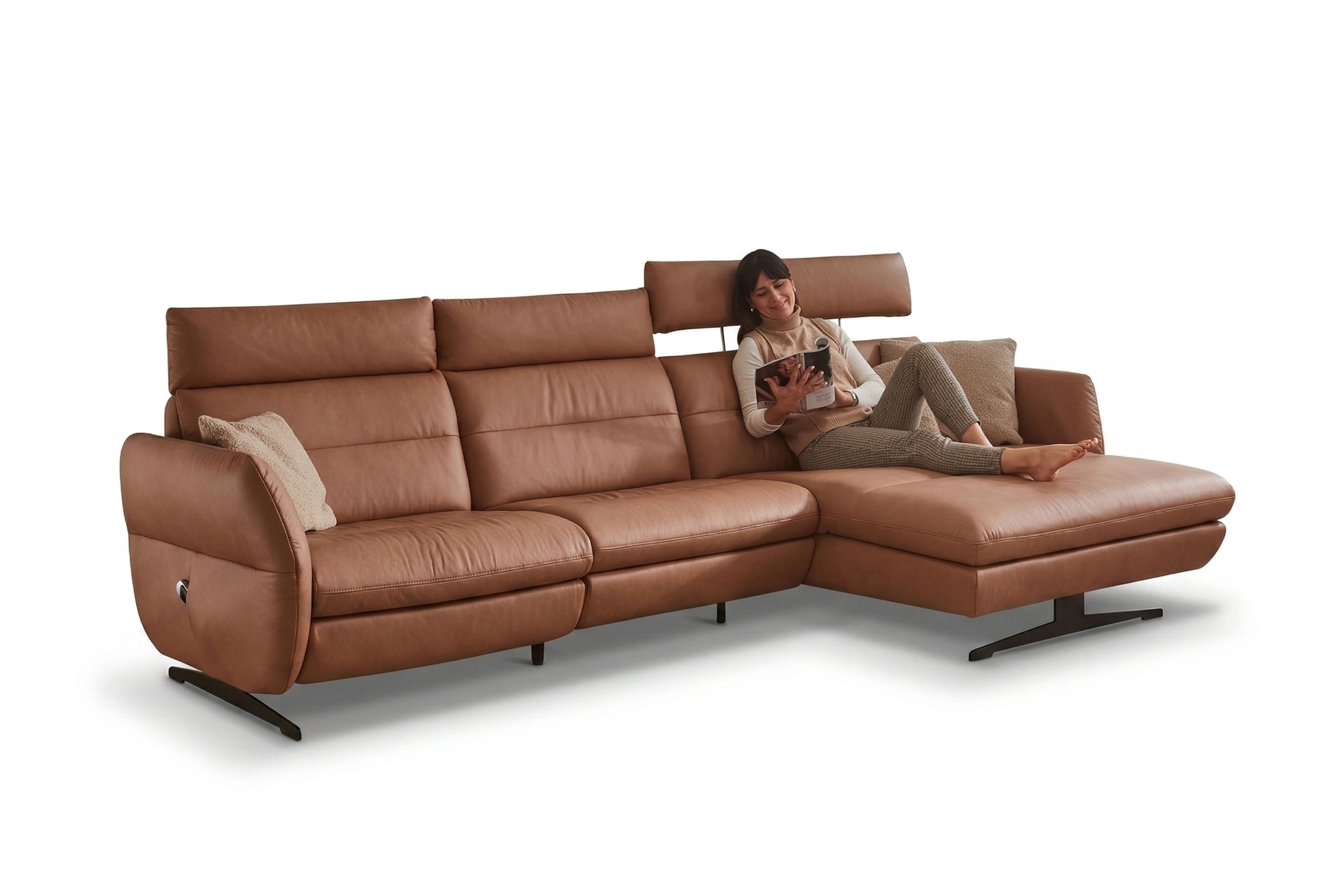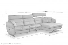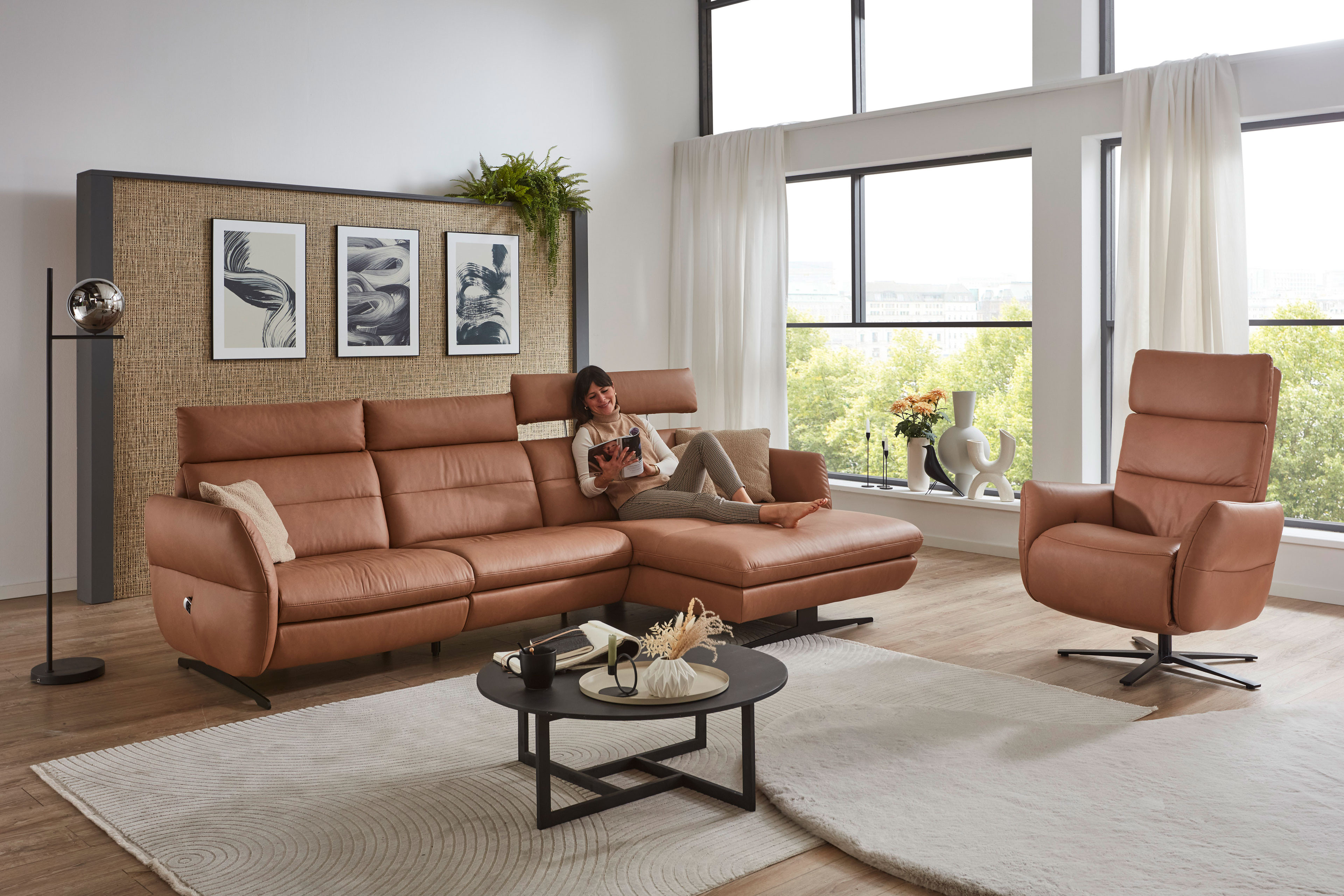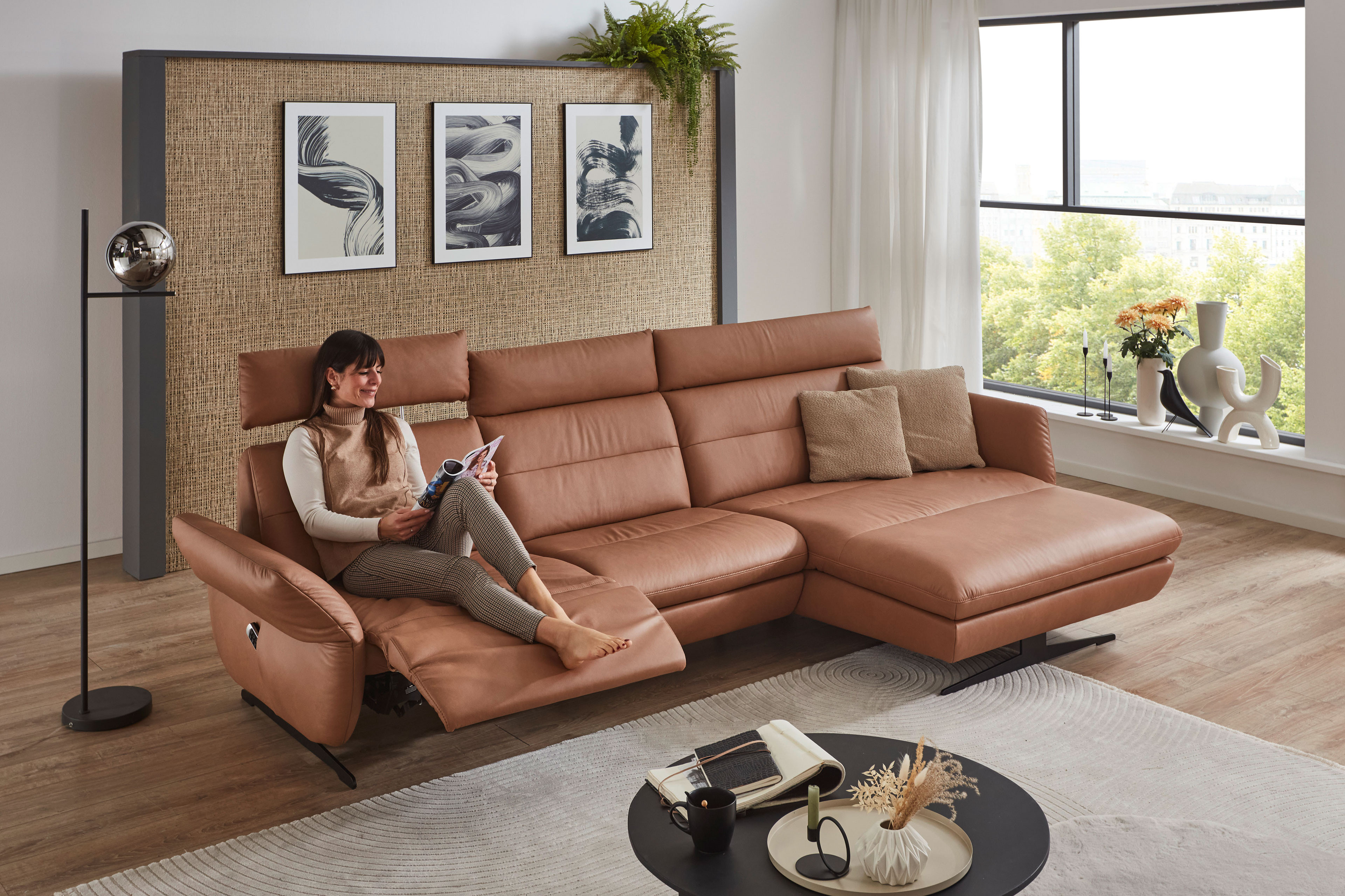Schon auf den ersten Blick begeistert die Polstergarnitur Manu-LE26 von Polsteria mit ihrer klaren Linienführung und ihrer einladenden Weichheit. Die großzügige Form lädt dazu ein, den Alltag hinter sich zu lassen - sei es beim Lesen, Entspannen oder beim geselligen Beisammensein. Im Inneren der Garnitur erwartet Sie eine bequeme Polsterung aus hochwertigem PUR-Schaum auf Wellenfedern. Diese sorgt für ein Sitzgefühl, das Sie täglich aufs Neue begeistern wird. Mit einer angenehmen Sitzhöhe von etwa 44 cm, auf Wunsch auch in 47 cm erhältlich, passt sich das Sofa ideal Ihren individuellen Komfortansprüchen an. Die elegante schwarze Metallkufe verleiht dem Design eine moderne Leichtigkeit. Gleichzeitig sorgt die Bodenfreiheit, die durch die Füße entsteht, für eine luftige Optik und eine leichtere Reinigung - ein Detail, das Schönheit und Funktionalität perfekt vereint. Großzügig geplant, besteht das Sofa aus einem komfortablen 1-Sitzer mit Armlehne, einem Zwischenelement sowie einem einladenden Longchair. Mit dem daraus hervorgehenden Stellmaß von circa 300 x 157 cm bietet das Möbelstück reichlich Platz zum Ausstrecken und Wohlfühlen. Für noch mehr Komfort lässt sich die Polstercouch individuell erweitern: Genießen Sie zum Beispiel eine motorische TV-Funktion, bei der Sie Rücken- und Fußteil bequem per integriertem Bedienfeld bis zur entspannten Liegeposition verstellen können. Zudem können Sie die Polsteria Garnitur mit einer klappbaren Armlehne oder die Kopfstützen mit einer manuellen oder motorischen Verstellung ausstatten. Ob in edlem Leder oder in einem der zahlreichen Stoffbezüge - Manu-LE26 aus dem Hause Polsteria passt sich Ihrem Wohnstil optimal an und wird zum Herzstück Ihres Zuhauses.