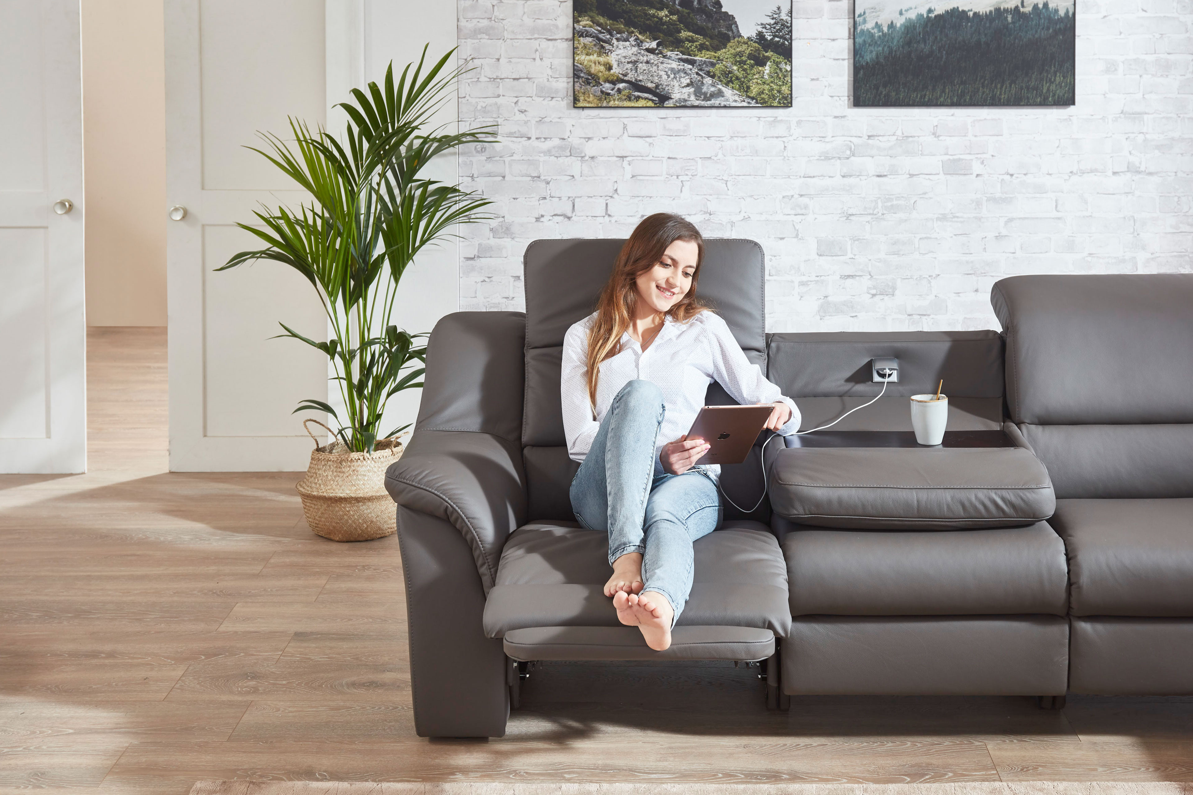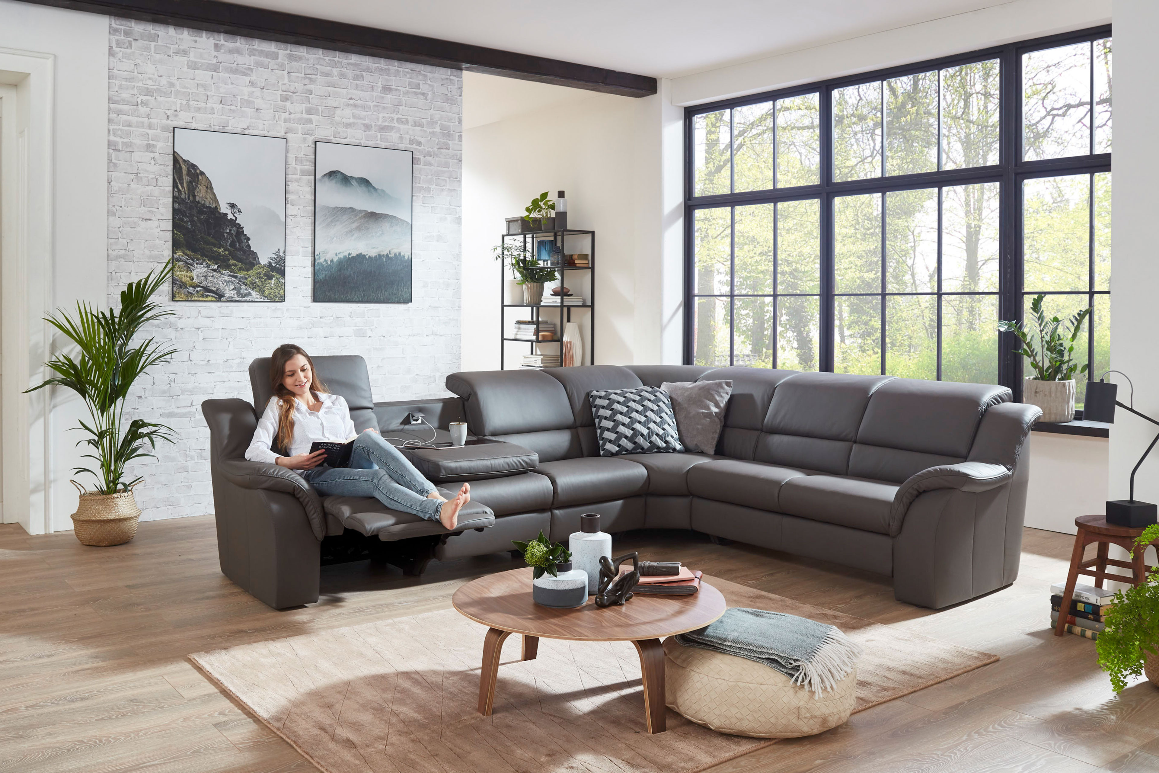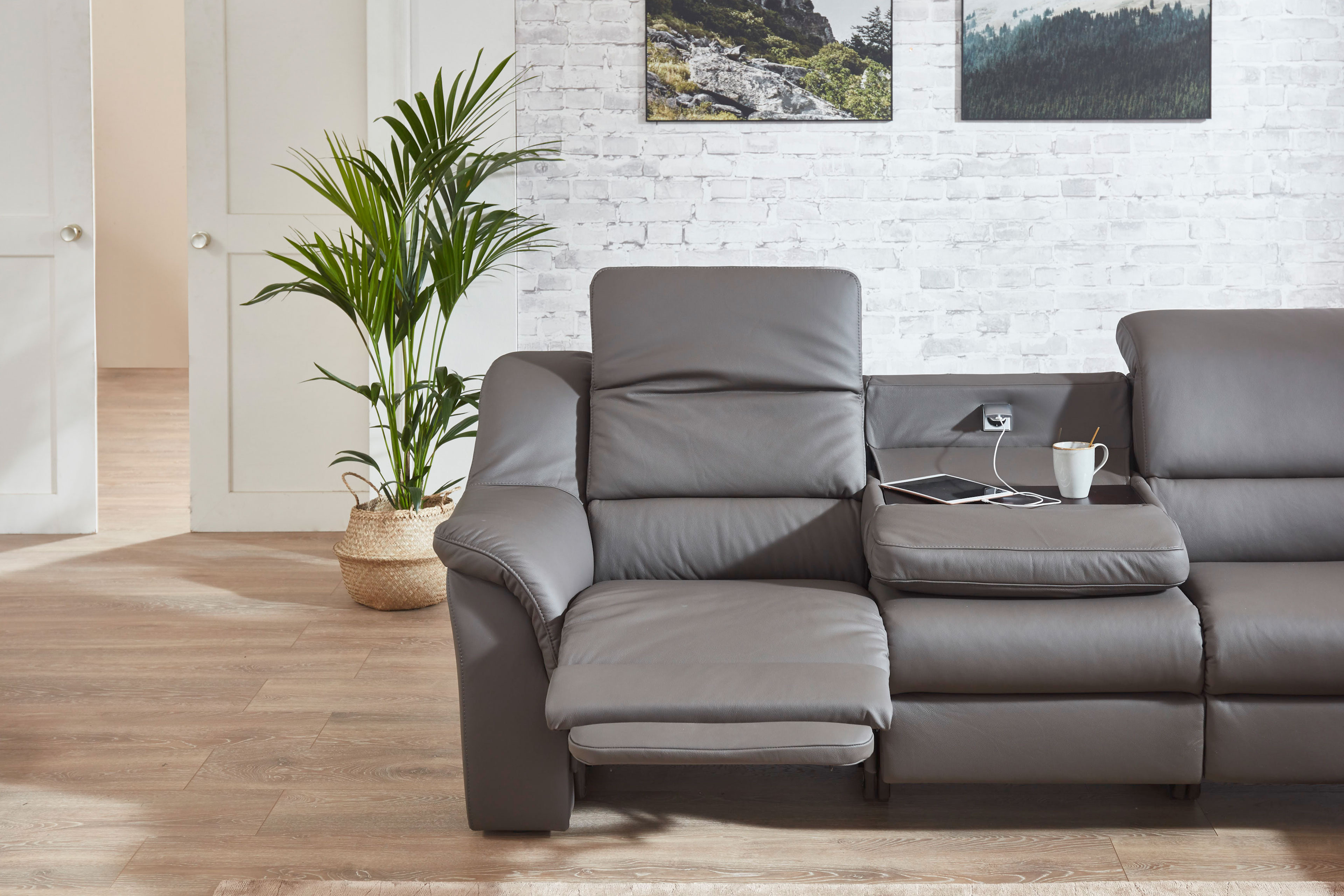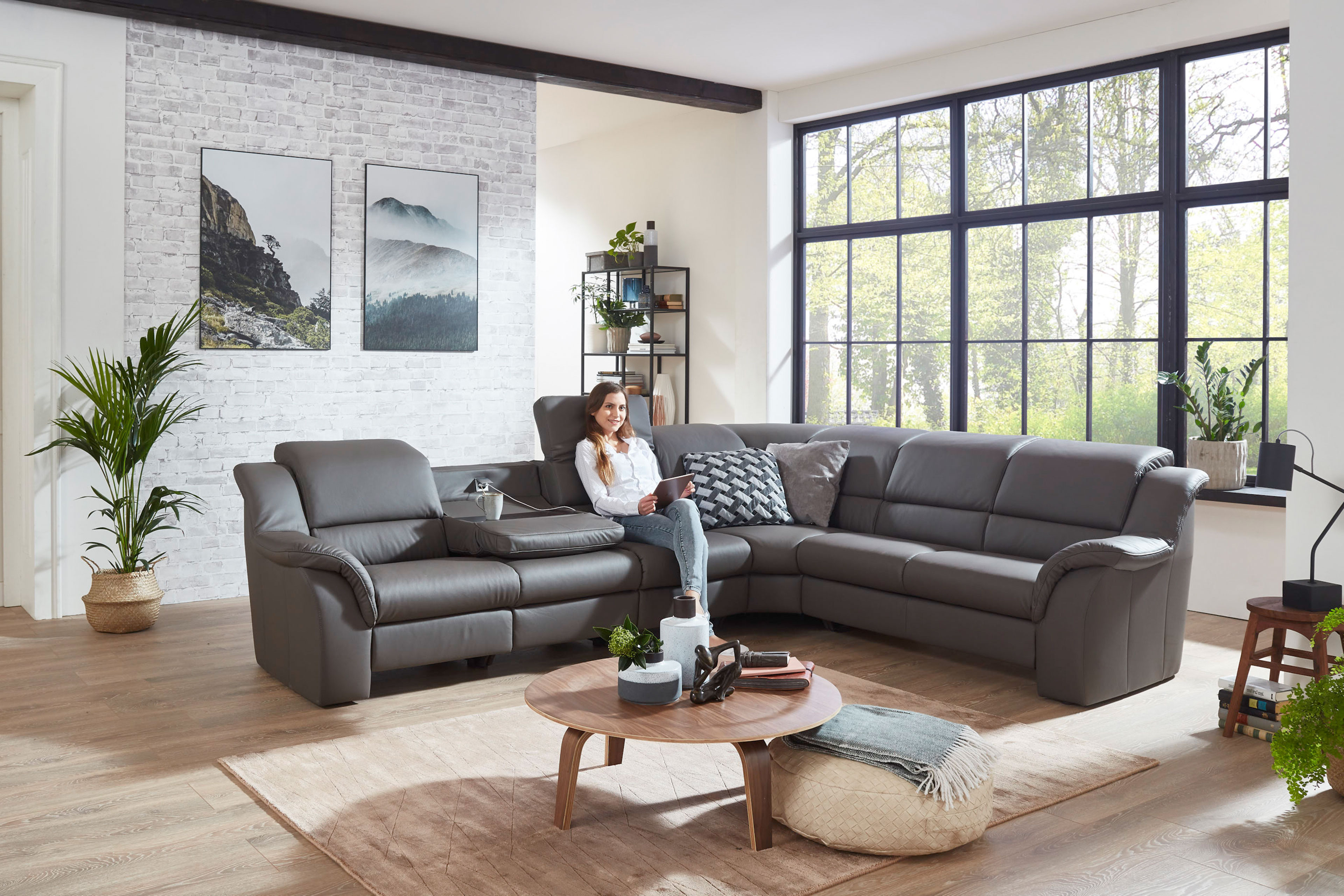Stellen Sie sich vor, Sie kommen nach einem anstrengendet langen Tag nach Hause - und alles, was Sie wollen, ist ankommen, abschalten sowie relaxen. Genau hier beginnt das Erlebnis mit der Ledergarnitur Medicus von Polsteria. Ein Möbelstück, welches nicht einfach nur ein Sofa ist, sondern ein Ort, an dem Komfort auf stilvolle Eleganz trifft. Diese exklusive Garnitur überzeugt mit einem hochwertigen, dunkelbraunen Echtleder und verleiht Ihrem Wohnraum eine zeitlose Ausstrahlung. Das Modell Medicus bietet Ihnen optional eine motorische Relaxfunktion, die entspanntes Verweilen ermöglicht. Lehnen Sie sich zurück, schmiegen Sie sich an die angenehm mit PUR-Schaum gepolsterte Rückenlehne und lassen Sie den Alltag hinter sich - auch wenn es nur für einen kurzen Moment ist. Die stabilen Kunststofffüße fügen sich dezent in das Gesamtbild ein und unterstreichen das luxuriöse Erscheinungsbild. Zusätzlichen Komfort bietet Ihnen die optional erhältliche Schubkastenfunktion, mit der Sie Kissen und Decken stilvoll sowie griffbereit verstauen können - für ein stets aufgeräumtes Wohnambiente. Darüber hinaus haben Sie die Möglichkeit, mittels unserer Zusatzoptionen, eines der beiden Zwischenelemente mit einer praktischer Tischfunktion sowie einem integrierten Steckdosensystem auszustatten - ideal für den Alltag und modernen Wohnkomfort. Auch die optionale manuelle Kopfteilverstellung sorgt für höchsten Sitzgenuss und passt sich flexibel Ihren Bedürfnissen an - ganz gleich, ob Sie aufrecht sitzen oder sich entspannt zurücklehnen wollen. Mit der Polsteria Eckgarnitur Medicus entscheiden Sie sich nicht nur für ein langlebiges Qualitätsmöbel, sondern auch für ein stilvolles Highlight, das Design und Funktionalität perfekt miteinander verbindet.
