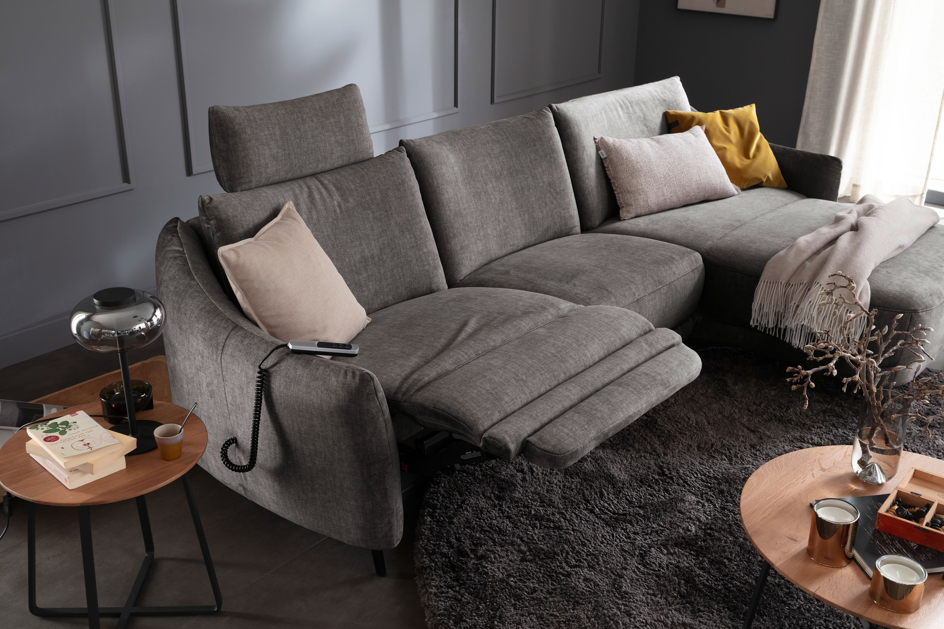 Ob für gesellige Familienabende oder entspannte Stunden zu zweit - mit dem Ecksofa Tabby von SCHÖNER WOHNEN holen Sie sich ein echtes Wohlfühlmöbelstück in Ihr Zuhause. Ob für große Familien oder für alle, die sich bei einem Filmabend gemütlich einkuscheln - dieses Sofa ist ein echter Allrounder und begeistert mit durchdachtem Design sowie behaglicher Ausstrahlung. Die großzügige Sitzfläche lädt dazu ein, sich niederzulassen, zu entspannen und das Leben zu genießen - fast so, als würde man auf Wolken sitzen. Die hochwertige Polsterung im Sitzbereich sorgt für langanhaltenden Komfort. Standardmäßig ist die Polstergarnitur mit einem bequemen PUR-Schaum ausgestattet, welcher optional in unseren Zusatzoptionen gegen eine Federkernpolsterung getauscht werden kann. Damit dieses Modell noch mehr auf Sie zugeschnitten ist, haben Sie sogar die Möglichkeit, aus zwei verschiedenen Sitzhöhen auszuwählen. Die edlen, schwarzen Metallrundfüße sorgen für einen stabilen Stand und setzen zeitgleich einen modernen Akzent in Kombination mit dem dunklen Microfaserbezug. Wer es individueller mag, kann aus weiteren Fußvarianten in unterschiedlichen Formen und Farben wählen. Ebenso beeindruckt das Modell Tabby mit einer großen Auswahl an Bezugsfarben und Materialien, damit dieses Sofa nicht nur zu Ihnen passt, sondern auch perfekt in Ihren Wohnbereich. Jetzt fehlt Ihnen noch das gewisse Etwas? Das SCHÖNER WOHNEN Sofa lässt sich auf Wunsch auch mit einer motorischen TV-Funktion, die für noch mehr Flexibilität und Entspannung sorgt, ausstatten. Mit seiner eleganten Präsenz, modernen Linienführungen und einer unvergesslich soften Haptik wird das Polstermöbelstück Tabby zum Herzstück Ihres Zuhauses.