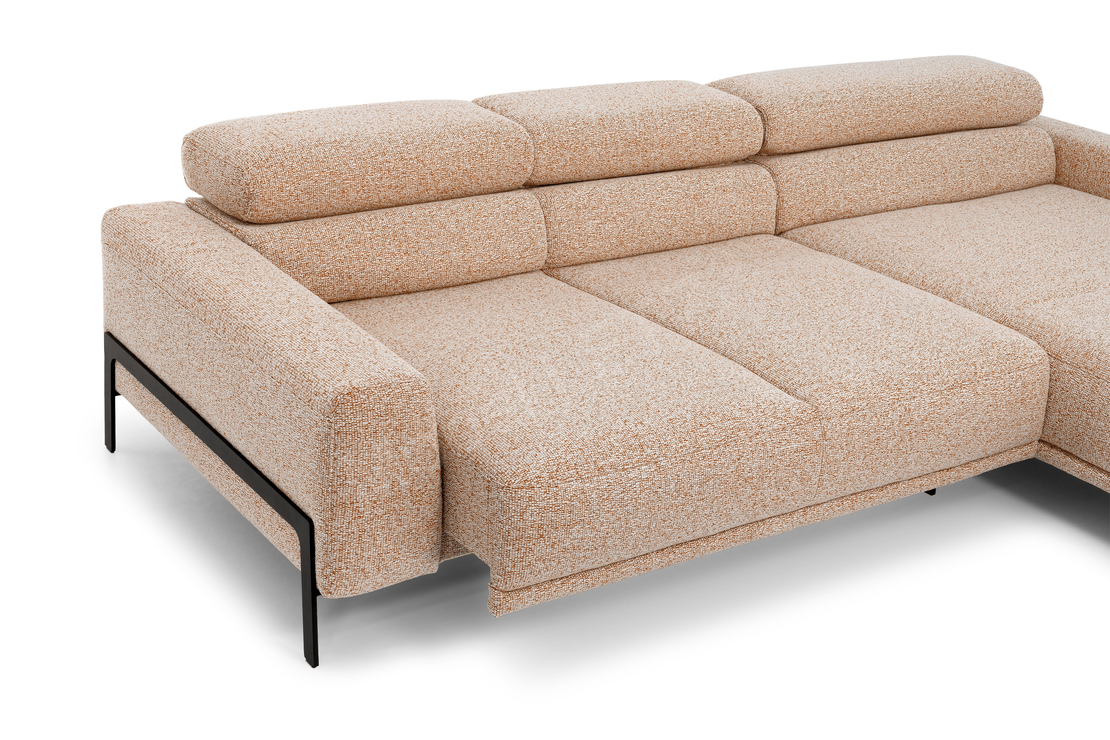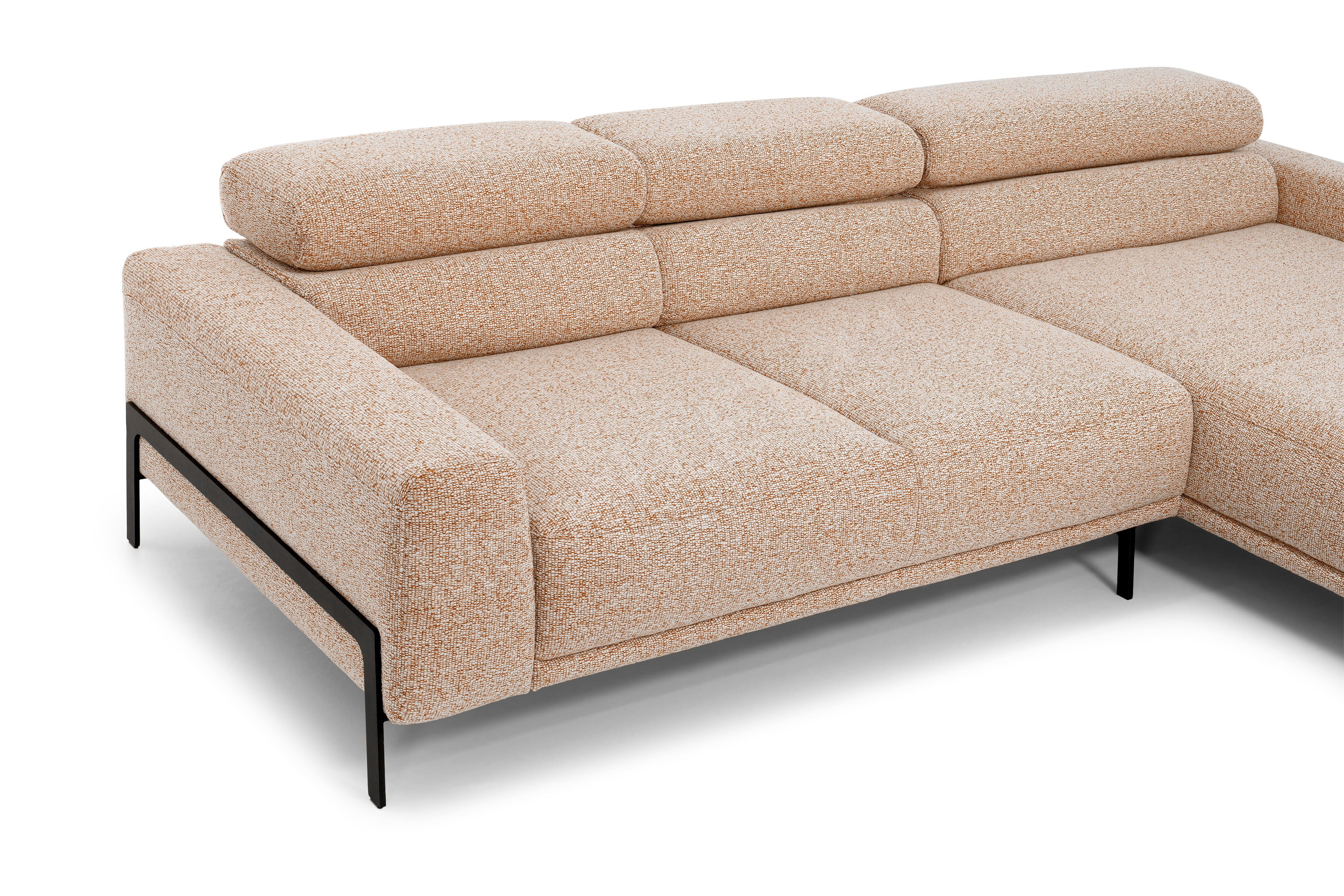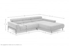 Tossa eine SCHÖNER WOHNEN Eckgarnitur, die das neue Highlight in Ihrem Wohnzimmer werden möchte. In der hier gezeigten Zusammenstellung aus einem 2-Sitzer sowie einer Ottomane verfügt Tossa über ein Stellmaß von etwa 293 x 215-217 cm und lädt zu erholsamen Stunden der Entspannung ein. Einen besonderen Komfort sowie ein angenehmes Sitzgefühl bieten der Rücken, aus einem ergonomisch geformten PUR-Schaumstoff, und der weiche, lockere Polsteraufbau im Sitz, aus einem PUR-Schaum auf dauerelastischen Stahl-Wellenfedern. Schlanke Formen sowie eine niedrige Rückenhöhe, mit nach unten geklappten Kopfteilen, von ca. 71 cm bestimmen das Design und verleihen dem Modell, zusammen mit dem extravaganten Flachgewebe-Bezug sowie den im starken Kontrast dazu stehenden, schwarzen Metallkufen und Metallfüßen, einen stylishen Loft-Charakter. Dank der integrierten Kopfteilverstellung können Sie im Handumdrehen eine Rückenhöhe von bis zu etwa 85 cm zaubern und so Ihren Anlehnkomfort ganz nach Ihrem Belieben variieren. Für ein kleines bisschen mehr Relaxfläche wurde der 2-Sitzer mit einem motorischen Sitzvorzug ausgestattet - auf Knopfdruck erhalten Sie ganze ca. 18 cm mehr Sitztiefe für noch mehr Gemütlichkeit! Tossa ist zudem im Rücken echt bezogen, sodass Sie die Garnitur auch prima als Raumteiler einsetzen können. Sie sind unentschlossen oder haben eine Frage? Dann kontaktieren Sie ganz einfach über Telefon, Live-Chat oder E-Mail unsere kompetenten Einrichtungsexperten und lassen Sie sich beraten. Ganz gleich, auf welchem Weg - mit Tossa von SCHÖNER WOHNEN sichern Sie sich eine wunderschöne Polstergarnitur, welche nicht nur äußerst gemütlich ist, sondern ebenfalls Ihren Wohnraum mit einem harmonischen Klima füllt.