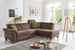 Funktional, elegant und dennoch bodenständig. Arngast KV aus dem Hause Sit & More Polstermöbel im wunderschönen Landhausstil. Diese Eckcouch wirkt durch den samtigen, in Braun gehaltenen Microfaserbezug, welcher ein absolut weiches Hautgefühl verspricht, bereits auf den ersten Blick besonders einladend. Ein dezenter Touch wird ihr durch die beigefarbene Kontrastnaht verliehen. Zusammen mit den massiven, geölten Eichenfüßen und der breiten, abgerundeten Armlehne entsteht ein absolut harmonisches Gesamtbild. Lassen Sie sich auf dem superbequemen Federkern mit PUR-Schaum nieder und genießen Sie Ihre wohlverdiente Auszeit. Angeschmiegt an die weiche Rückenpolsterung, den Kopf an die leicht zu bedienende Kopfteilverstellung, welche bereits integriert ist, angelehnt und eingekuschelt in eine flauschige Decke - so werden Sie sich von Anfang an gut aufgehoben fühlen. Ob Sie sich nun ein fesselndes Buch zu Gemüte führen oder einfach nur ganz entspannt schönen Klängen lauschen ist ganz egal, kosten Sie Ihre Ruhepause in vollen Zügen aus. Um zusammen mit Ihrer Familie einen gemütlichen Fernsehabend verbringen zu können, buchen Sie die optional erhältliche Schlaffunktion dazu und zaubern Sie ganz einfach eine große Kuschelwiese hervor. Bevorzugen Sie einen anderen Farbton oder einen anderen Bezug? Kein Problem, stöbern Sie einfach durch unsere Bezugs- sowie Farbauswahl und stellen Sie Ihre neue Couch so zusammen, wie Sie es möchten. Gerne können Sie auch persönlich Kontakt zu einem Mitarbeiter aus unserem freundlichen Serviceteam aufnehmen.