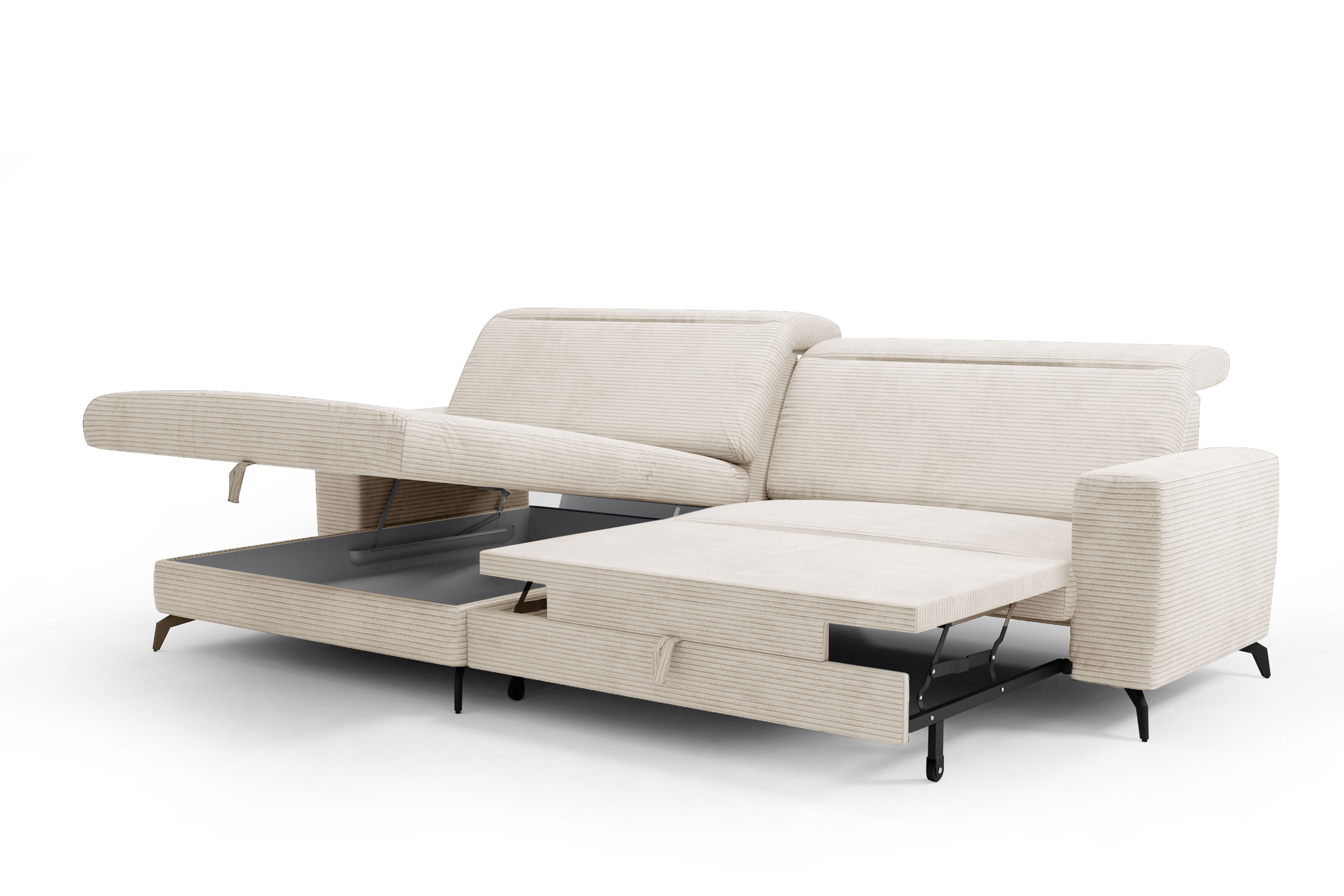 Modern, zeitlos und einfach wunderbar gemütlich, die perfekte Eckcouch, wenn der Wohnraum nicht ganz so groß ausfällt. Das Modell Bolero-LE23 aus dem Hause Sit & More mit einem Stellmaß von ca. 178 x 290 cm, bestehend aus einem Longchair sowie einem 2-Sitzer, wird Ihr Zuhause definitiv bereichern. Rein optisch punktet die Sit & More Polstergarnitur durch den natürlichen Farbton des Bezuges und die schwarzen Metallfüße. In dieser Ausführung wurde ein dezenter, cremefarbener Cordbezug ausgewählt, selbstverständlich ist dieses Modell auch im Rücken echt bezogen. Sollten Sie einen anderen Farbton bevorzugen, so können Sie bei der Bezugsauswahl Ihre eigenen Ideen sowie Vorstellungen einbringen und umsetzen: Unter dem Menüpunkt "Wunschbezug - Farbe ändern" bieten sich verschiedene Bezugsarten und zahlreiche Farben an, um Belora ganz nach den eigenen Wünschen und Vorlieben zu gestalten. Hoher Sitzkomfort wird durch den formstabilen PUR-Schaum auf Wellenunterfederung garantiert. Zukünftig werden Sie mit einer Tasse Tee, einer spannenden Lektüre und Ihrer Kuscheldecke erholsame Auszeiten verbringen, aber auch den geselligen Runden mit Familie sowie Freunden steht nichts im Wege. Für einen höheren Anlehnkomfort haben Sie die Möglichkeit, das bestehende Angebot mit einer fantastischen Kopfteilverstellung und schicken Zierkissen in verschieden Farben zu erweitern. Ebenso können Sie die Polsterecke sowohl mit einer Schlaffunktion als auch einem praktischen Bettkasten ausstatten. Entscheiden Sie sich noch heute für Bolero-LE23 von Sit & More, denn dann werden Sie nach einem stressigen Tag pure Entspannung finden und neue Kraft tanken.
