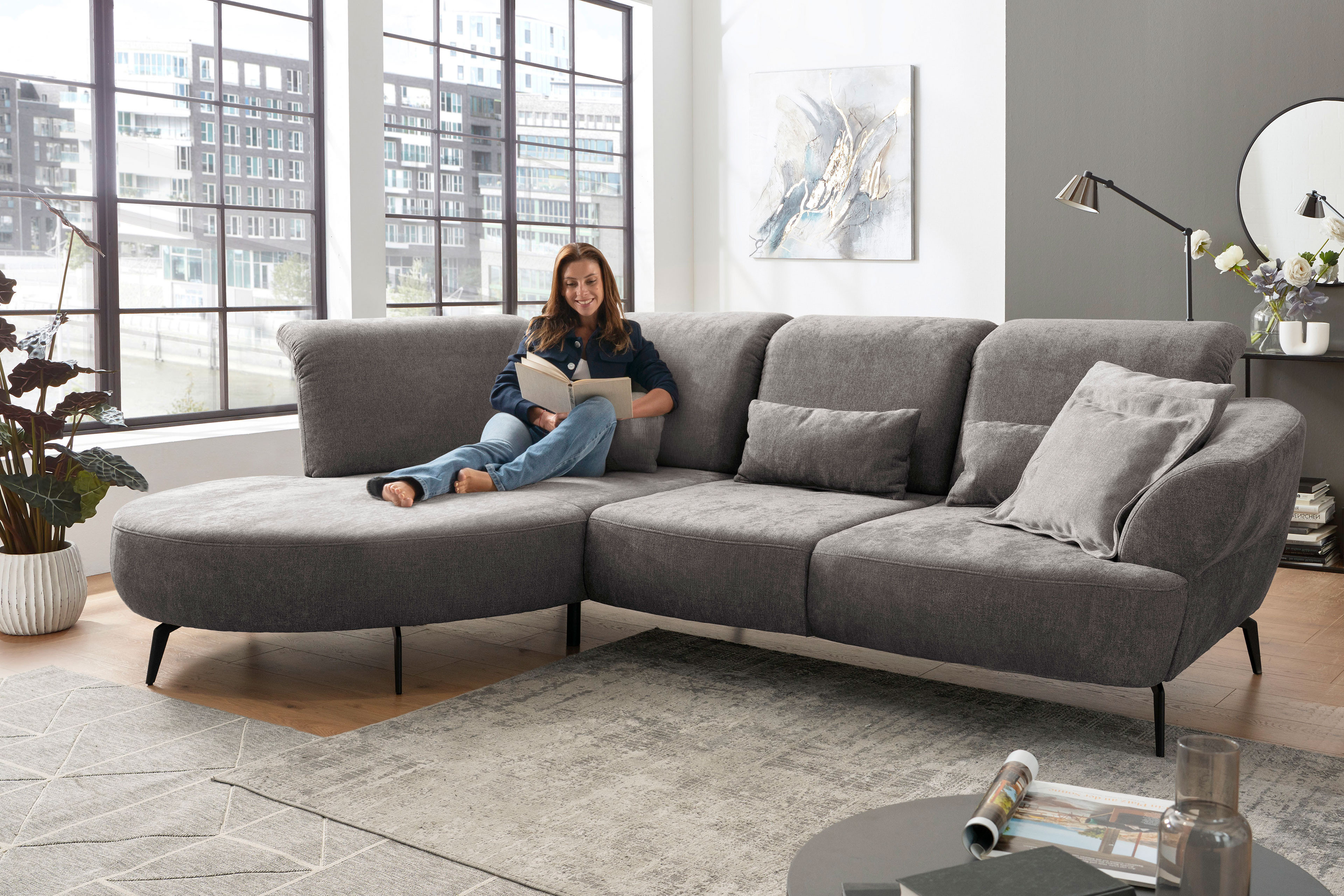 Diese elegante Eckgarnitur namens Dance verbindet modernes Design mit höchstem Sitzkomfort und fügt sich mühelos in jedes Wohnzimmer ein - ob in einem großzügigen Wohnbereich, in einer gemütlichen Stadtwohnung oder in einen offenen Loft-Grundriss. Durch seine klaren Linien sowie die weich abgerundeten Formen wirkt das Sofa zeitlos und zugleich einladend. Besonders vielseitig zeigt sich die Farbgebung des Sit & More Möbelstücks. Dank einer breiten Auswahl an Bezügen sowie Nuancen lässt sich das Modell perfekt an Ihren persönlichen Einrichtungsstil anpassen - von dezent und neutral bis hin zu warmen, ausdrucksstarken Tönen. Ein besonderes Highlight ist die individuelle Funktionalität. Sowohl die Ottomane als auch der 2-Sitzer können mit einer praktischen Kopfteilverstellung ausgestattet werden, die zusätzliche Entspannung ermöglicht - ideal für gemütliche Fernsehabende oder entspanntes Lesen. Der 2-Sitzer lässt sich darüber hinaus mit einer Sitztiefenverstellung konfigurieren, sodass Sie Ihre bevorzugte Sitzposition ganz nach Wunsch variieren können. Für noch mehr Komfort und Gestaltungsspielraum ist das Sit & More Sofa optional mit einem passenden Hocker sowie den gezeigten Kissen erhältlich. Beide Elemente fügen sich harmonisch in das Gesamtbild ein und erweitern die Nutzungsmöglichkeiten - ob als zusätzliche Sitzfläche, Fußablage oder dekoratives Detail. Über unsere vielseitige Konfiguration können Sie zudem weitere Elemente flexibel dazubuchen oder bestehende Module austauschen. So entsteht ein Sofa, welches nicht nur optisch überzeugt, sondern sich auch in Form, Größe und Funktion perfekt an Ihre Wohnsituation anpasst. Dance von Sit & More ein Möbelstück, das Stil, Komfort und Individualität in Ihrem Zuhause miteinander vereint.