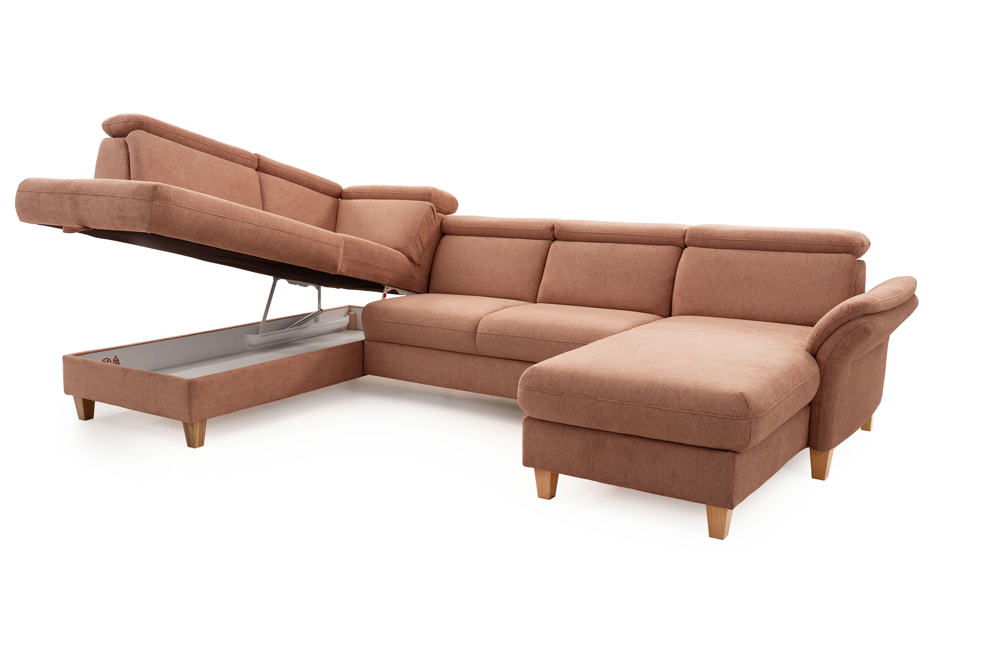 Gemütlich sitzen auf grandiosen Maßen - das können Sie mit dem Modell Glendale-LE26 von dem renommierten Hersteller Sit & More. Mit einem Stellmaß von ca. 193 x 321 x 166 cm verspricht die Wohnlandschaft ein Gefühl von Urlaub. Eine eigene kleine Insel, welche als Rückzugsort, als Treffpunkt und als Entspannungsbereich für Sie sowie Ihre ganze Familie dient. Die im Landhausstil designte Garnitur, bezogen in einem kupferfarbenen Chenille-Flachgewebe und gepolstert mit einer hochwertigen Federkernpolsterung auf einer Wellenunterfederung, bringt wunderbare Momente voll von luxuriösem Sitzgefühl in Ihren Wohnraum. Auch Ihr Übernachtungsgast kann stets erholsam ruhen, denn eine traumhaft komfortable Schlaffunktion kann auf Wunsch gerne dazugebucht werden. Aber nicht nur das: Sie können sowohl im Longchair als auch in der Ottomane einen Bettkasten konfigurieren lassen. Ebenso lassen sich eine verstellbare Armlehne sowie Kopfteilverstellungen für den maximalen Sitzgenuss einstellen. Der Stoffbezug ist traumhaft schön, aber Sie können sich nicht mit Holzfüßen anfreunden? Auch das ist kein Problem, da die Sofagarnitur auch mit Metallfüßen zu glänzen weiß. Entscheiden Sie sich noch heute für die SIT & More Couch Glendale-LE26 und genießen Sie den nächsten Blockbuster auf einer gemütlichen Liegefläche, die für jeden Platz bietet. Sollten Sie sich jetzt immer noch unsicher sein, können Sie auch gerne in den dazugehörigen Polster-Planer schauen und sich dort von der Vielfalt sowie den Funktionen des Modells Glendale-LE26 überzeugen lassen.