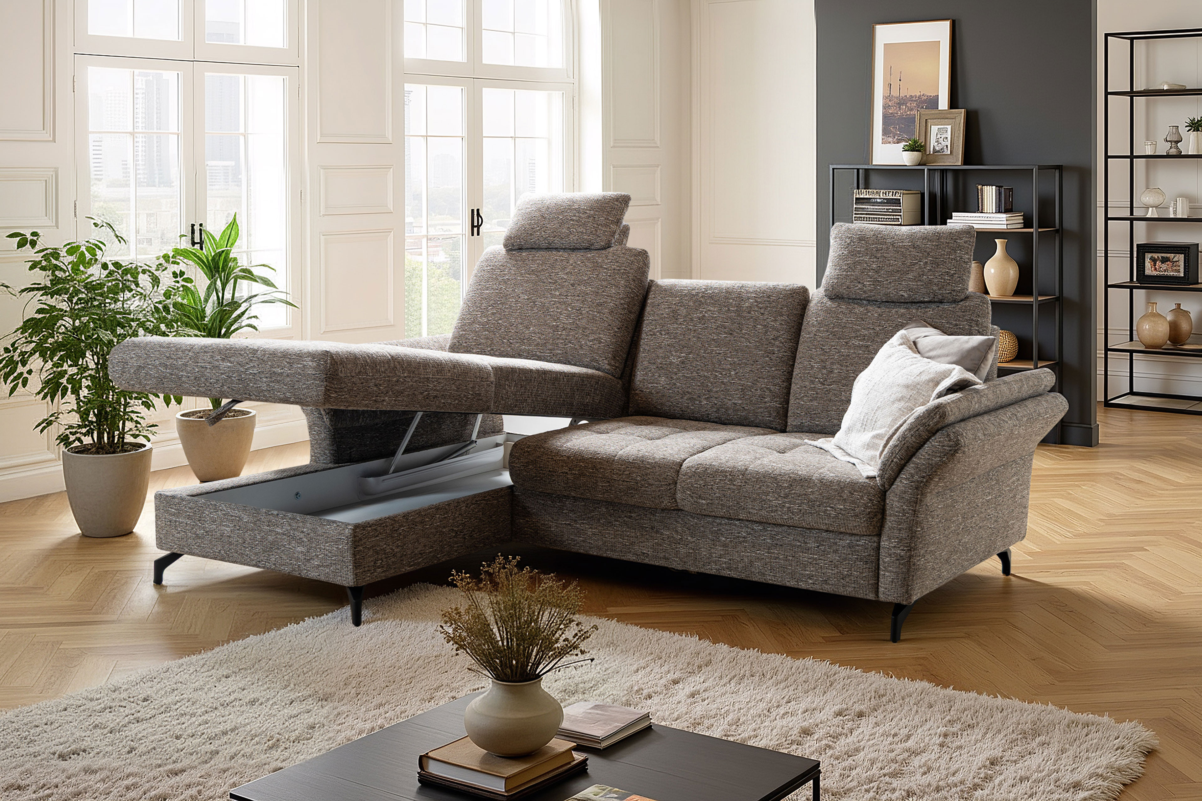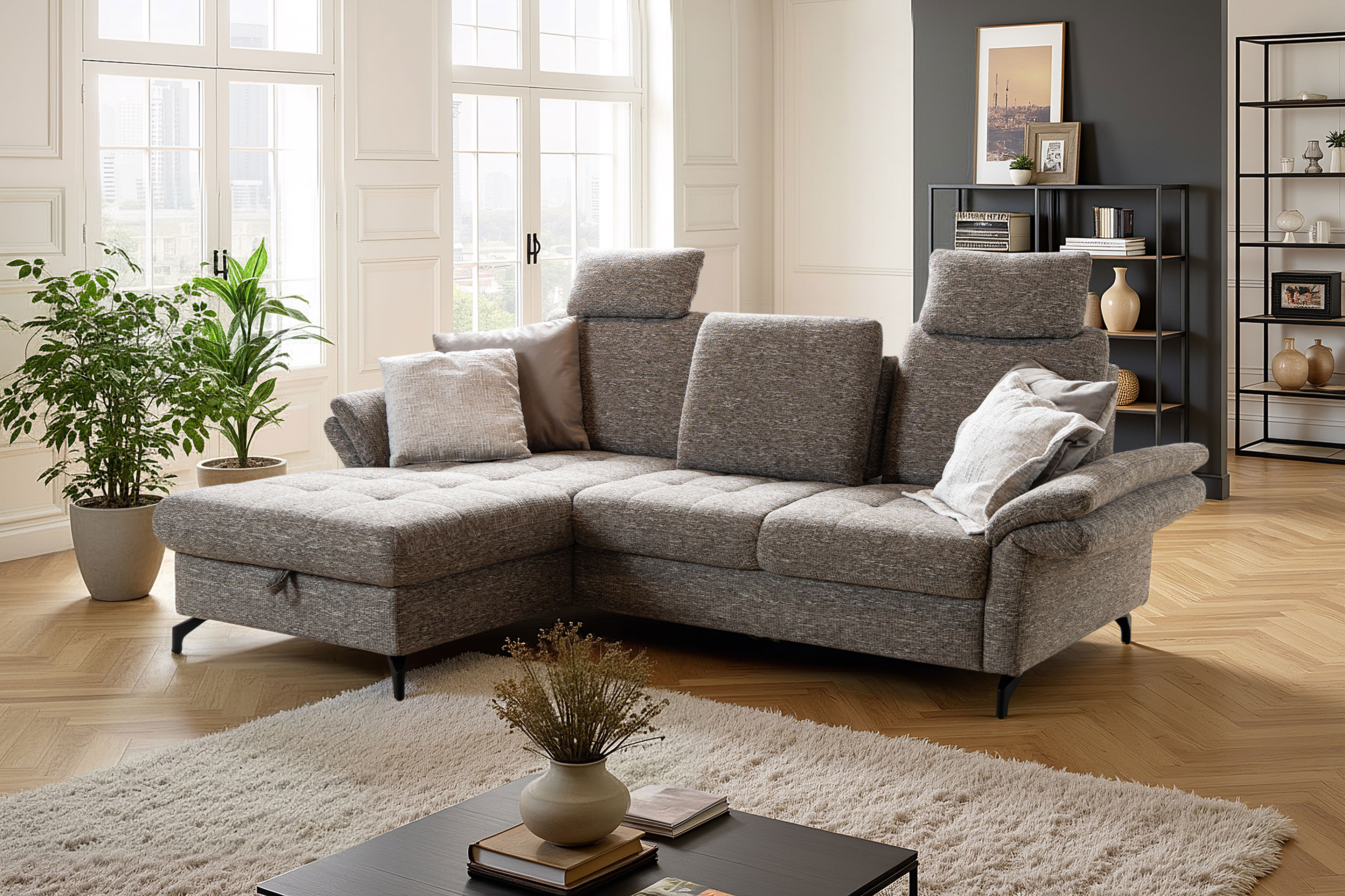 Luana von Sit & More ein Sofa, welches das luxuriöse Wohnkonzept neu definiert und jedem Raum eine elegante, einladende Atmosphäre verleiht. Schon beim ersten Hinsetzen spürt man die außergewöhnliche Qualität: großzügig gepolsterte Sitzflächen, bestehend aus PUR-Schaum, der auf einer abgestimmten Wellenunterfederung ruht. Diese Kombination sorgt für ein wunderbar weiches Einsinken, ohne dabei an Stabilität einzubüßen - perfekt für lange Abende voller Entspannung. Ein besonderes Highlight ist die integrierte Sitztiefenverstellung im 2-Sitzer, welche dafür sorgt, dass Sie die Sitztiefe je nach Wunsch um circa 15 cm anpassen können - ideal für gemütliche Lesestunden, lustige Filmabende oder einfach nur beim entspannten Zurücklehnen nach einem langen Tag. Optional lässt sich das Sofamodell mit den gezeigten, komfortablen Kopfstützen sowie den edlen Zierkissen erweitern, die nicht nur den Komfort steigern, sondern das Sit & More Sofa optisch abrunden und ihm eine zeitlose, moderne Note verleihen. Wer Wert auf natürliche Akzente legt, kann Luana mit eleganten Holzfüßen ausstatten, die der Eckgarnitur eine warme Ausstrahlung und einen besonders hochwertigen Look schenken. Für maximale Flexibilität steht Ihnen zusätzlich in unseren Zusatzoptionen eine Schlaffunktion zur Verfügung, die im Handumdrehen eine großzügige Liegefläche schafft - ideal, wenn überraschend Gäste über Nacht bleiben. Einen integrierten Bettkasten, welcher auch zur Auswahl steht, bietet praktischen Platz für Decken sowie Kissen, ohne das edle Gesamtbild zu stören. Das Ecksofa Luana von Sit & More - weit mehr als nur ein Polstermöbelstück, es ist ein stilvoller Platz, um zusammenzukommen.