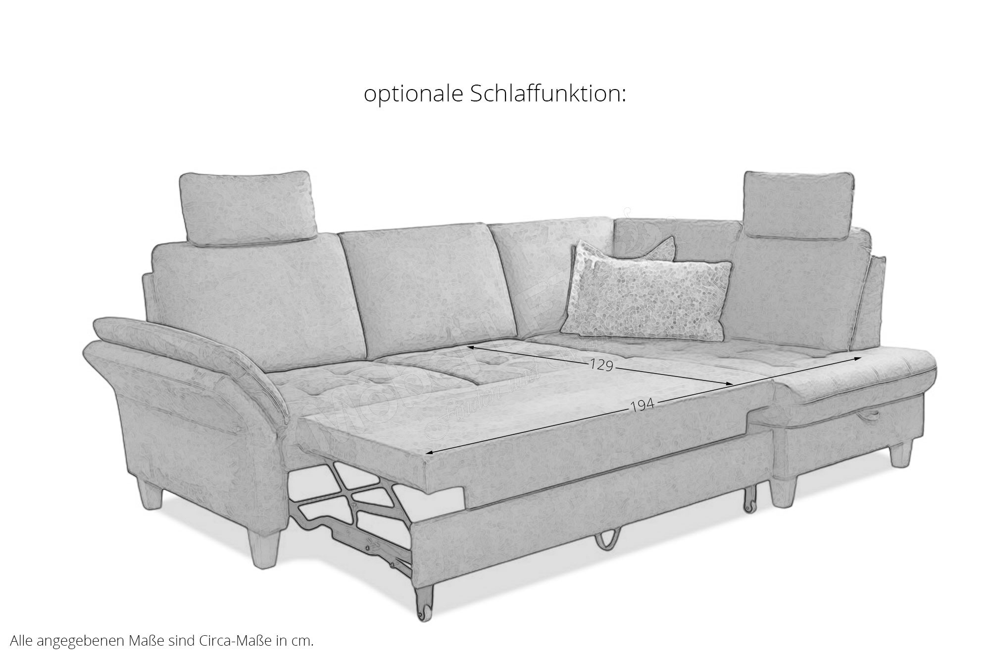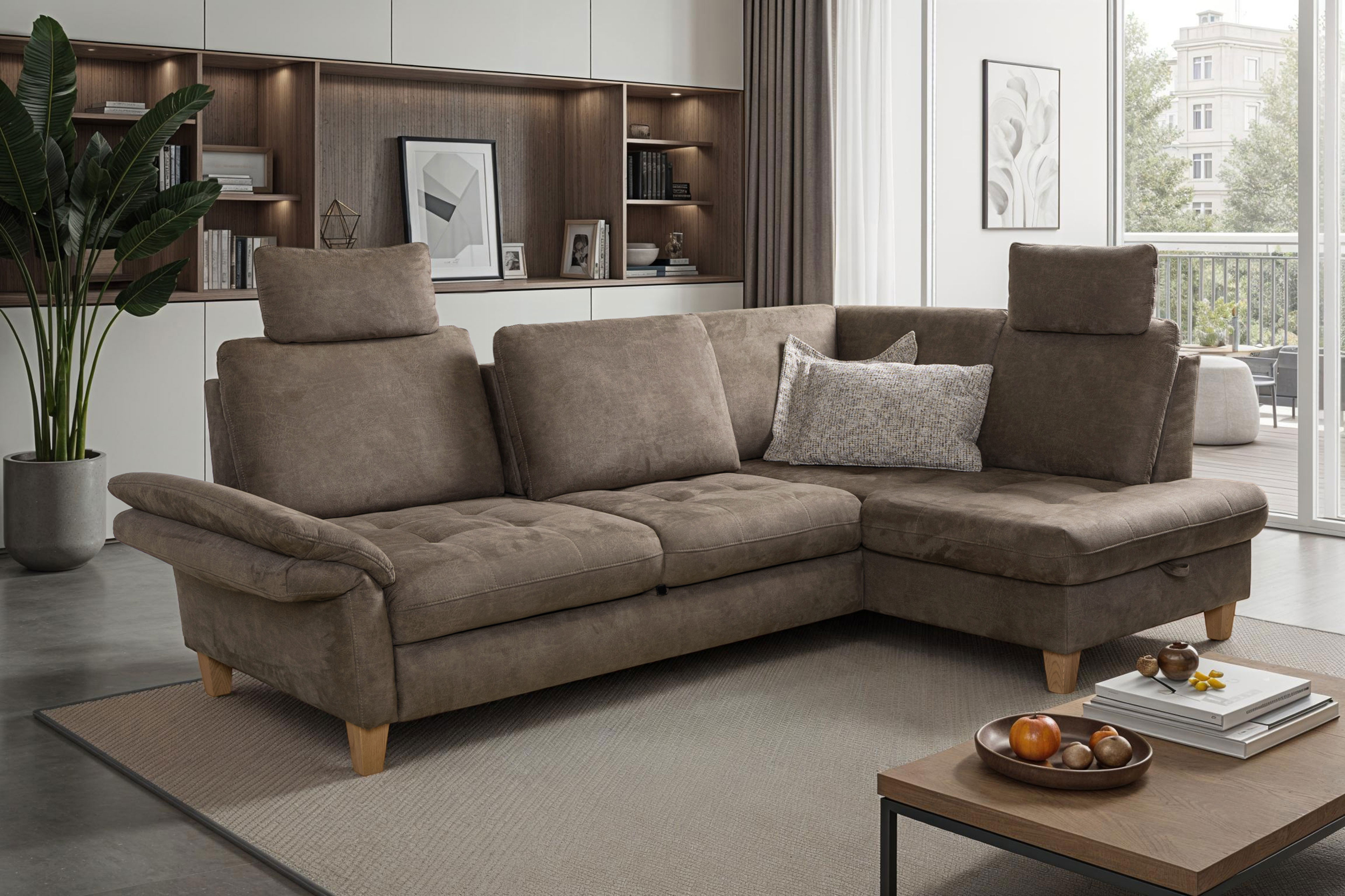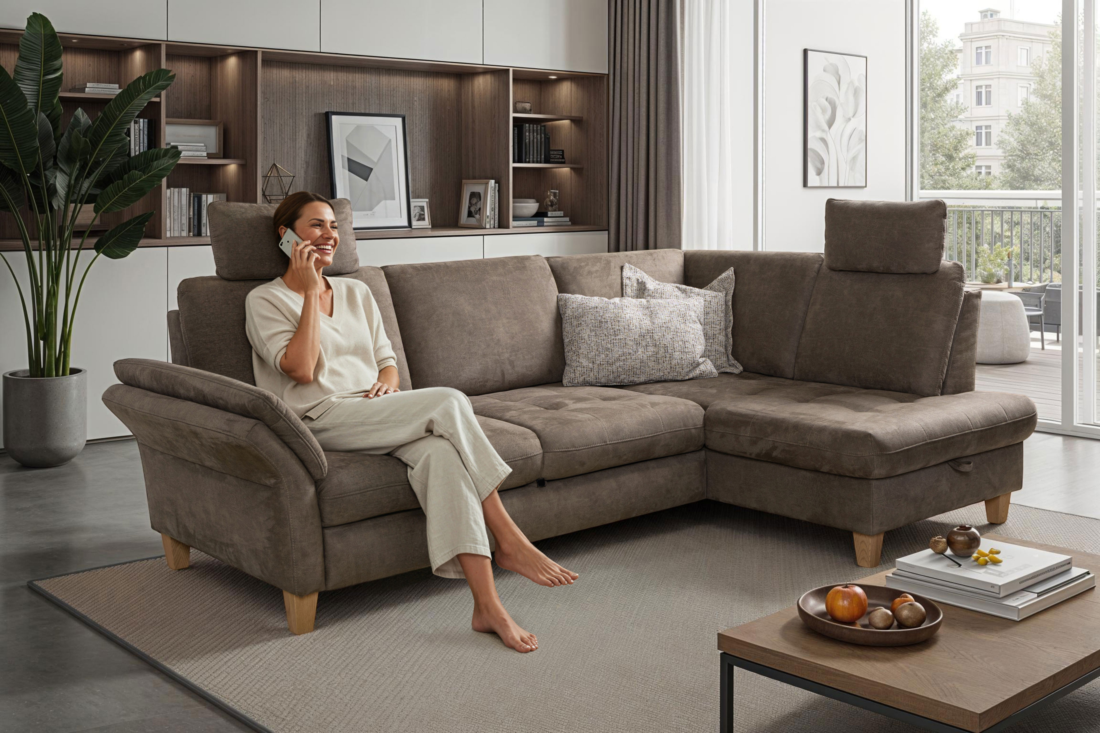 Wenn ein Möbelstück mehr als ein Platz zum Sitzen ist, dann ist es das Sofa Luana von Sit & More. Ein Ort, an dem lange Tage ausklingen können, Gespräche wachsen und Momente bleiben. Dieses stilvolle Ecksofa verbindet hochwertige Verarbeitung mit durchdachtem Design und wird so zum Herzstück jedes Wohnraums. Die luxuriöse Polsterung aus PUR-Schaum auf einer langlebigen Wellenunterfederung schenkt Ihnen ein angenehm weiches, gleichzeitig stützendes Sitzgefühl, das selbst lange Abende mühelos angenehm macht. Ein besonderes Plus ist die integrierte Sitztiefenverstellung von etwa 15 cm, wodurch Sie je nach Belieben Ihre Sitzposition verändern können. Im Grundmodell ruht das Sofa auf eleganten, Holzfüßen in Eiche geölt, die ihm eine natürliche und leichte Note verleihen. Wer es moderner mag, kann es auf Wunsch mit zeitlosen Metallfüßen ausstatten und so eine harmonische Wohnatmosphäre schaffen. Die Kombination aus einem großzügigen 2,5-Sitzer und einer einladenden Ottomane mit einem Stellmaß von circa 253 x 172 cm bietet ausreichend Platz zum Ausstrecken, Wohlfühlen und Zusammensein. Der echt gezogene Rücken ermöglicht eine freie Platzierung im Raum - perfekt für Wohnbereiche mit offener Küche oder Essbereich. Ganz individuell wird das Sofa durch optionale Kopfstützen, eine Armlehnenverstellung sowie weitere Komfortfunktionen, die Sie zum Beispiel in unserem Polsterplaner finden. Abgerundet wird das Sit & More Polstersofa durch eine große Palette an modernen sowie dezenten Bezugsstoffen, mit denen Sie Ihr neues Sofa perfekt auf Ihren Stil abstimmen können. Luana - ein Sofa, das nicht nur gut aussieht, sondern sich auch so anfühlt und jeden Tag ein kleines Stück Zuhause schenkt.