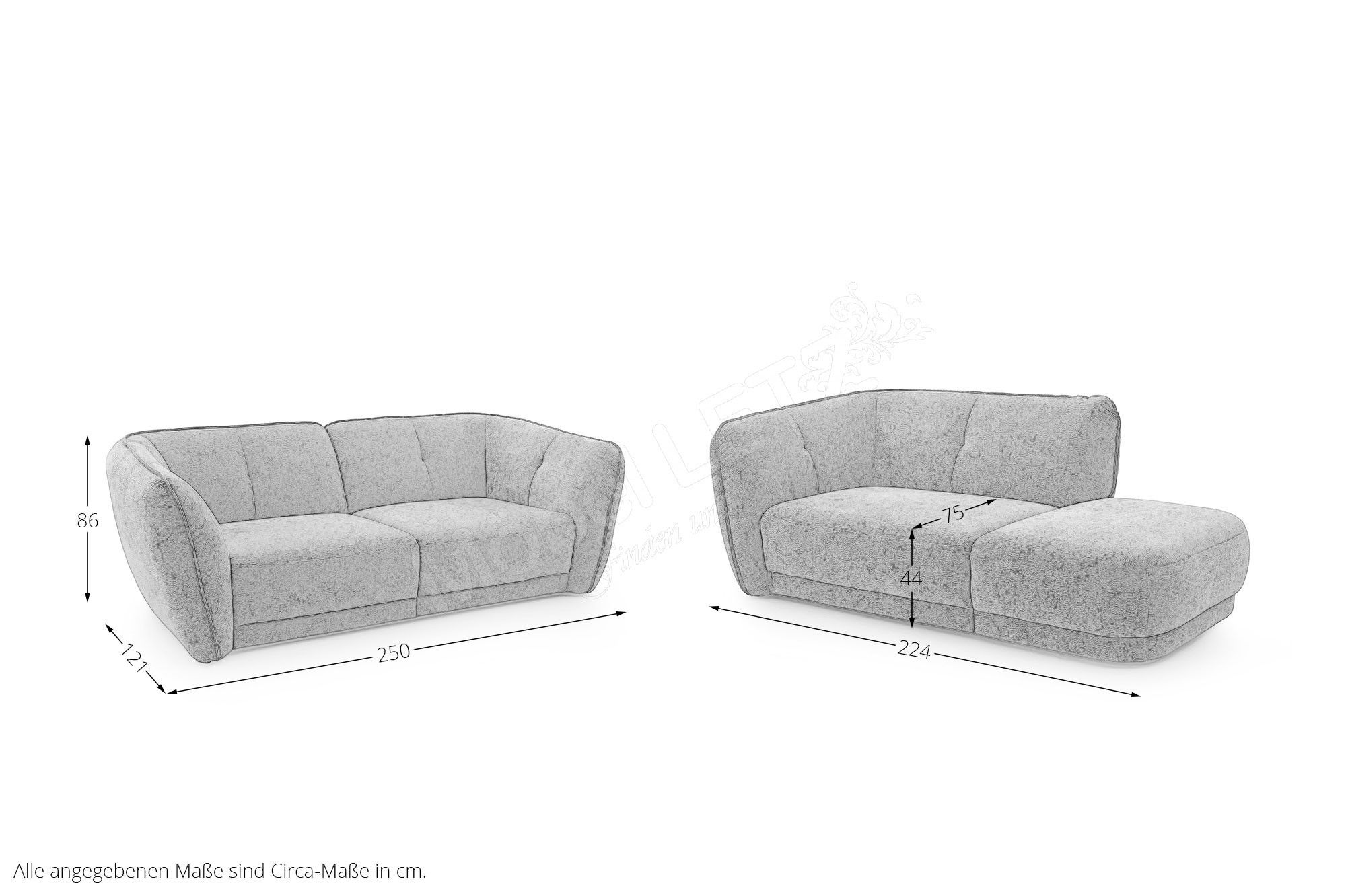 Manche Möbelstücke füllen einen Raum, andere definieren ihn. Das Set Neapel von Sit & More gehört zweifellos zur zweiten Kategorie. Dieses exklusive Sofa-Duo ist weit mehr als eine bloße Sitzgelegenheit - es ist ein Highlight, welches Sie Tag für Tag bestaunen können. Wo der Alltag oft laut und hektisch ist, schafft dieses Programm einen Ort, an dem die Zeit langsam fließen darf. Die Garnitur besticht durch eine moderne Silhouette und fließende Linien, die Ruhe ausstrahlen, ohne sich aufzudrängen. Das Herzstück bildet der großzügige 2-Sitzer mit einer Breite von ca. 250 cm, der durch seine einhüllende Form sofort zum Verweilen einlädt. Er ergänzt wird er durch die elegante Recamiere mit einem Maß von etwa 224 cm, die wie geschaffen ist für verträumte Sonntage und Abende, an denen man einfach die Beine ausstrecken möchte. Für ein Maximum an Komfort sorgt die hochwertige PUR-Schaum-Polsterung mit einer Wellenunterfederung. In Kombination mit der luxuriösen Sitztiefe von ungefähr 75 cm entsteht ein Sitzgefühl, das sie sanft trägt und perfekt nachgibt. Ist Ihnen die gelbe Bezugsfarbe zu gewagt? Dann können sie das Sit & More Ensemble auch in natürlichen oder dezenteren Farben hüllen, die sich harmonisch in Ihr Zuhause einfügen. Um das Wohlfühlerlebnis zu vervollständigen, lassen sich die passenden Kissen sowie der Sessel auf Wunsch direkt dazubuchen. Holen Sie sich mit der Sit & More Garnitur Neapel ein Stück moderne Magie in Ihr Wohnzimmer - einen Ort, der einfach da ist und den man mit jedem Moment genießen möchte.