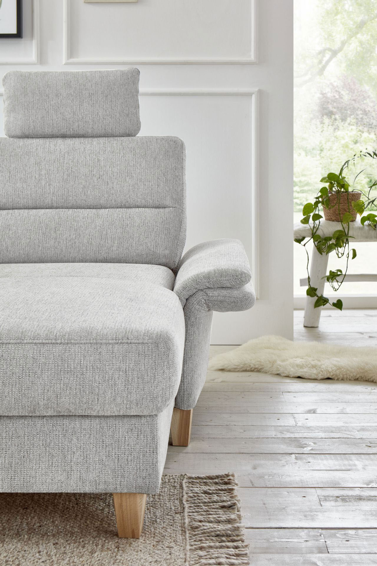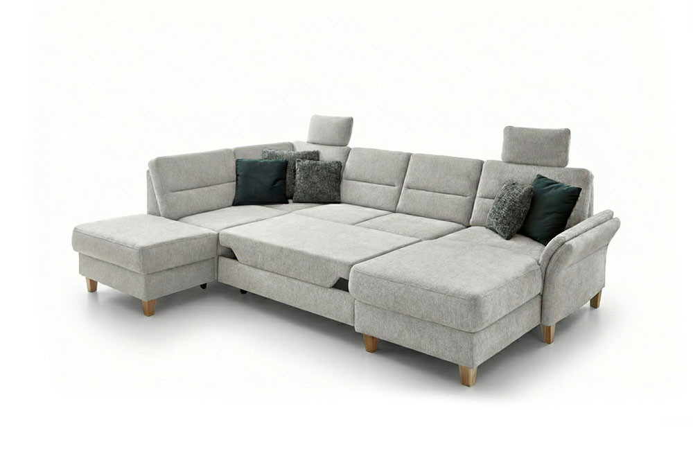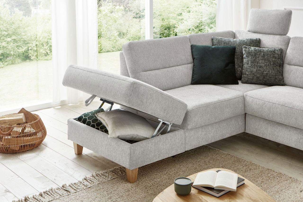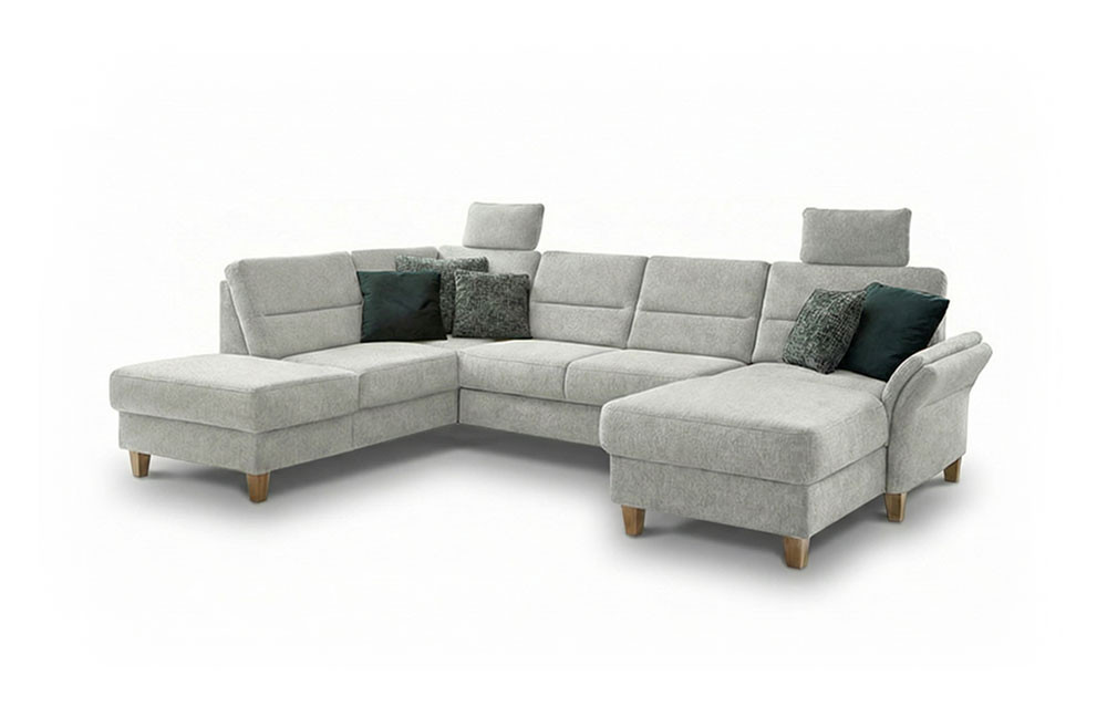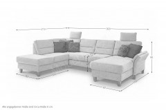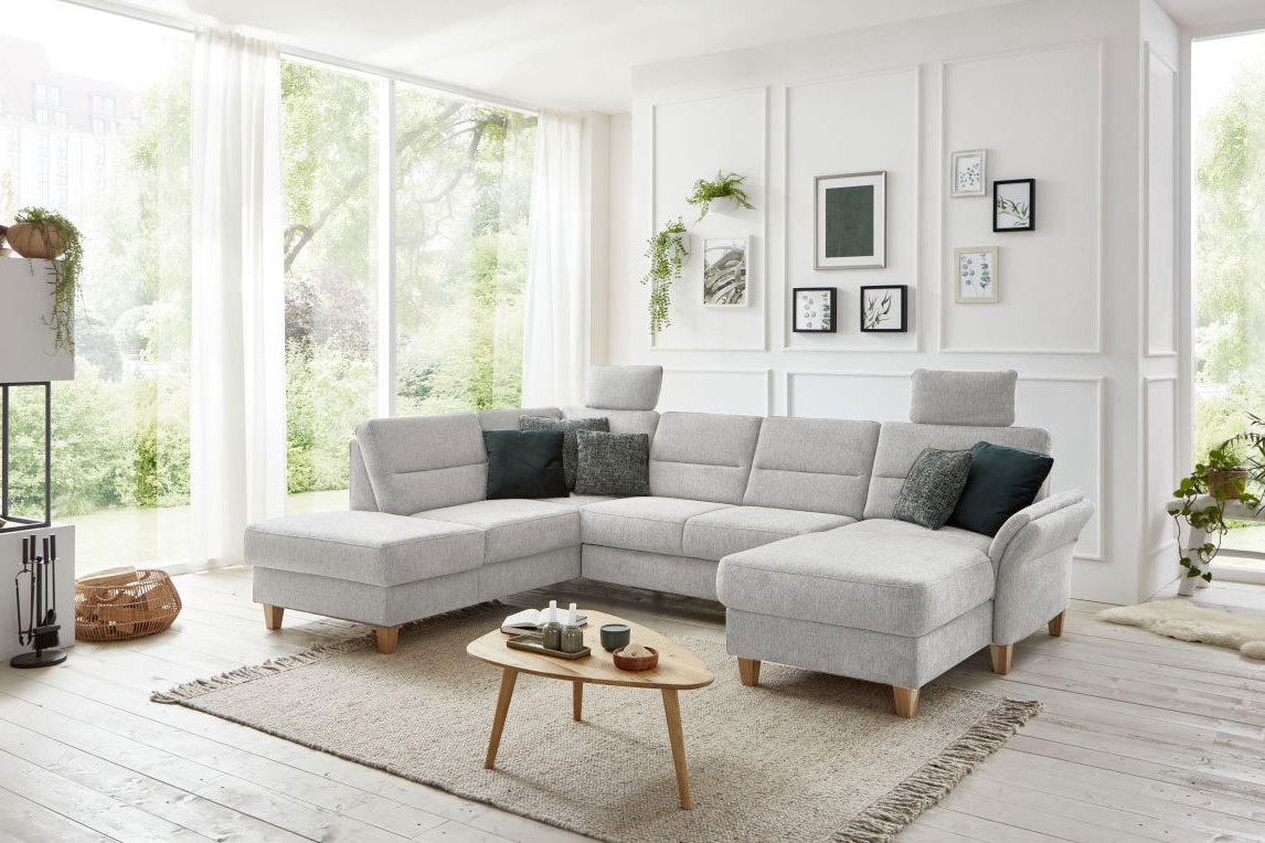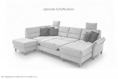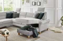 Bereits optisch das pure Vergnügen - Wohnlandschaft Westerland aus dem Hause Sit & More. Das u-förmige Sofa, bestehend aus einer Ottomane, einem 2-Sitzer und einem Longchair, bietet auf einer Stellfläche von ca. 213 x 303 x 162 cm allen Bewohnern des Hauses genügend Plätze zum Niederlassen sowie ein traumhaftes Sitzgefühl auf einer weichen PUR-Schaumpolsterung, ruhend auf einem Federkern. Hier werden Pläne für den nächsten Familienurlaub geschmiedet, gestritten und wieder vertragen, gelacht sowie geweint - wie das Leben in der Familie eben spielt. Doch auch der Kuschelfaktor kann hier ganz groß geschrieben werden. Mit der hinzubuchbaren Schlaffunktion für das 2-sitzige Zwischenelement schaffen Sie sich im Handumdrehen eine gigantische Kuschelwiese, um sich nach einer stressigen Arbeitswoche in gemütlicher Runde, schmusend auf der Couch, einen spannenden Blockbuster anzuschauen und das Beisammensein zu genießen. Mit optionalen Kopfstützen und einer Armteilverstellung lässt sich der Komfort zudem verfeinern. Sie haben Ihre Lieblingsdecke ungern auf der Garnitur zu liegen? Dann buchen Sie den praktischen Stauraum in der Ottomane oder im Longchair hinzu und erfreuen Sie sich an einem heimlichen Aufbewahrungsort, an dem Ihre Wohnaccessoires sicher verstaut werden können. Mit farbigen Kissen in gewünschter Größe vollenden Sie das Gesamtbild und schaffen zusätzliche Wohnlichkeit. Ihr Heim und die Familie sind auch Ihre Insel sowie Ihr Rückzugsort, an dem Sie sich fallen lassen können? Dann wird Westerland von Sit & More Ihr perfekter Anker sein!
