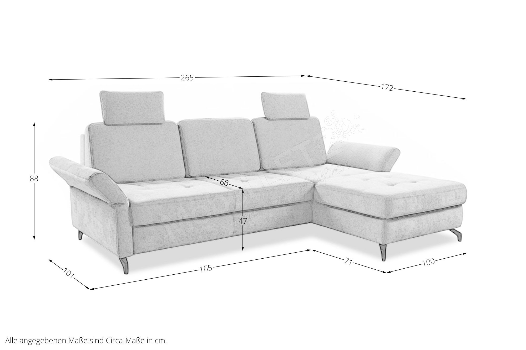 Gestreifte und karierte Stoffe sind nicht möglich. Die maximale Belastbarkeit pro Sitzeinheit beträgt 120 kg.