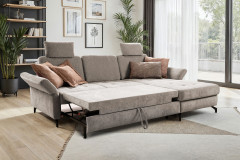 Das Ecksofa Westham-LE24 von Sit & More ist die perfekte Symbiose aus zeitlosem Design und intelligenter Funktionalität. In der eleganten Trendfarbe Taupe, veredelt durch eine präzise Ton-in-Ton Naht, setzt dieses Modell ein klares Statement für gehobenen Lifestyle. Während filigrane, schwarze Metallfüße für einen modernen Look sorgen, können Sie dem Sofa auf Wunsch eine natürliche Note verleihen, indem Sie sich für hochwertige Holzfüße in Buche oder Eiche entscheiden, um das Design perfekt auf Ihr Interieur abzustimmen. Doch die Sit & More Garnitur überzeugt nicht nur optisch, sondern vor allem durch maximale Flexibilität. Standardmäßig kommt das Sofa mit einer hochwertigen PUR-Schaum-Polsterung daher, die für ein angenehmes Sitzgefühl sorgt. Wer es noch fester mag, kann sich optional für eine langlebige Federkernpolsterung entscheiden. Der großzügige 2,5-Sitzer lässt sich zudem individuell an Ihre Bedürfnisse anpassen. Ob eine integrierte Schlaffunktion für Gäste oder die optionale Sitztiefenverstellung, die auch für den angrenzenden Longchair verfügbar ist - Sie entscheiden, wie Sie entspannen möchten. Für zusätzliche Ergonomie sorgen klappbare Armlehnen sowie zubuchbare Kopfstützen, die den Nacken gezielt entlasten. Wer Wert auf Ordnung legt, kann den Longchair einfach mit einem praktischen Bettkasten konfigurieren, der unsichtbaren Stauraum für Decken und Kissen bietet. Mit dem Westham-LE24 holen Sie sich ein konfigurierbares Traumsofa nach Hause, das modernes Design und erstklassigen Komfort meisterhaft vereint.
