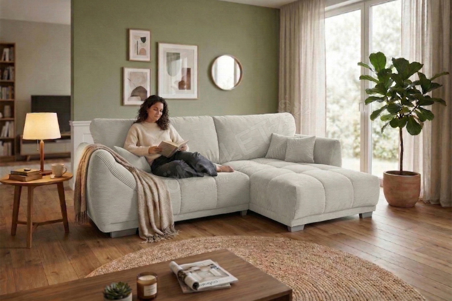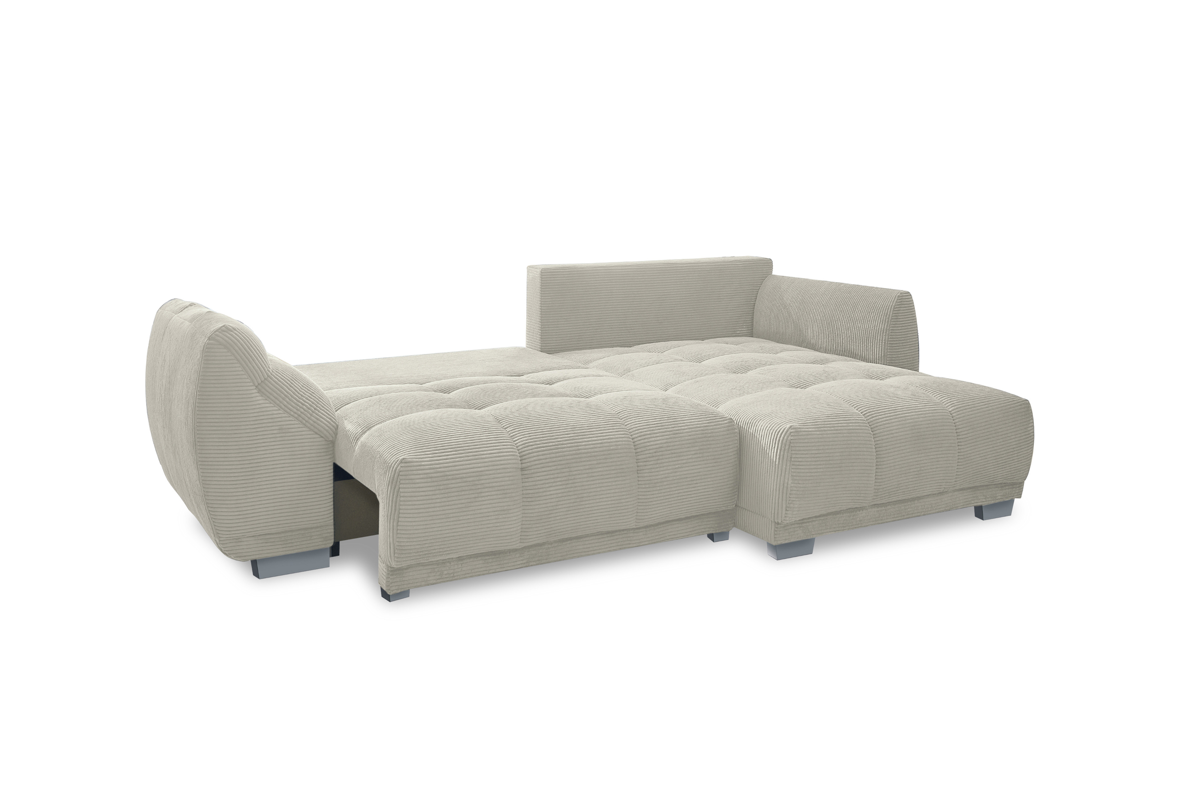 Nach einem langen und ereignisreichen Tag gibt es kaum etwas Schöneres, als in die eigenen vier Wände zurückzukehren sowie den Alltagsstress einfach hinter sich zu lassen. Genau für diese wertvollen Momente der puren Entspannung wurde die Eckgarnitur Modell 248 II von Sofa-Team entworfen. In dieser modernen und zugleich zeitlosen Eckkombination verschmelzen anspruchsvolles Design sowie ein absolutes Maximum an Behaglichkeit zu einer perfekten Einheit. Schon auf den ersten Blick lädt der wunderbar weiche, in einem eleganten Beige gehaltene Breitcord-Bezug zum Verweilen ein. Die markante Struktur des Stoffes verleiht dem Möbelstück nicht nur eine trendbewusste Optik, sondern sorgt auch für ein unvergleichlich gemütliches Hautgefühl. Eine hochwertige Nosagunterfederung stützt Ihren Körper optimal ab und fängt Sie sanft auf. Zusammen mit den überaus bequemen, voluminösen Rückenkissen wird dieses Sofa im Handumdrehen zu einer wahren Oase der Ruhe und Erholung in Ihrem Wohnzimmer. Mit einem großzügigen Stellmaß von ca. 288 x 179 cm schenkt Ihnen diese luxuriöse Polsterecke reichlich Raum, um die Beine hochzulegen, tief durchzuatmen und neue Kraft zu tanken. Um spontanen Gästen ein gemütliches Nachtlager bieten zu können, steht Ihnen eine integrierte Schlaffunktion zur Verfügung, welche Ihren Übernachtungsgästen eine Liegefläche von ca. 225 x 140 cm. Zusätzlich ist das Modell mit einem geräumigen Bettkasten ausgestattet, der Ihnen als platzsparende Unterbringungsmöglichkeit für Ihre Kuscheldecken oder andere Utensilien dient. Zum krönenden Abschluss haben Sie die Option, das Ecksofa in einem anderen Farbton zu kleiden. Entschleunigen Sie Ihren Alltag und erleben Sie erholsame Momente mit der Sofa-Team Garnitur - Modell 248 II.