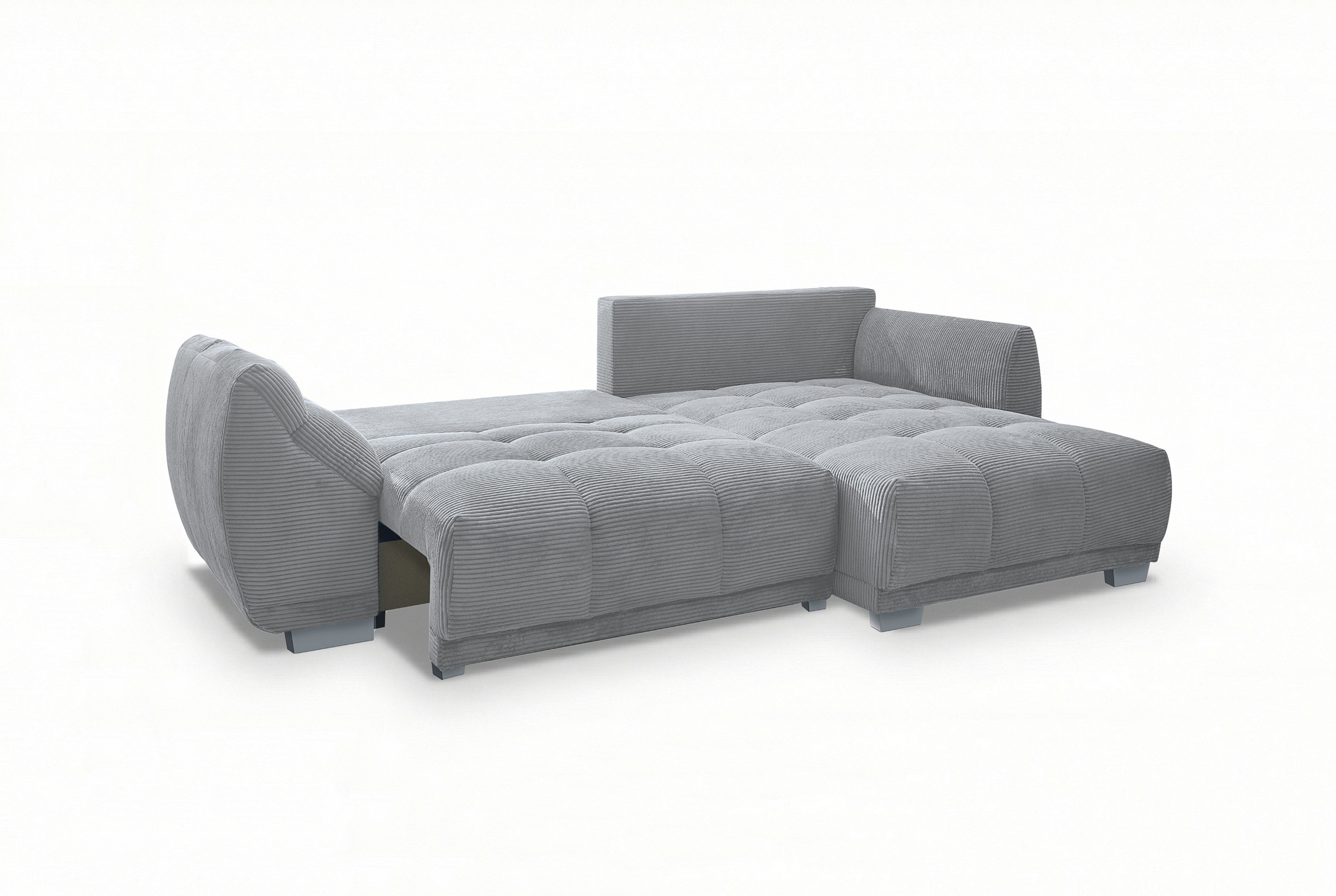 Nach einem langen und ereignisreichen Tag gibt es kaum etwas Schöneres, als in die eigenen vier Wände zurückzukehren sowie den Alltagsstress einfach hinter sich zu lassen. Genau für diese wertvollen Momente der puren Entspannung wurde die Eckgarnitur Modell 248 II von Sofa-Team entworfen. In dieser modernen und zugleich zeitlosen Eckkombination verschmelzen anspruchsvolles Design sowie ein absolutes Maximum an Behaglichkeit zu einer perfekten Einheit. Schon auf den ersten Blick lädt der wunderbar weiche, in einem eleganten Dunkelgrau gehaltene Breitcord-Bezug zum Verweilen ein. Die markante Struktur des Stoffes verleiht dem Möbelstück nicht nur eine trendbewusste Optik, sondern sorgt auch für ein unvergleichlich gemütliches Hautgefühl. Eine hochwertige Nosagunterfederung stützt Ihren Körper optimal ab und fängt Sie sanft auf. Zusammen mit den überaus bequemen, voluminösen Rückenkissen wird dieses Sofa im Handumdrehen zu einer wahren Oase der Ruhe und Erholung in Ihrem Wohnzimmer. Mit einem großzügigen Stellmaß von ca. 288 x 179 cm schenkt Ihnen diese luxuriöse Polsterecke reichlich Raum, um die Beine hochzulegen, tief durchzuatmen und neue Kraft zu tanken. Um spontanen Gästen ein gemütliches Nachtlager bieten zu können, steht Ihnen eine integrierte Schlaffunktion zur Verfügung, welche Ihren Übernachtungsgästen eine Liegefläche von ca. 225 x 140 cm. Zusätzlich ist das Modell mit einem geräumigen Bettkasten ausgestattet, der Ihnen als platzsparende Unterbringungsmöglichkeit für Ihre Kuscheldecken oder andere Utensilien dient. Zum krönenden Abschluss haben Sie die Option, das Ecksofa in einem anderen Farbton zu kleiden. Entschleunigen Sie Ihren Alltag und erleben Sie erholsame Momente mit der Sofa-Team Garnitur - Modell 248 II.