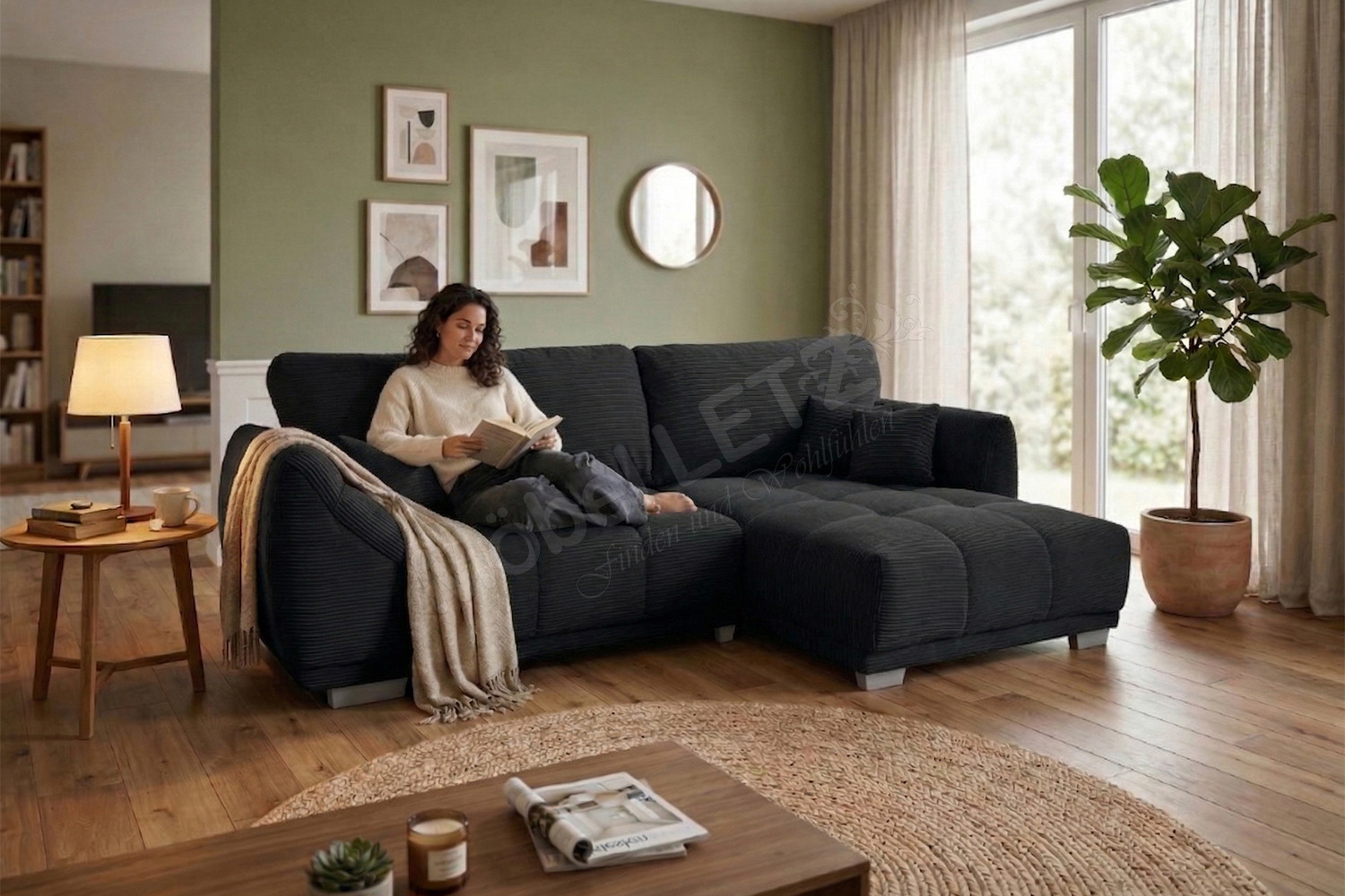 Nach einem langen und ereignisreichen Tag gibt es kaum etwas Schöneres, als in die eigenen vier Wände zurückzukehren sowie den Alltagsstress einfach hinter sich zu lassen. Genau für diese wertvollen Momente der puren Entspannung wurde die Eckgarnitur Modell 248 II von Sofa-Team entworfen. In dieser modernen und zugleich zeitlosen Eckkombination verschmelzen anspruchsvolles Design sowie ein absolutes Maximum an Behaglichkeit zu einer perfekten Einheit. Schon auf den ersten Blick lädt der wunderbar weiche, in einem eleganten Schwarz gehaltene Breitcord-Bezug zum Verweilen ein. Die markante Struktur des Stoffes verleiht dem Möbelstück nicht nur eine trendbewusste Optik, sondern sorgt auch für ein unvergleichlich gemütliches Hautgefühl. Eine hochwertige Nosagunterfederung stützt Ihren Körper optimal ab und fängt Sie sanft auf. Zusammen mit den überaus bequemen, voluminösen Rückenkissen wird dieses Sofa im Handumdrehen zu einer wahren Oase der Ruhe und Erholung in Ihrem Wohnzimmer. Mit einem großzügigen Stellmaß von ca. 288 x 179 cm schenkt Ihnen diese luxuriöse Polsterecke reichlich Raum, um die Beine hochzulegen, tief durchzuatmen und neue Kraft zu tanken. Um spontanen Gästen ein gemütliches Nachtlager bieten zu können, steht Ihnen eine integrierte Schlaffunktion zur Verfügung, welche Ihren Übernachtungsgästen eine Liegefläche von ca. 225 x 140 cm. Zusätzlich ist das Modell mit einem geräumigen Bettkasten ausgestattet, der Ihnen als platzsparende Unterbringungsmöglichkeit für Ihre Kuscheldecken oder andere Utensilien dient. Zum krönenden Abschluss haben Sie die Option, das Ecksofa in einem anderen Farbton zu kleiden. Entschleunigen Sie Ihren Alltag und erleben Sie erholsame Momente mit der Sofa-Team Garnitur - Modell 248 II.