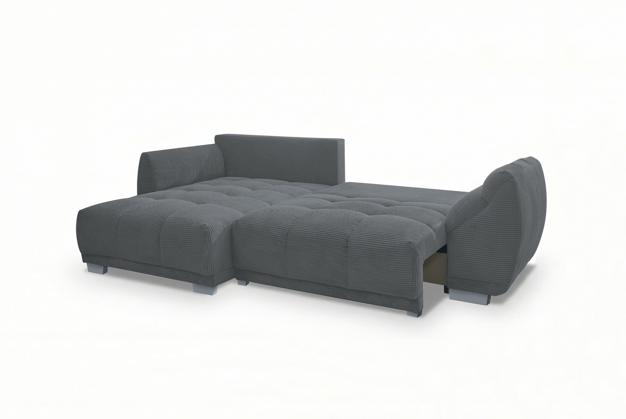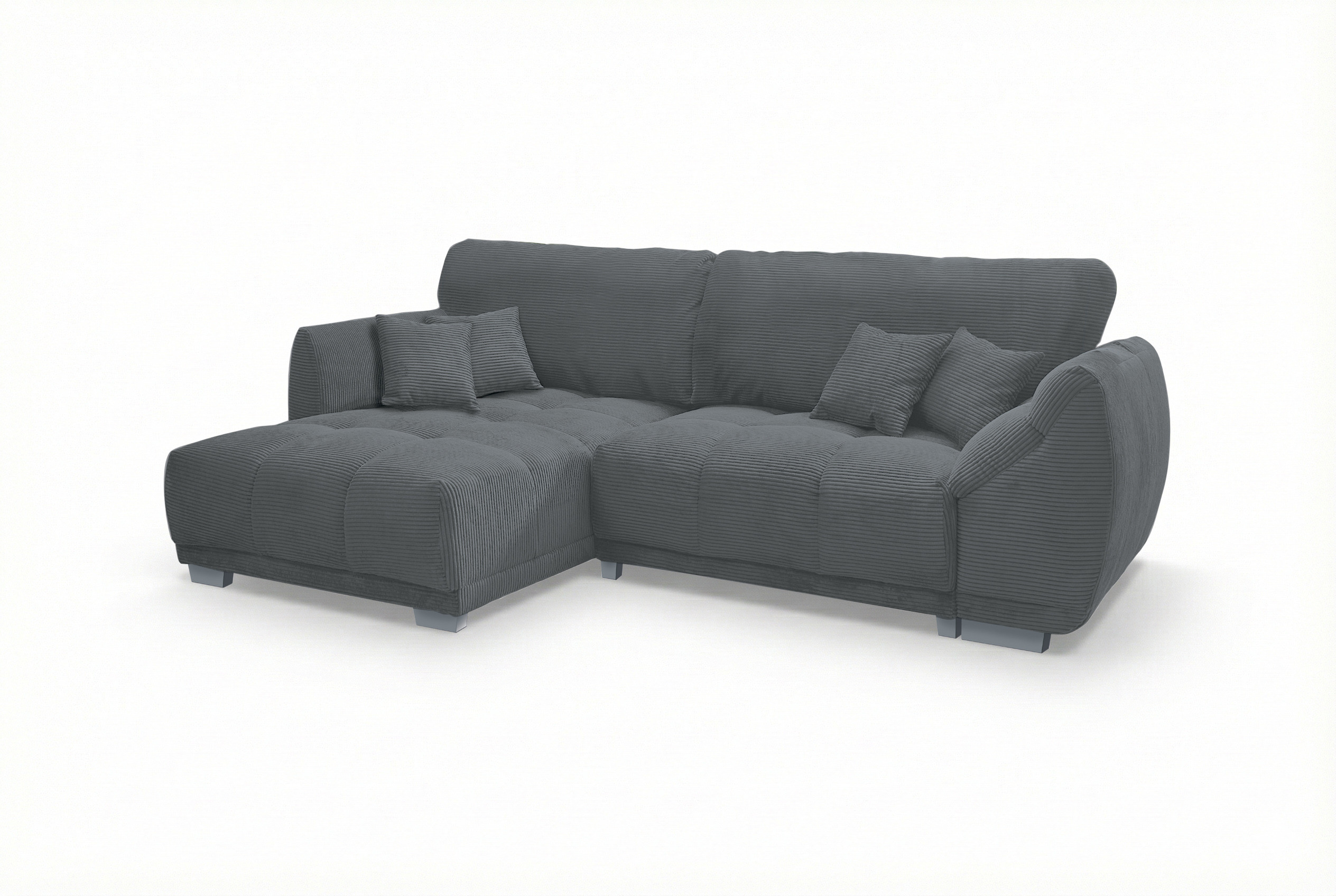 Nach einem langen und ereignisreichen Tag gibt es kaum etwas Schöneres, als in die eigenen vier Wände zurückzukehren sowie den Alltagsstress einfach hinter sich zu lassen. Genau für diese wertvollen Momente der puren Entspannung wurde die Eckgarnitur Modell 248 II von Sofa-Team entworfen. In dieser modernen und zugleich zeitlosen Eckkombination verschmelzen anspruchsvolles Design sowie ein absolutes Maximum an Behaglichkeit zu einer perfekten Einheit. Schon auf den ersten Blick lädt der wunderbar weiche, in einem eleganten Dunkelgrau gehaltene Breitcord-Bezug zum Verweilen ein. Die markante Struktur des Stoffes verleiht dem Möbelstück nicht nur eine trendbewusste Optik, sondern sorgt auch für ein unvergleichlich gemütliches Hautgefühl. Eine hochwertige Nosagunterfederung stützt Ihren Körper optimal ab und fängt Sie sanft auf. Zusammen mit den überaus bequemen, voluminösen Rückenkissen wird dieses Sofa im Handumdrehen zu einer wahren Oase der Ruhe und Erholung in Ihrem Wohnzimmer. Mit einem großzügigen Stellmaß von ca. 179 x 288 cm schenkt Ihnen diese luxuriöse Polsterecke reichlich Raum, um die Beine hochzulegen, tief durchzuatmen und neue Kraft zu tanken. Um spontanen Gästen ein gemütliches Nachtlager bieten zu können, steht Ihnen eine integrierte Schlaffunktion zur Verfügung, welche Ihren Übernachtungsgästen eine Liegefläche von ca. 225 x 140 cm. Zusätzlich ist das Modell mit einem geräumigen Bettkasten ausgestattet, der Ihnen als platzsparende Unterbringungsmöglichkeit für Ihre Kuscheldecken oder andere Utensilien dient. Zum krönenden Abschluss haben Sie die Option, das Ecksofa in einem anderen Farbton zu kleiden. Entschleunigen Sie Ihren Alltag und erleben Sie erholsame Momente mit der Sofa-Team Garnitur - Modell 248 II.