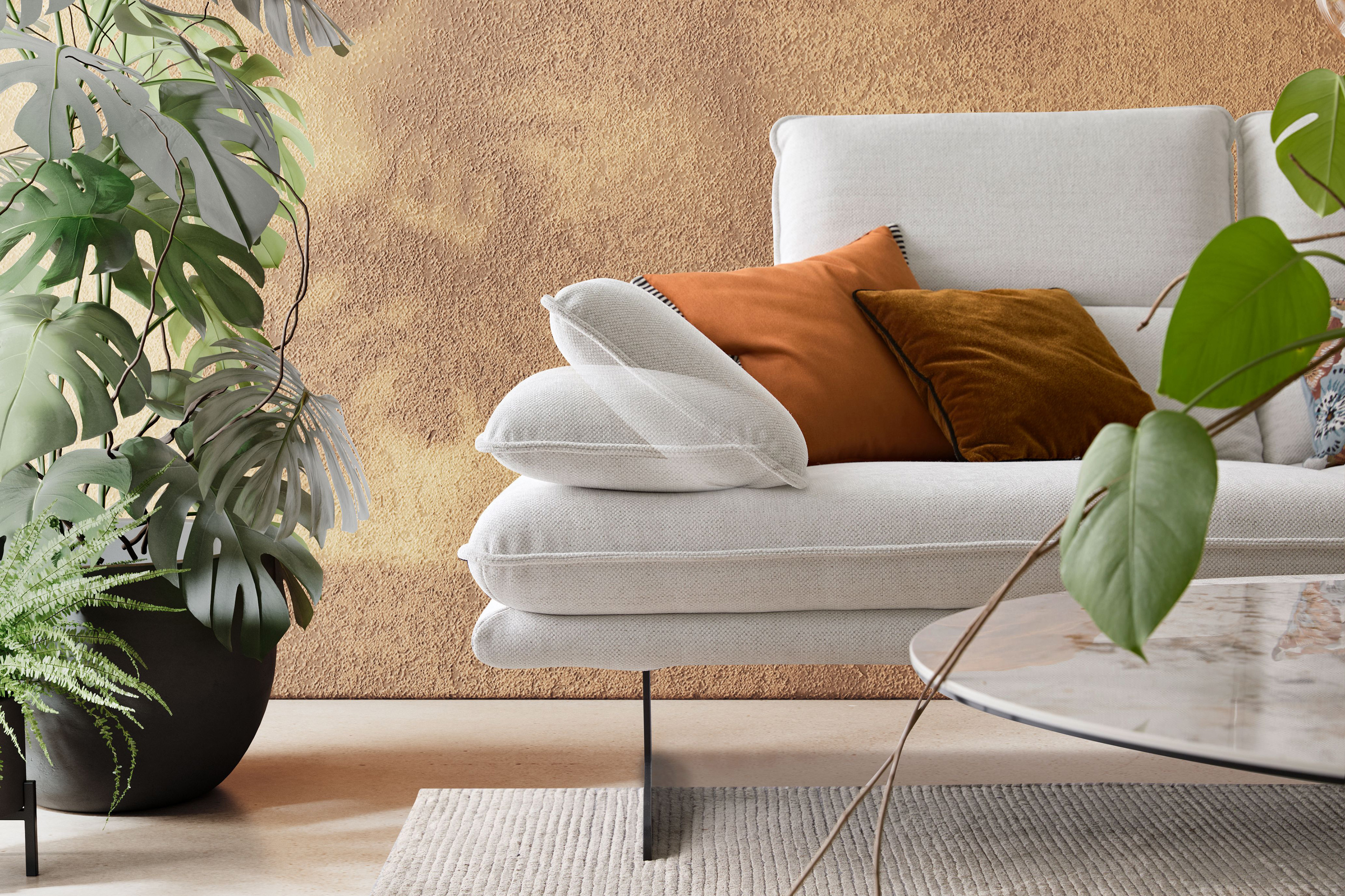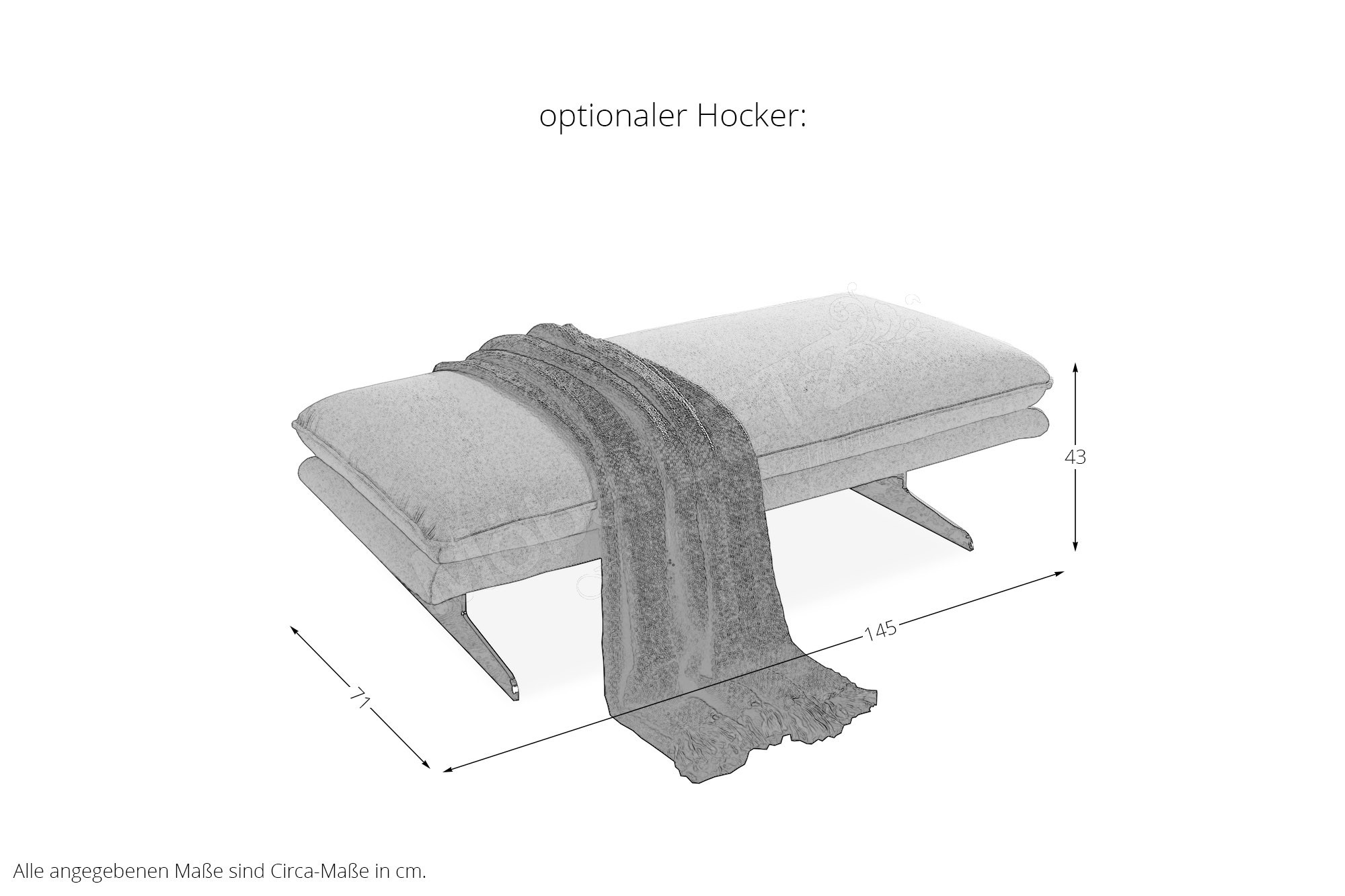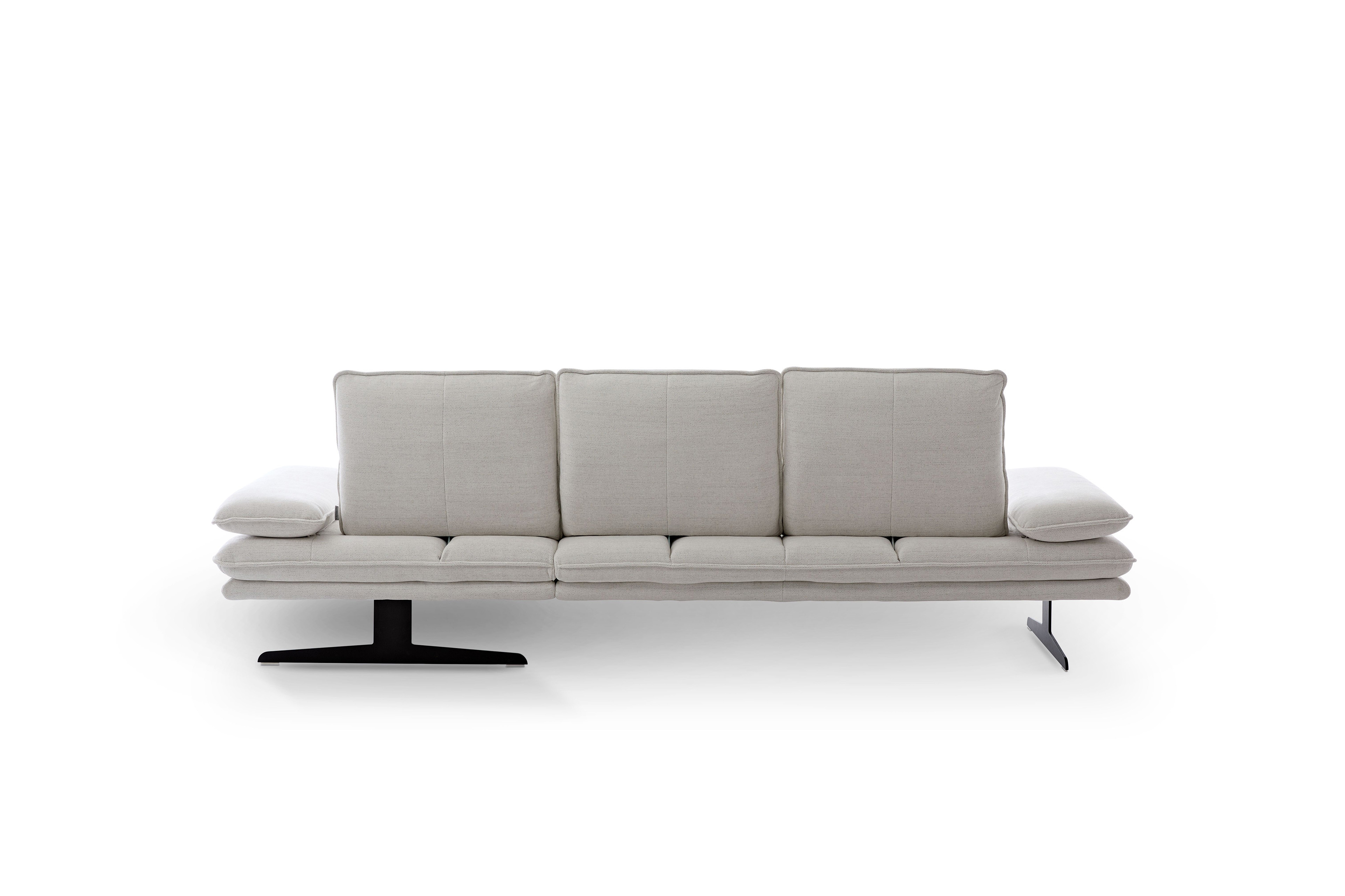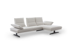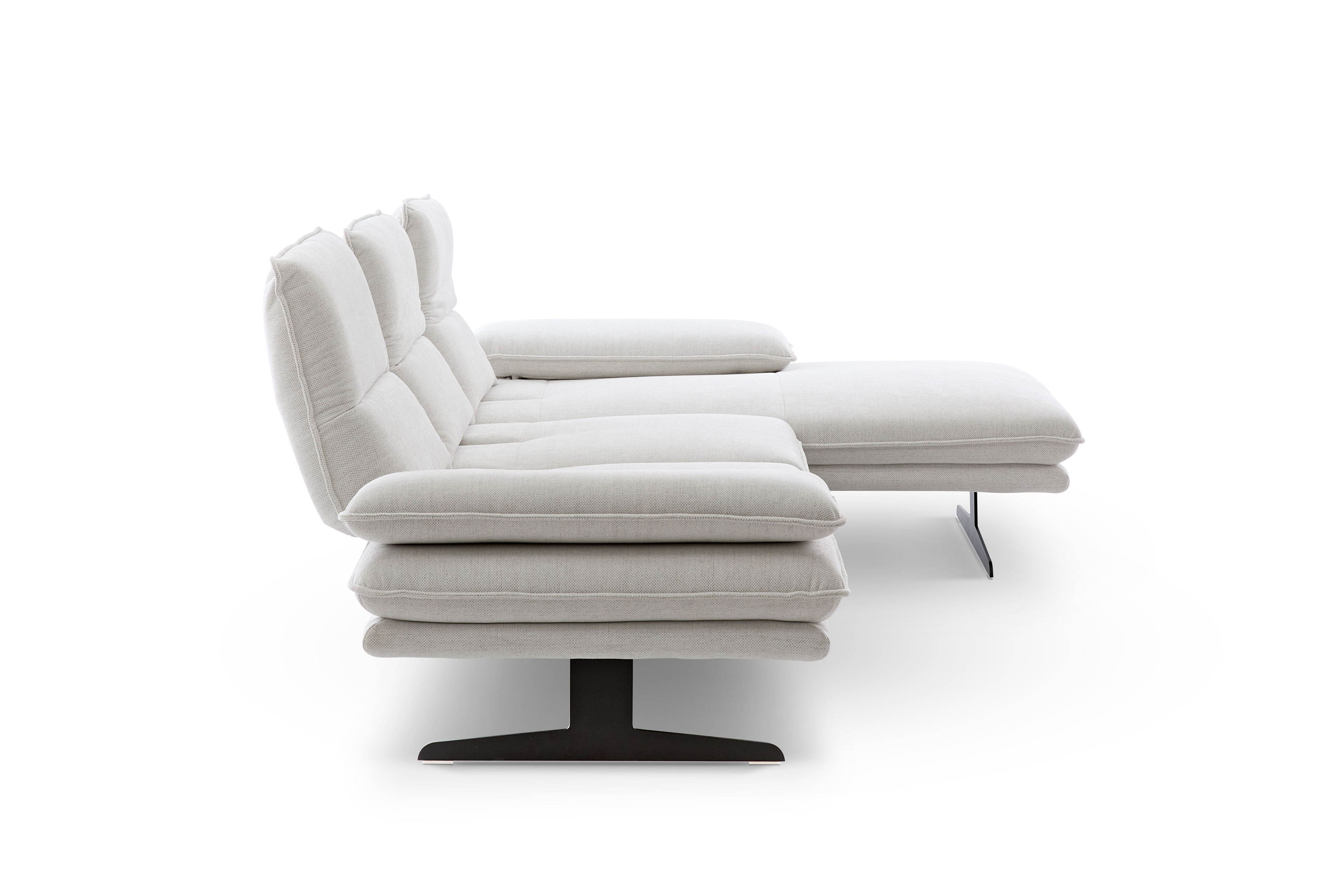 Klare Linien, viel Bodenfreiheit, schwarze Metallkufen und ein anschmiegsamer, weißer Chenille-Flachgewebe-Bezug gestalten zusammen mit dem hervorragenden Sitzkomfort aus diesem charmanten, etwa 291 x 164-189 cm großen Ecksofa das perfekte Sitzmöbel für Ihre vier Wände - 16777 Broadway aus dem Hause Willi Schillig. Mit dieser Garnitur entscheiden Sie sich für ein Wohlfühlmöbel der ganz besonderen Art, auf dem Sie Stress getrost vergessen können - einfach perfekt zum Relaxen und Ausspannen. Sowohl der 2-Sitzer als auch der Longchair verwöhnen Sie mit einer bereits integrierten Sitztiefenverstellung sowie einer superbequemen Polsterung, aufgebaut aus einem ergo-PUR-Schaum mit eingearbeitetem Federkern auf dauerelastischen Wellenfedern. So können Sie nach Lust und Laune selbst bestimmen, ob Sie lieber auf ca. 58 cm Platz nehmen oder es sich auf ca. 84 cm so richtig gemütlich machen. Ein Plus bietet dabei die optional wählbare Kopfteil- sowie Seitenteilverstellung für beide Elemente, mit welchen sich Ihre Sitzposition verfeinern und speziell auf Ihre Bedürfnisse anpassen lässt. Ergänzend stellt der Hersteller einen passenden Hocker, erhältlich in vier verschiedenen Größen, für dieses Polstermöbelprogramm bereit. Einzeln stehend schafft er bei Bedarf einen zusätzlichen Sitzplatz, aber auch Ablagefläche, und an die Garnitur gestellt erhalten Sie mehr Wohlfühlfläche, so können Sie zu zweit ganz entspannt die Beine hochlegen oder sich so richtig ausstrecken. Das Modell ist zudem in vielen weiteren Zusammenstellungen, Bezügen und Farben lieferbar. Nutzen Sie ganz einfach für eine andere Konfiguration unseren Polsterplaner oder kontaktieren Sie unsere kompetenten Einrichtungs-Experten und für ein anderes Outfit können Sie in der umfangreichen Bezugsauswahl unter dem Punkt "Farbe ändern" vorbeischauen. 16777 Broadway von Willi Schillig - elegantes, leichtes und ansprechendes Design zu einem fantastischen Preis-Leistungs-Verhältnis.