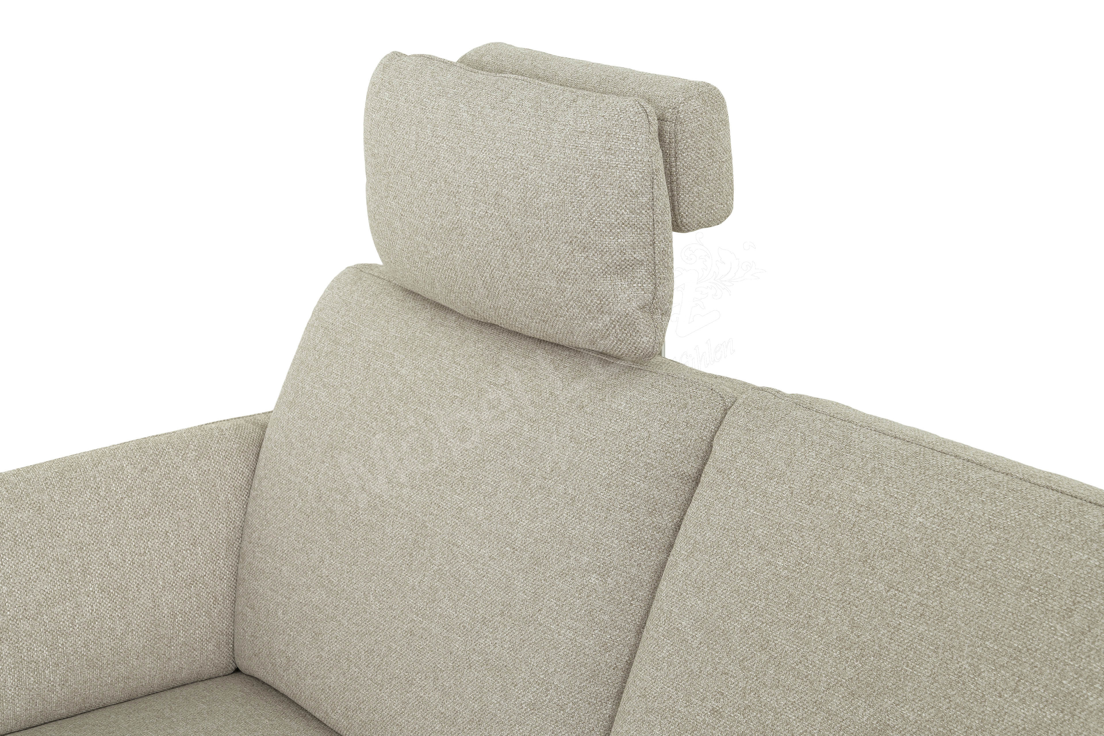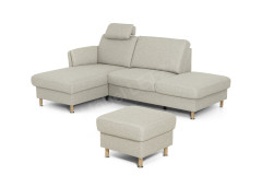 ZE-EM18013 von Zehdenick - ein gemütliches Ecksofa, gekleidet in einem beigefarbenen Flachgewebe und getragen von schicken Holz-/Metallfüßen in Buche natur, die perfekt mit dem Bezug sowie Design harmonieren und der Garnitur einige Zentimeter Bodenfreiheit verleihen. Die Polstergarnitur begeistert mit einer angenehmen Rückenhöhe von ca. 90 cm, einer Sitzhöhe von ca. 46 cm sowie einer bequemen Sitztiefe von ca. 56 cm und zeigt sich hier in der l-förmigen Zusammenstellung aus einem Canape mit Armlehne links und einem 1,5-Sitzer mit Anstellhocker rechts. Zu diesem Angebot gehören außerdem, wie abgebildet, eine integrierte Armteilverstellung, ein quadratischer Hocker und eine Premiumkopfstütze, welche individuell an beiden Sitzplätzen angebracht werden kann, da beide Elemente über eine Kopfstützenvorrichtung verfügen. Die hochwertige Kaltschaumpolsterung im Sitz auf dauerelastischen Wellenfedern und im Rücken mit hochelastischen Polstergurten garantiert zu jeder Zeit ein superbequemes Sitzgefühl sowie einen hervorragenden Sitzkomfort. Mit einem eher kleinen Stellmaß von ca. 168 x 228-242 cm bietet die Polsterecke trotzdem ausreichend Platz und lädt zum Faulenzen, Erholen sowie Ausstrecken ein. ZE-EM18013 aus dem Hause Zehdenick - ein fantastisches Angebot zum attraktiven Sonderpreis, welches Sie sich nicht entgehen lassen sollten!