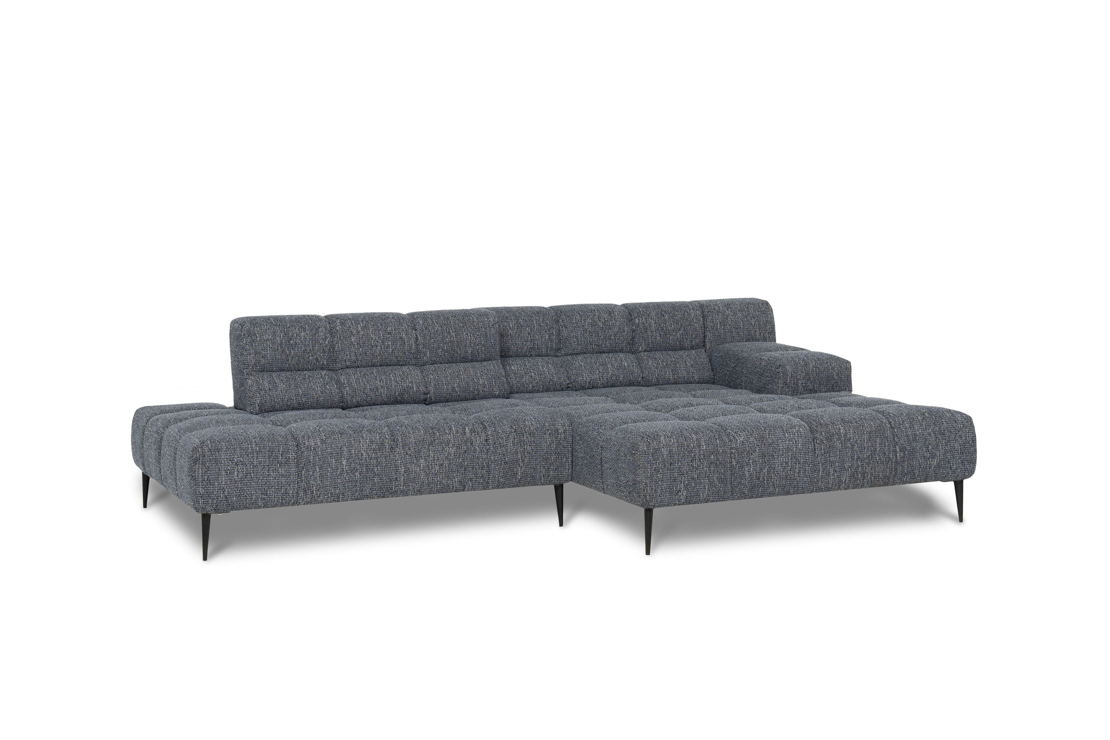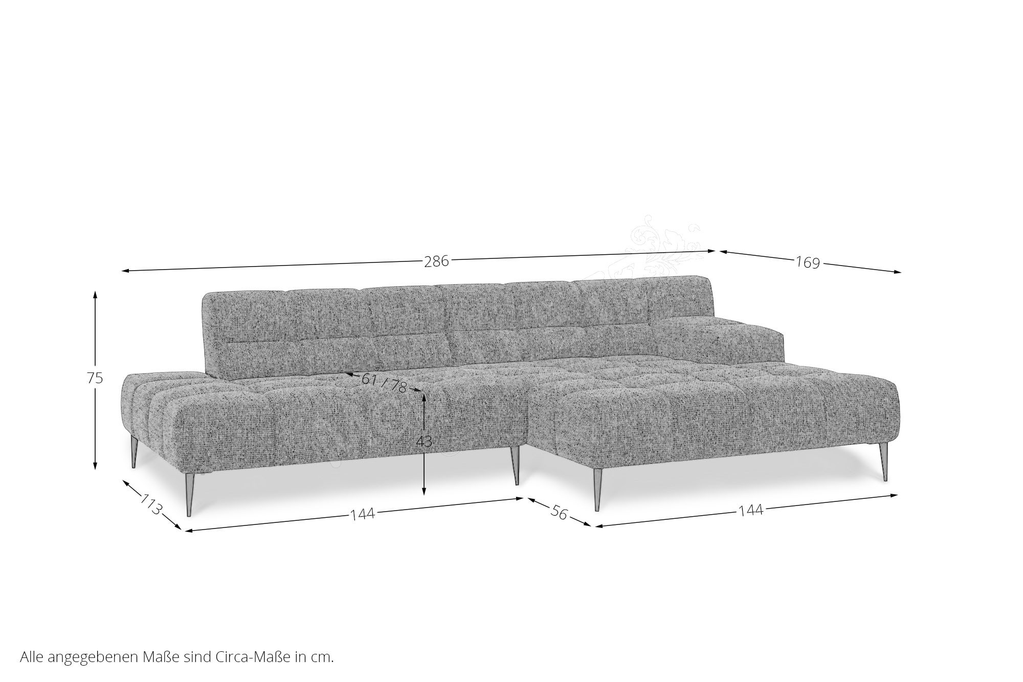 Sie wünschen sich eine Polstergarnitur, die modernes Design, hohen Sitzkomfort sowie großzügigen Platz vereint? Dann treffen Sie mit der designwerk Eckcouch Liam genau die richtige Wahl. Dieses stilvolle Sitzmöbel präsentiert sich in einer L-Form mit einem 2-Sitzer mit Abschlussteil und einer Recamiere - perfekt für entspannte Stunden mit Familie und Freunden. Mit einer Gesamtbreite von ca. 286 x 169 cm bietet die Garnitur reichlich Platz, um zur Ruhe zu kommen oder gesellige Abende zu genießen. Dank der hochwertigen Kaltschaumpolsterung auf Nosag-Stahlwellenfedern sitzt es sich jederzeit angenehm weich und stützend zugleich. Der Rücken ist ebenfalls mit Kaltschaum gepolstert, was für ein dauerhaft komfortables Sitzgefühl sorgt. Die manuelle Rückenverstellung im 2-Sitzer mit Abschlussteil bietet ein spürbares Plus an Komfort:-Ob gemütlich zurückgelehnt beim Filmabend oder aufrecht beim gespräch - Sie bestimmen selbst, wie Sie sitzen möchten. Diese Flexibilität macht das Ecksofa zu einem echten Lieblingsplatz für jede Lebenslage. Die Kombination aus klaren Linien, modernen Proportionen und einem eleganten Bezug aus Flachgewebe in dunkelgrauer Variante verleiht Ihrem Wohnzimmer eine zeitgemäße, behagliche Atmosphäre. Schwarze Metallbeine mit einer Höhe von ca. 17 cm runden das edle Erscheinungsbild gekonnt ab. Auf Wunsch lässt sich die Garnitur durch einen passenden Hocker ergänzen. Er fügt sich harmonisch ins Gesamtbild ein und bietet zusätzliche Bequemlichkeit - als Fußablage, Sitzgelegenheit oder kleine Ablagefläche. Liam von designwerk - ein Stück Wohnkultur, das Sie jeden Tag aufs Neue genießen werden.