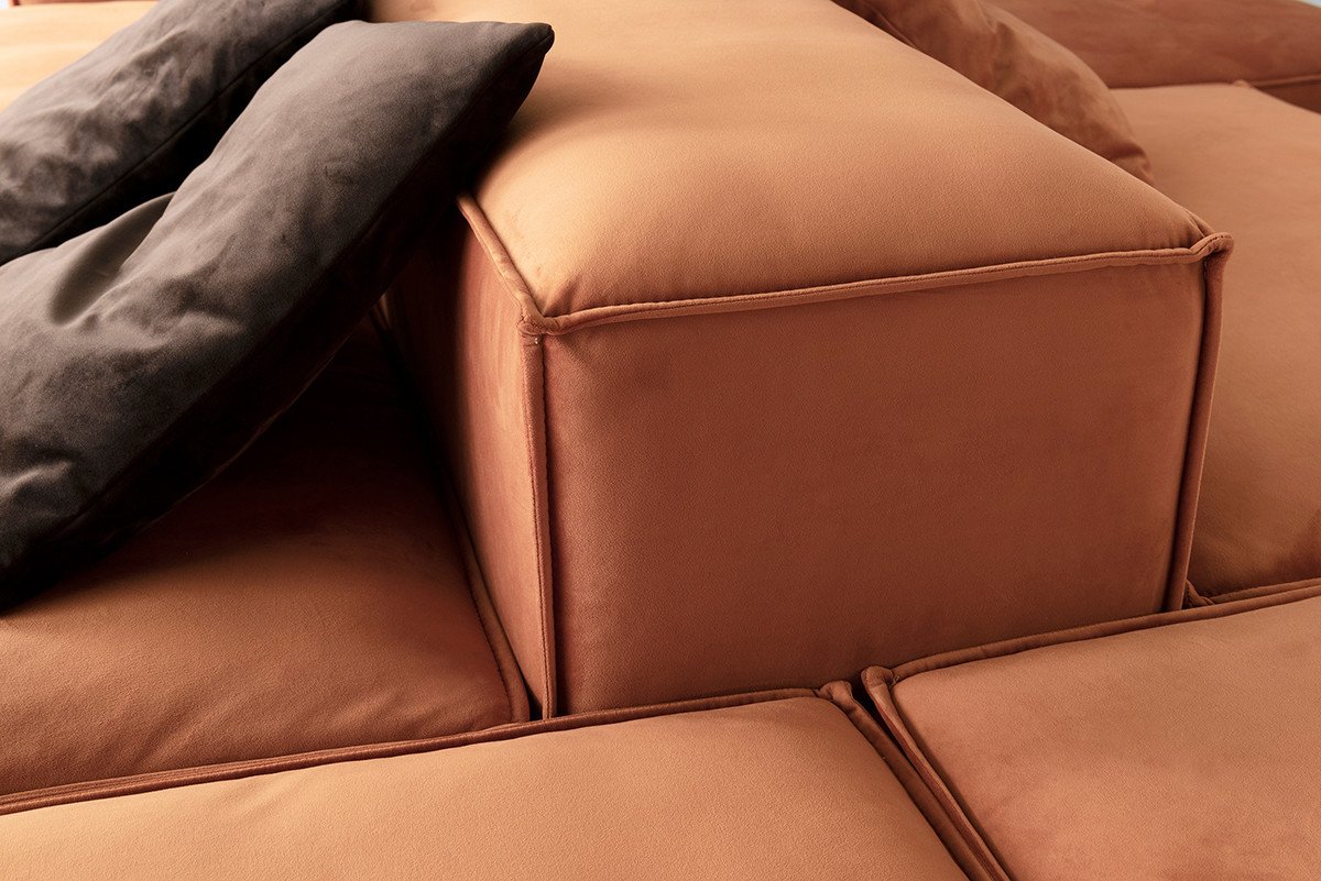 Das modulare Sofasystem Puzzle von designwerk steht für maximale Gestaltungsfreiheit und zeitlose Wohnarchitektur. Jedes Element - Sitzmodul, Rücken oder Armlehne - lässt sich in unserem Polsterplaner frei wählen und ganz nach Ihrem individuellen Geschmack kombinieren. So entsteht Schritt für Schritt genau das Sofa, das perfekt zu Ihrem Raum, Ihrem Stil sowie Ihrem Lebensgefühl passt. In der abgebildeten Variante zeigt sich Puzzle mit einem großzügigen Stellmaß von etwa 340 x 250 cm als echtes Loft-Statement. Die offene Form lädt dazu ein, das Polstersofa von beiden Seiten zu nutzen - ideal, um je nach Stimmung entweder den Ausblick aus großen Fenstern zu genießen oder sich zum Wohnraum und Fernseher auszurichten. Die vielseitigen Module können nahezu grenzenlos neu zusammengestellt, erweitert oder völlig anders interpretiert werden. Ob klare Linien, gemütliche Insel oder kommunikativer Wohnmittelpunkt: Puzzle wächst mit Ihren Ideen. Der vorausgewählte orangefarbene Veloursbezug verleiht dem Sofa eine warme Ausstrahlung und setzt in großzügigen Räumen ein selbstbewusstes Eyecatcher. Dabei fühlt sich der Bezug weich, einladend und hochwertig an - bestens für alle jene, die Komfort sowie Charakter miteinander verbinden möchten. Wahlweise stehen aber auch zahlreiche andere Stoffalternativen sowie edle Lederbezüge zur Verfügung. Ob dezent, robust, pflegeleicht oder luxuriös - jeder kann das Modell Puzzle genau in dem Bezug gestalten, das seinem persönlichen Stil und seinen Wohnanforderungen entspricht. designwerk verbindet hierbei hochwertige Materialien, präzise Verarbeitung sowie ein modernes, urbanes Design - für eine Polstergarnitur, die nicht nur ein Möbelstück ist, sondern ein flexibler Lebensraum.
