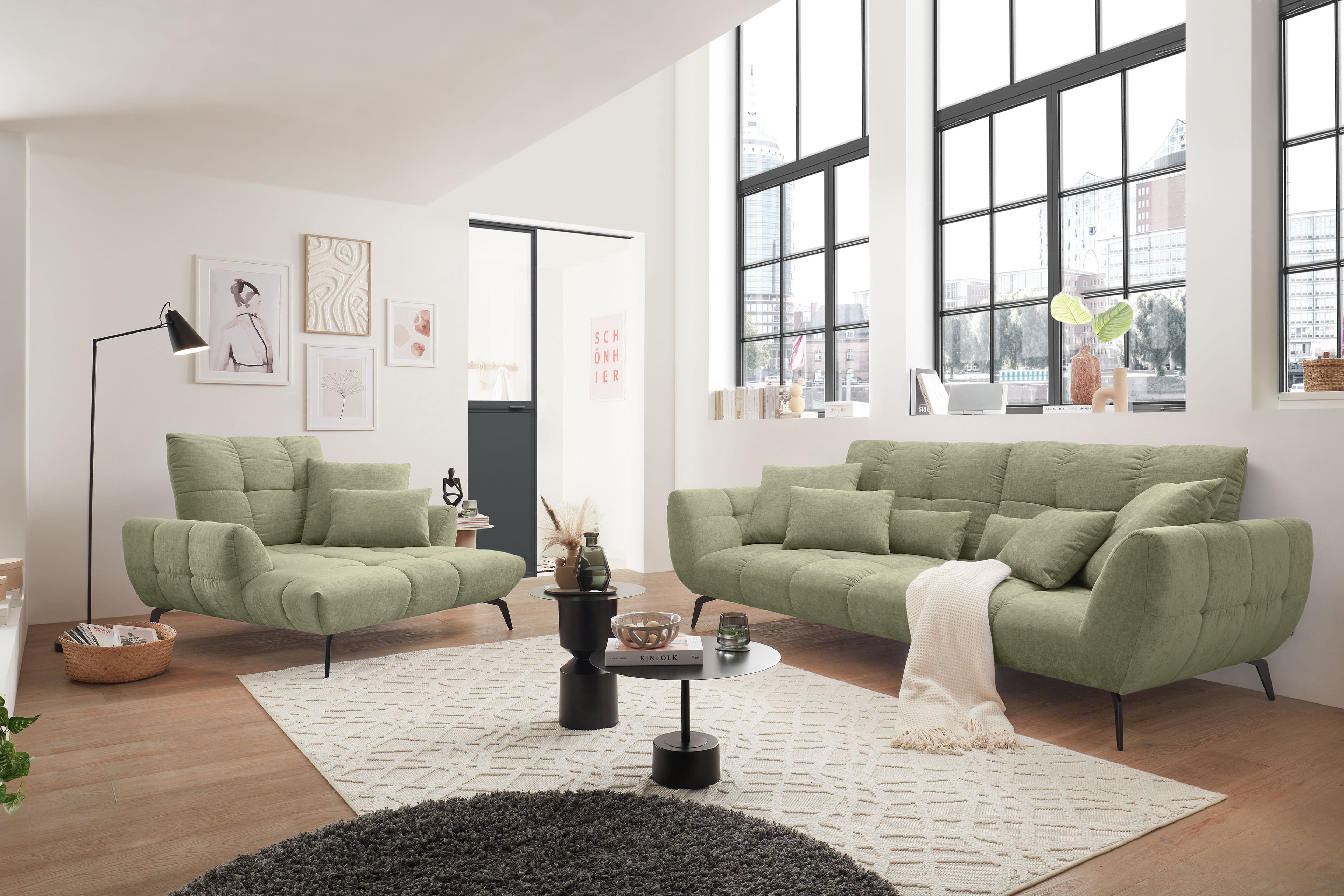 Das Megasofa Malibu-LE26 von set one by Musterring bringt mit seinem ausdrucksstarken Farbnuance in Hellgrün Lebendigkeit sowie Eleganz in Ihr Wohnambiente. Die frische Farbnuance verleiht dem Raum eine behagliche Ausstrahlung und schafft ein harmonisches Zusammenspiel aus Modernität sowie Gemütlichkeit. So entsteht ein Ort, der gleichermaßen Ruhe spendet und darüber hinaus auch wunderbar zum längeren Verweilen einlädt. Das hochwertige Chenille-Flachgewebe überzeugt nicht nur optisch, sondern fühlt sich auch angenehm weich an. Die bequeme Polsterung sorgt für ein entspanntes Sitz- sowie Liegegefühl - perfekt für gemütliche Abende, ruhige Stunden mit einem guten Buch in der Hand oder gesellige Runden mit der Familie. Die großzügige Sitzfläche mit einer Breite von ca. 260 cm bietet Ihnen ausreichend Platz zum Zurücklehnen, Wohlfühlen oder einfach zum Abschalten vom Alltag. Durch flexible Funktionen, die Sie optional hinzubuchen können, lässt sich das Polstersofa individuell anpassen und bietet Ihnen so maximalen Komfort in jeder Situation. So kann beispielsweise eine verstellbare Sitztiefenverstellung oder eine Rückenneigungsfunktion für zusätzlichen Sitzkomfort sorgen und aus dem Einzelsofa wird im Handumdrehen ihr persönlicher Rückzugsort. Das moderne Design wird durch den extravaganten Farbton stilvoll ergänzt und setzt gezielte Akzente im Raum, ohne sich in den Vordergrund zu drängen. So fügt sich das Megasofa mühelos in verschiedene Einrichtungsstile ein - von modern bis gemütlich-elegant. Wahlweise lässt sich der 2-Sitzer mit einem stilvollen Loveseat, einem praktischen Hocker sowie passenden Zierkissen ergänzen, um das Wohnkonzept perfekt abzurunden. Ein Bigsofa, das Design, Komfort sowie Wohnlichkeit auf harmonische Weise verbindet und Ihrem Zuhause eine besondere Note verleiht - das set one by Musterring Sofa Malibu-LE26.