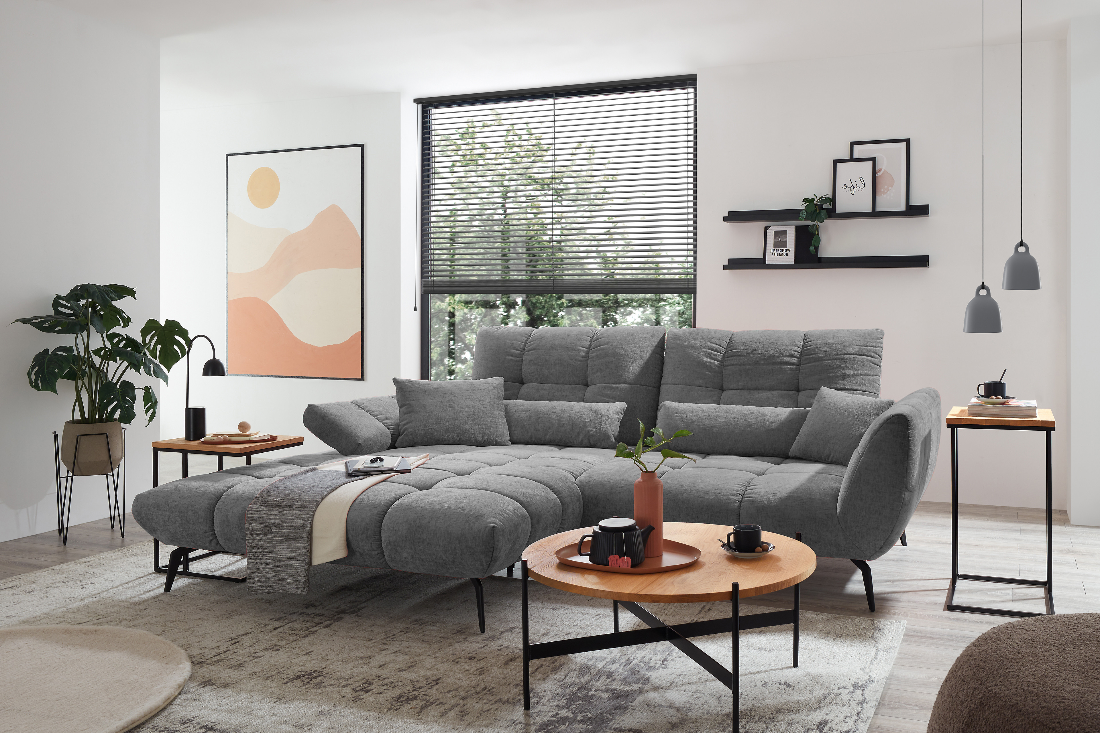 Modernes Design trifft auf einladende Großzügigkeit – so zeigt sich die Sofaecke namens Malibu-LE26 von set one by Musterring und wird so zum zentralen Blickfang in Ihrem Wohnzimmer. Das anschmiegsame Chenille-Flachgewebe im edlen Grauton verleiht dem Möbelstück eine zeitlose Ausstrahlung und bringt Eleganz in jeden Raum, während die fein gesteppte Polsterung von Sitz und Rücken für eine ausdrucksstarke, ästhetische Optik sorgt. So entsteht ein Wohngefühl, das gleichermaßen stilvoll wie auch entspannt wirkt. Auf einem Stellmaß von ca. 191 x 273 cm bietet Ihnen das Ecksofa reichlich Platz zum Zurücklehnen, Ausstrecken und Genießen. Die angenehm abgestimmte Polsterung sorgt dabei für ein komfortables Sitzgefühl, das sowohl im Alltag als auch bei besonderen Momenten überzeugt. Hochwertige Materialien und eine sorgfältige Verarbeitung garantieren Langlebigkeit sowie ein dauerhaft schönes Erscheinungsbild. Dank durchdachter Funktionen lässt sich die Polstergarnitur flexibel an Ihre individuellen Bedürfnisse anpassen. Neben der integrierten Sitztiefenverstellung steht Ihnen auf Wunsch auch eine Rückenneigungsverstellung zur Verfügung. Aus zwei unterschiedlichen Armteilausführungen, wobei die Variante Typ A sogar mit Rasterbeschlag gewählt werden kann, mit der sich der Neigungswinkel flexibel regulieren lässt, wählen Sie Ihren bevorzugten Favoriten. Schaffen Sie mit den Zusatzfunktionen ein Höchstmaß an Komfort – vom aufrechten Sitzen bis zum entspannten Liegen – das set one by Musterring Sofa passt sich so jeder Situation mühelos an. Passend zur Polsterecke bietet die Serie als Ergänzung einen Hocker und auch Zier- sowie Nierenkissen sind erhältlich, um das Wohnkonzept stimmig zu vervollständigen. Mit seiner attraktiven Farbgebung verleiht Malibu-LE26 dem Raum eine wohnliche und einladende Atmosphäre. Alternativ stehen über die Zusatzoptionen weitere Farben sowie Bezugsstoffe zur Auswahl. Warten Sie nicht länger, erfüllen Sie sich Ihren Wohntraum und genießen Sie jeden Moment auf dem Sofa, das Komfort sowie Stil perfekt vereint.