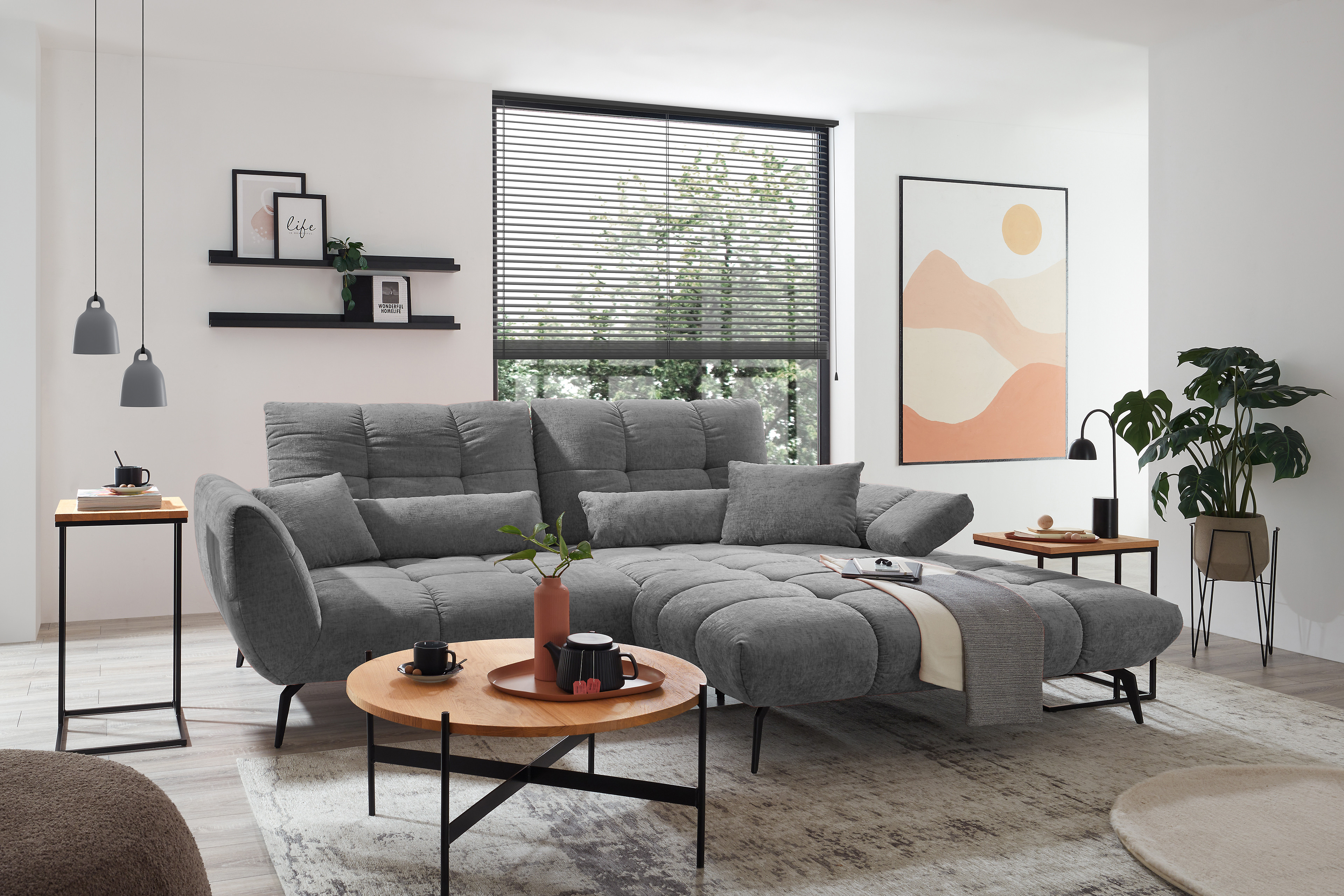 Modernes Design trifft auf einladende Großzügigkeit – so zeigt sich die Sofaecke namens Malibu-LE26 von set one by Musterring und wird so zum zentralen Blickfang in Ihrem Wohnzimmer. Das anschmiegsame Chenille-Flachgewebe im edlen Grauton verleiht dem Möbelstück eine zeitlose Ausstrahlung und bringt Eleganz in jeden Raum, während die fein gesteppte Polsterung von Sitz und Rücken für eine ausdrucksstarke, ästhetische Optik sorgt. So entsteht ein Wohngefühl, das gleichermaßen stilvoll wie auch entspannt wirkt. Auf einem Stellmaß von ca. 273 x 191 cm bietet Ihnen das Ecksofa reichlich Platz zum Zurücklehnen, Ausstrecken und Genießen. Die angenehm abgestimmte Polsterung sorgt dabei für ein komfortables Sitzgefühl, das sowohl im Alltag als auch bei besonderen Momenten überzeugt. Hochwertige Materialien und eine sorgfältige Verarbeitung garantieren Langlebigkeit sowie ein dauerhaft schönes Erscheinungsbild. Dank durchdachter Funktionen lässt sich die Polstergarnitur flexibel an Ihre individuellen Bedürfnisse anpassen. Neben der integrierten Sitztiefenverstellung steht Ihnen auf Wunsch auch eine Rückenneigungsverstellung zur Verfügung. Aus zwei unterschiedlichen Armteilausführungen, wobei die Variante Typ A sogar mit Rasterbeschlag gewählt werden kann, mit der sich der Neigungswinkel flexibel regulieren lässt, wählen Sie Ihren bevorzugten Favoriten. Schaffen Sie mit den Zusatzfunktionen ein Höchstmaß an Komfort – vom aufrechten Sitzen bis zum entspannten Liegen – das set one by Musterring Sofa passt sich so jeder Situation mühelos an. Passend zur Polsterecke bietet die Serie als Ergänzung einen Hocker und auch Zier- sowie Nierenkissen sind erhältlich, um das Wohnkonzept stimmig zu vervollständigen. Mit seiner attraktiven Farbgebung verleiht Malibu-LE26 dem Raum eine wohnliche und einladende Atmosphäre. Alternativ stehen über die Zusatzoptionen weitere Farben sowie Bezugsstoffe zur Auswahl. Warten Sie nicht länger, erfüllen Sie sich Ihren Wohntraum und genießen Sie jeden Moment auf dem Sofa, das Komfort sowie Stil perfekt vereint.