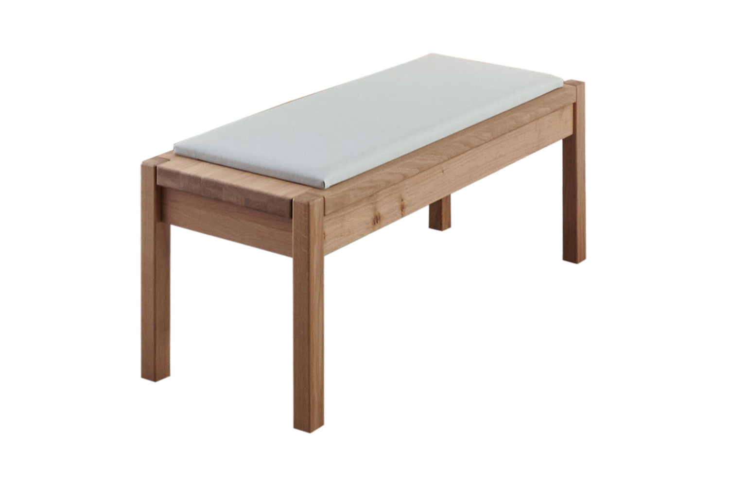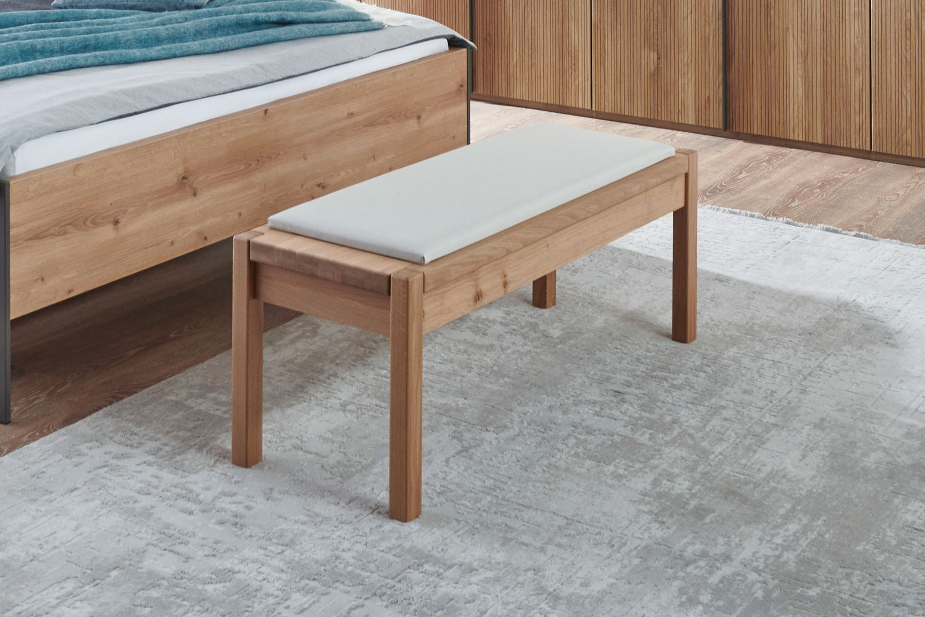 Die etwa 120 x 47 x 40 cm große Bank aus der Schlafzimmer-Serie Valetta von Wiemann wurde aus einem Massivholz-Gestell in der Ausführung Eiche bianco und einem bequemen, champagnerfarbenen Kunstleder-Polster zusammengesetzt. Sie ist optimal als Sitzgelegenheit oder Ablagemöglichkeit an einem Bett, in einem Ankleidezimmer oder auch im Flurbereich geeignet. Ergänzende Möbel aus dem Schlafraum-Programm Valetta stellen wir Ihnen im modelleigenen Typenplan unter Downloads vor. Wenn Sie sich ein komplettes Wiemann Schlafzimmer planen lassen möchten oder sich für ein anderes Element dieser Möbel-Serie interessieren, können Sie sich gern an unsere kompetenten Einrichtungsexperten wenden, die Sie telefonisch, via Kontaktformular oder über unseren Live-Chat erreichen.