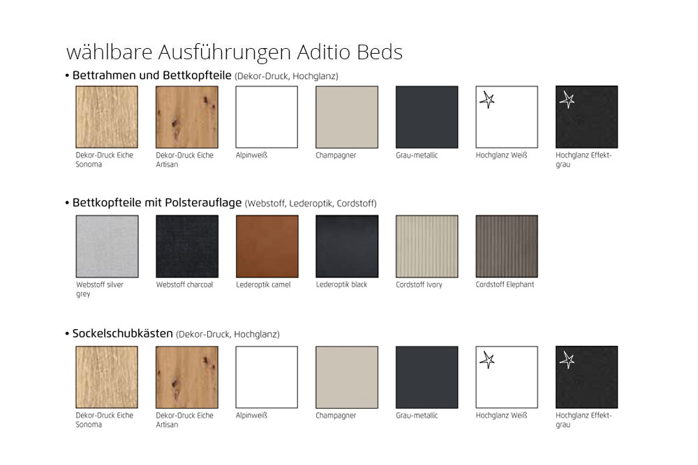 - Bett: bestehend aus Bettrahmen, Sockelschubkasten-Set und Kopfteil-Variante 3 (Polster-Kopfteil mit Rahmenoptik)