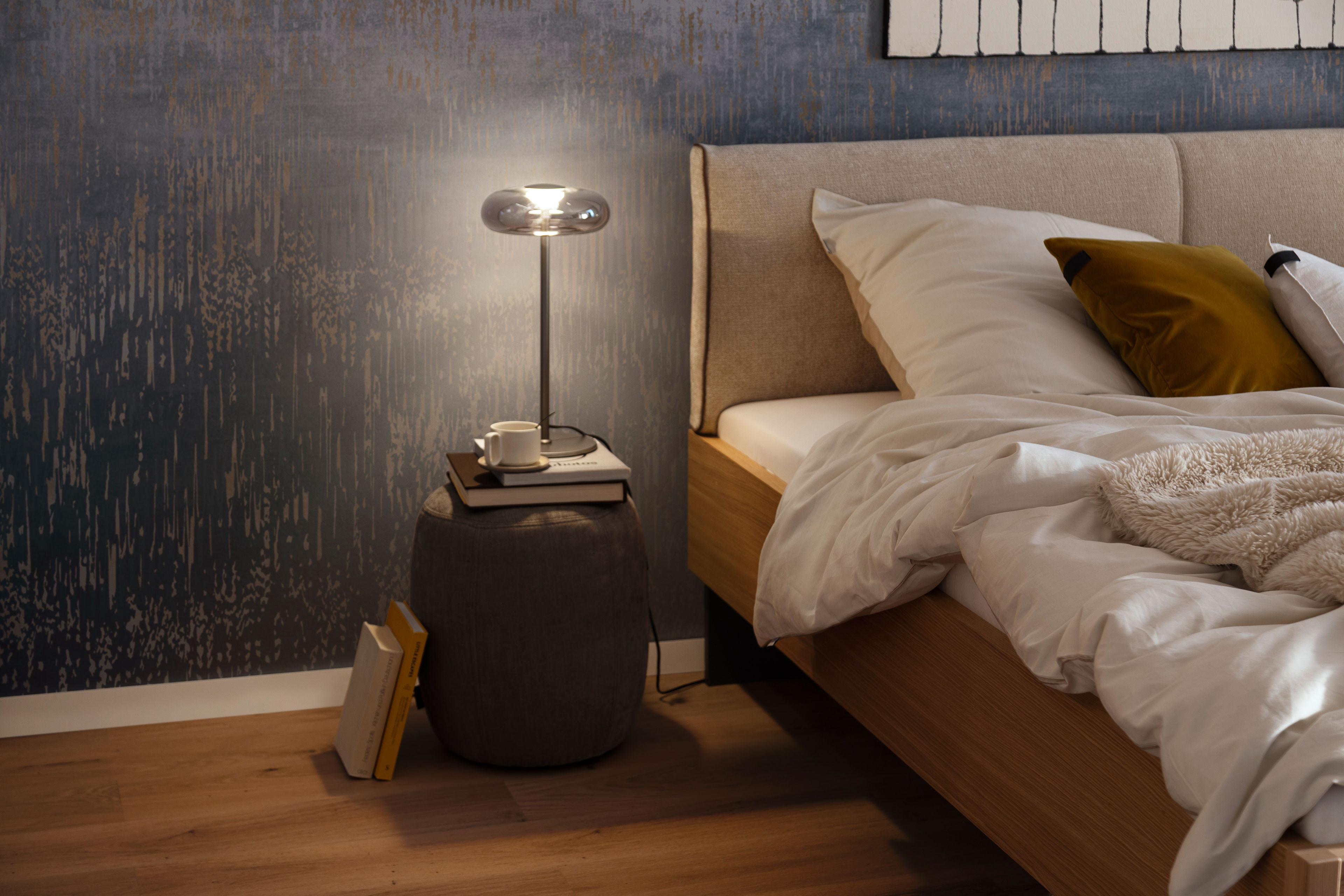 Ein hochwertiger Bettrahmen aus einem ressourcenschonenden Eichenfurnier verleiht dem Bett der Schlafzimmerserie Arola aus der Schöner Wohnen Kollektion sein natürlich warmes Aussehen. Die Massivholz-Bettfüße sorgen für Stabilität und unterstreichen das Designkonzept. Mit dem kissenartigen Polsterkopfteil, das sich in einem cremefarbenen Webstoff-Bezug mit einem feinen braunen Keder zeigt, bietet der Arola Schlafplatz den gewünschten Anlehnkomfort, wenn Sie beispielsweise gern im Bett sitzend lesen. Über die angebotenen Zusatzoptionen können Sie aus zwei Doppelbett-Liegeflächengrößen wählen. Die zum favorisierten Maß passenden Lattenroste und Matratzen bieten wir Ihnen im Möbel Letz Online-Shop in der Kategorie Bettzubehör zum Zukauf an. Sie möchten das Komfortbett gleich mit Nachttischen, einer Kommode und einem Kleiderschrank aus dem Arola Programm ergänzen oder sich einen Überblick über die komplette Schlafzimmer-Serie verschaffen? Im modelleigenen Möbelkonfigurator können Sie Ihre individuelle Bestellung frei planen.