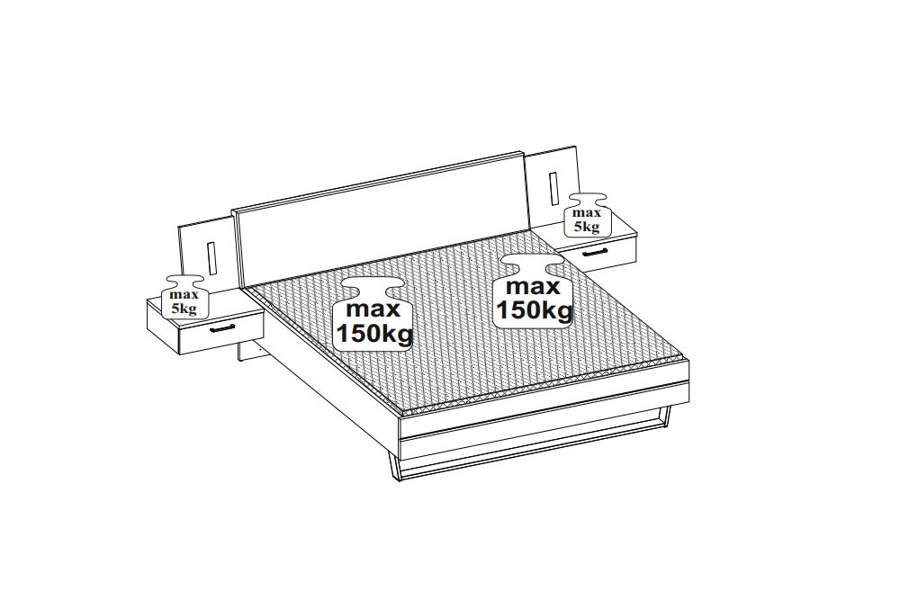 - Nachtkonsolen-Oberboden je maximal belastbar bis 5 kg, Nachtkonsolen-Schubladen je maximal belastbar bis 2 kg, Liegefläche je Bettseite maximal belastbar bis 150 kg