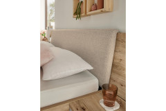 - Bettanlage: Liegefläche 180 x 200 cm, Bettseitenhöhe ca. 46 cm, inklusive 2 Nachtkommoden, Kopfteil gepolstert (Bezug: beige, Flachgewebe, 100 % Polyester), Nachtkonsolen-Paneele inklusive Beleuchtung Inline Energieeffizienzklasse E, 2 x Nachtkommode mit je 1 Schubkasten BHT je ca. 55/19/42 cm, inklusive Längstraverse